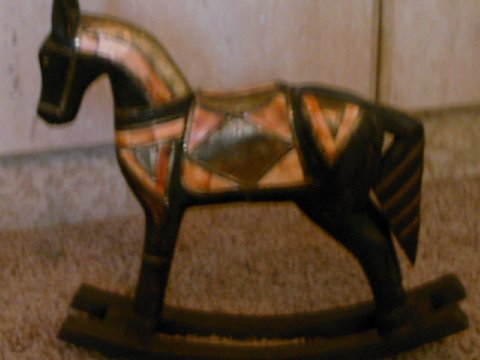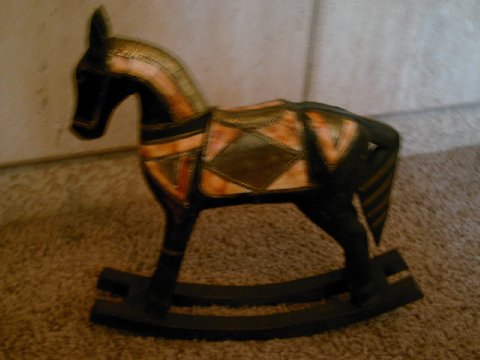 its handcraved, saddle and reins have detailed work of brass and an off white stone of some kind, the wood appears to be blackish in stain. If anyone is interested contact me: [email protected] or call (863) 808-8425