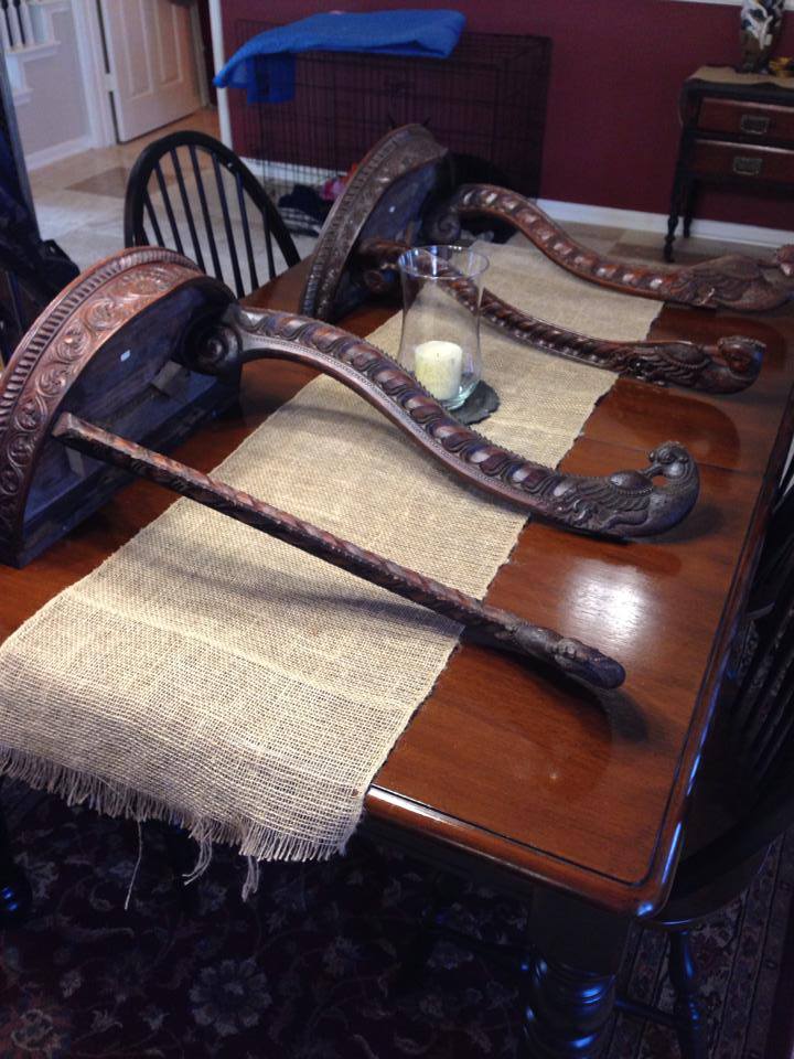 Wall mount tables with bird carvings. Each is about 20.5" wide, 12.25" deep and 30.5" high. The bird carvings on each table is different than the other. Also, the wood skirt around the tables varies slightly on each. Each has the same signature of "J.A. Cumming". The following was found describing him http://www.facebook.com/l.php?u=http%3A%2F%2Fcampaignfurniture.com%2Fexhpdfs%2FCC2013%2520vAWa.pdf&h=HAQH6j-cG