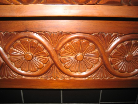 This fireplace surround is hand carved wood and in mint condition. I was told it's from Europe and was found in an estate somewhere in NJ/NY vicinity. I am unsure of the wood species although I think it may be Cherry. I have used this surround only for decorative purposes and added a removable center piece of black tile to give it a "finished" look. The tile is glued to a masonite board which is delicately tacked onto the surround from behind and has not damaged or marred the surround at all. It is easily removable if unwanted.
