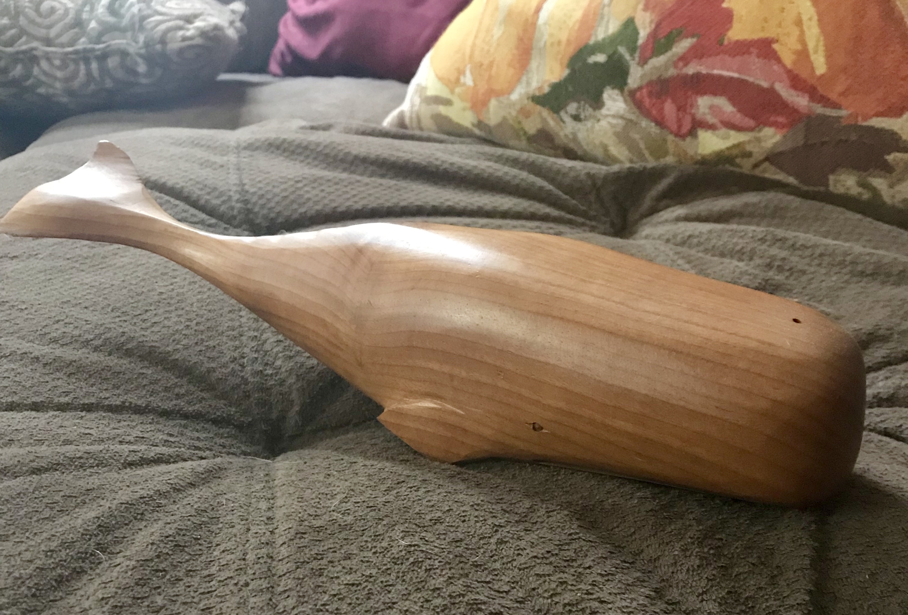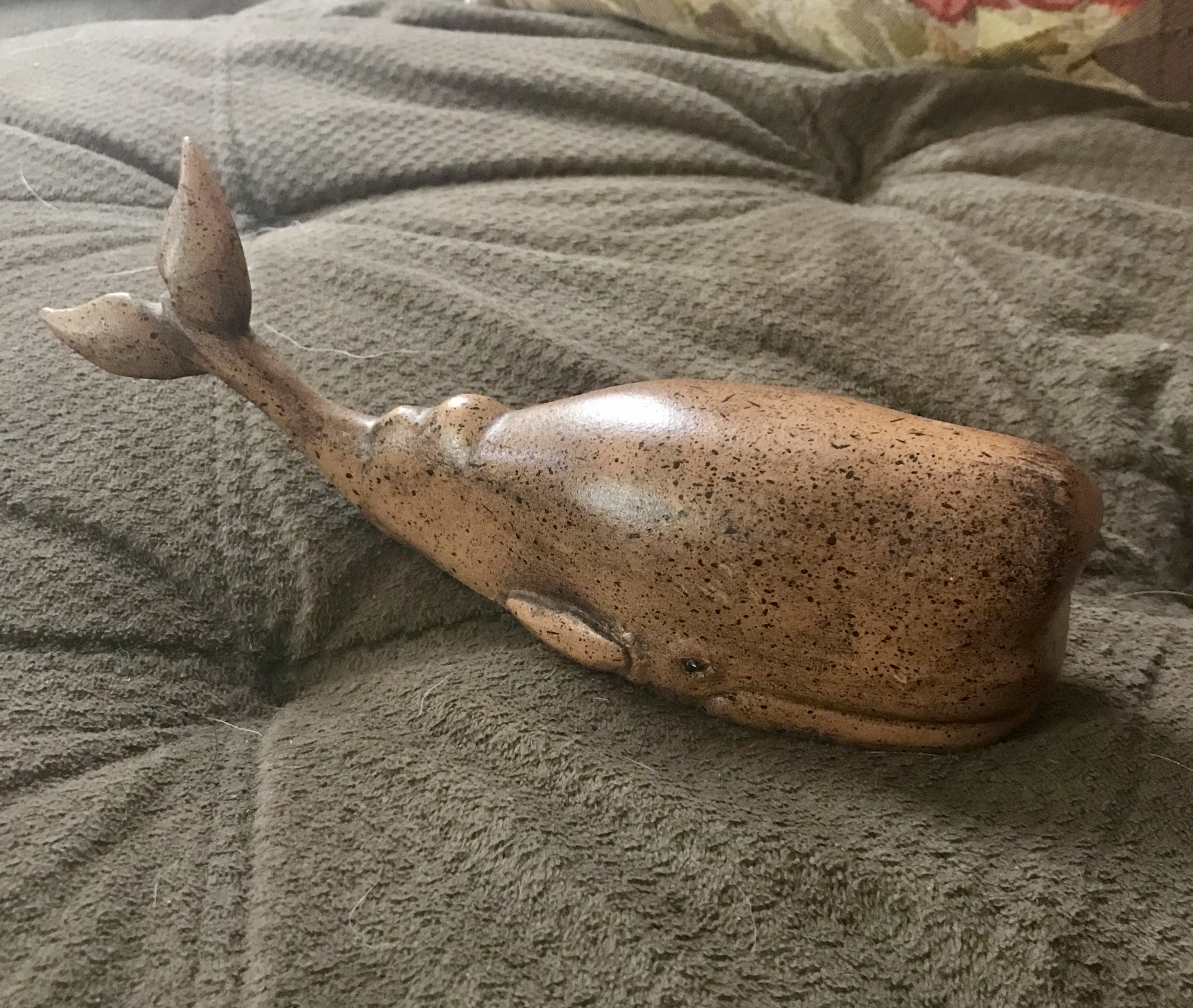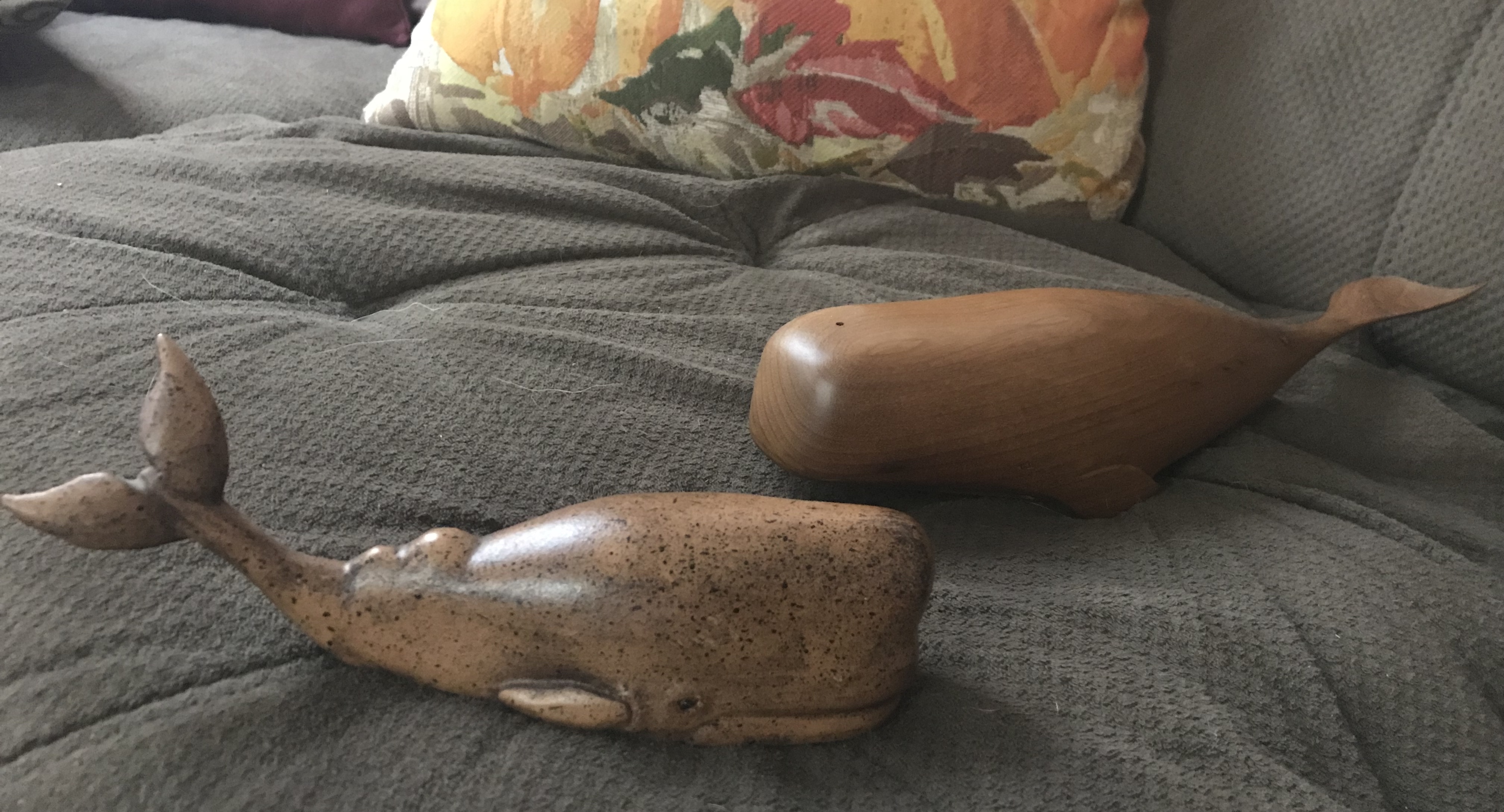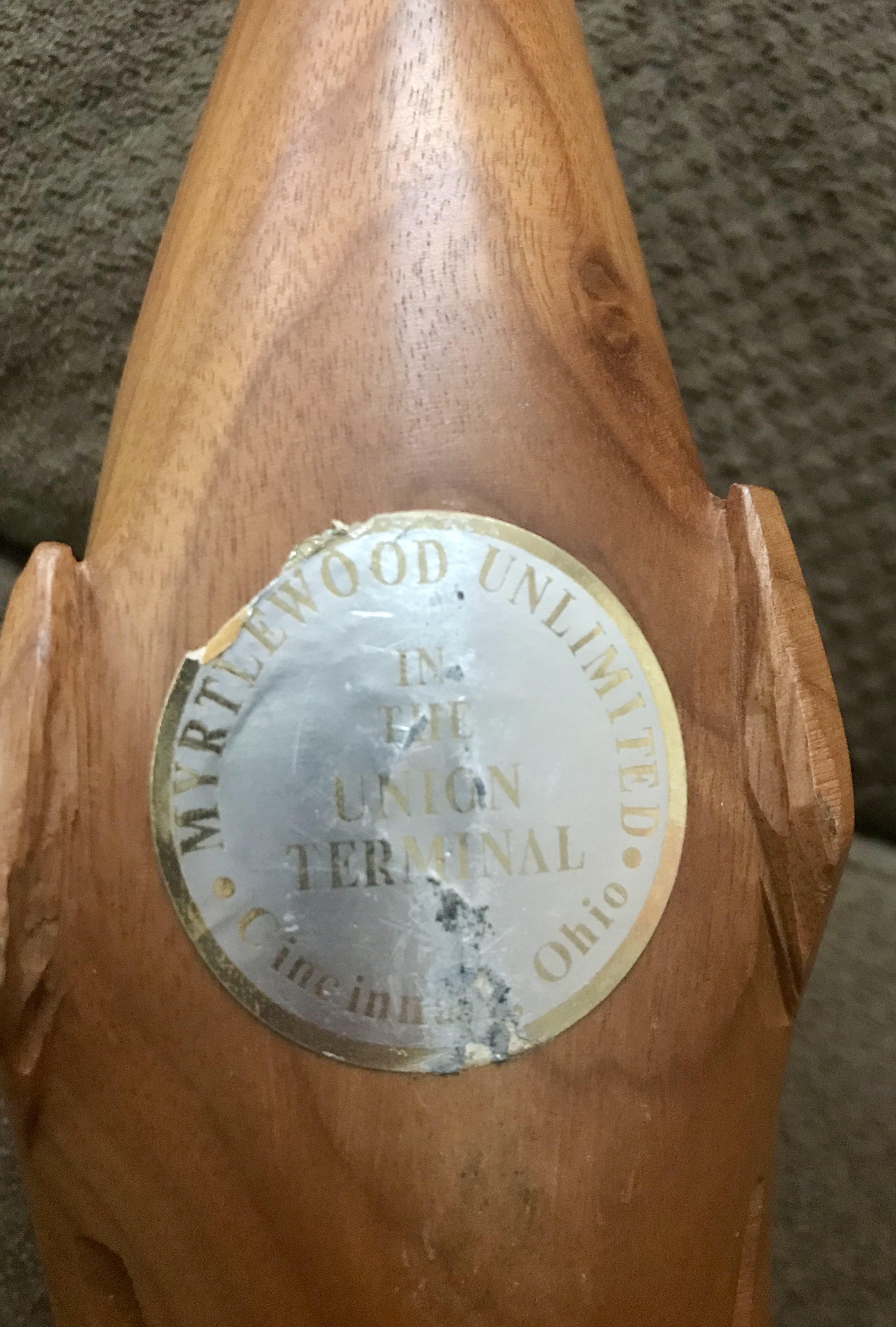 I was gifted two wooden whales from my Gramma. One of them has a sticker on the bottom that says, “MyrtleWood Unlimited In the Union Terminal Cincinnati, Ohio.” The bigger whale is 12 inches and is the one with the sticker. The smaller whale is 8 inches and does not have a sticker. I have no clue if they were bought together.
