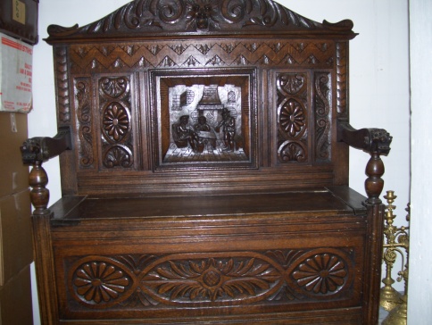 It appears to be hand carved designs and hand made. It has slots and pegs for construction. Very sturdy The slightly rounded sides are some sort of plywood or something similiar.