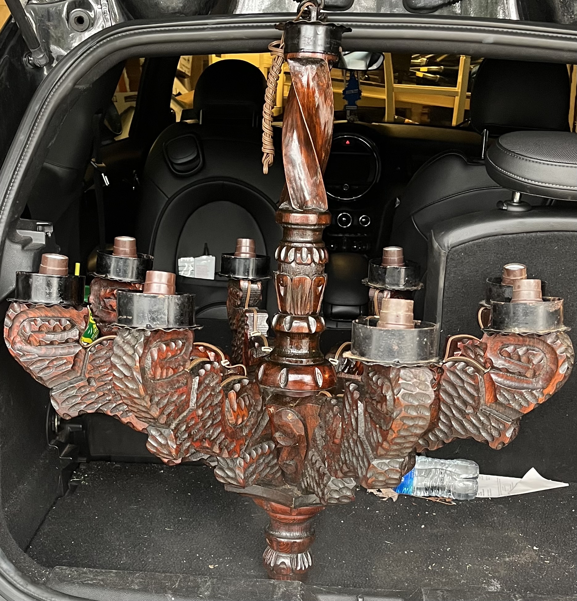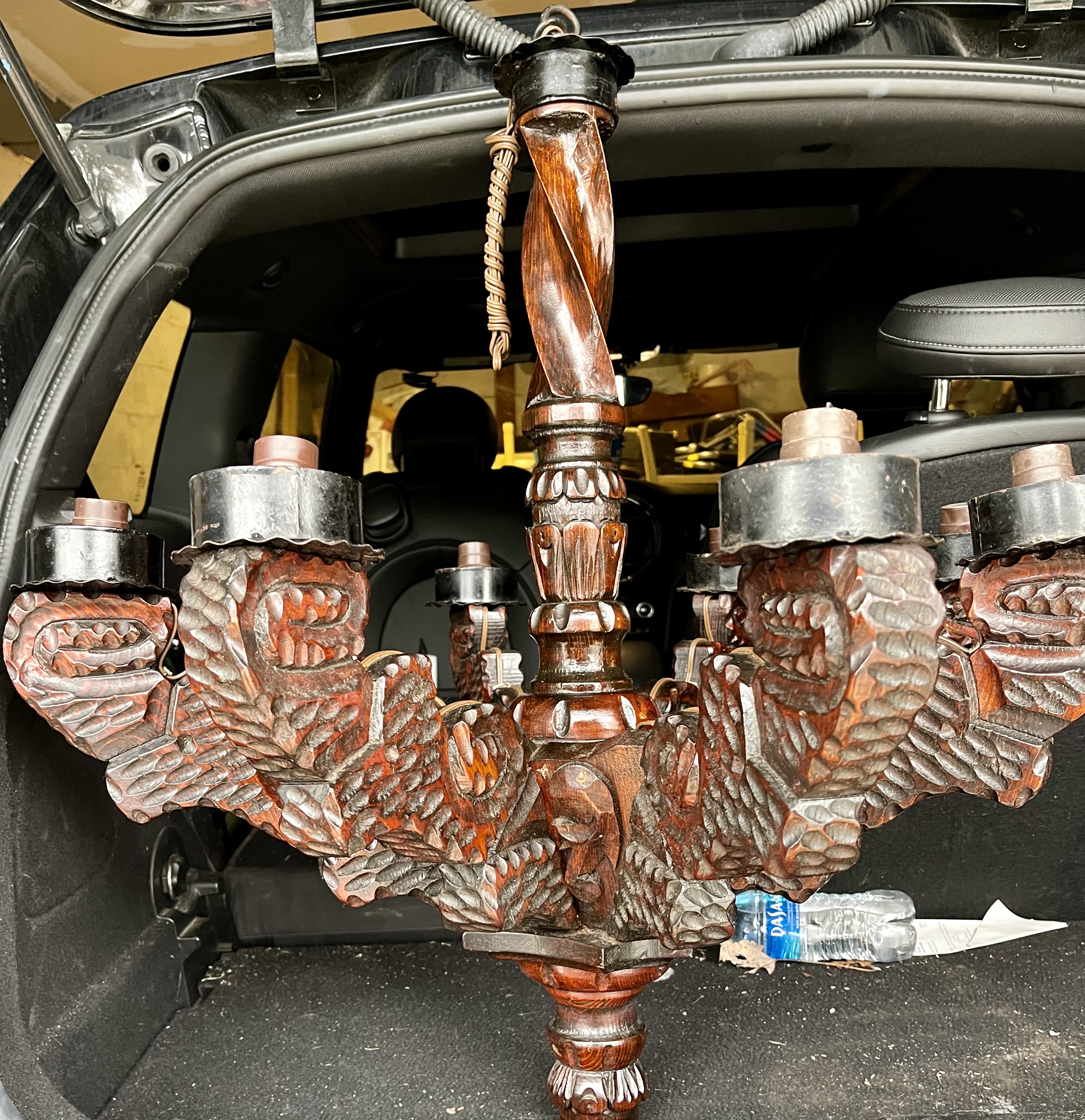 8 arm, hand carved wooden chandelier