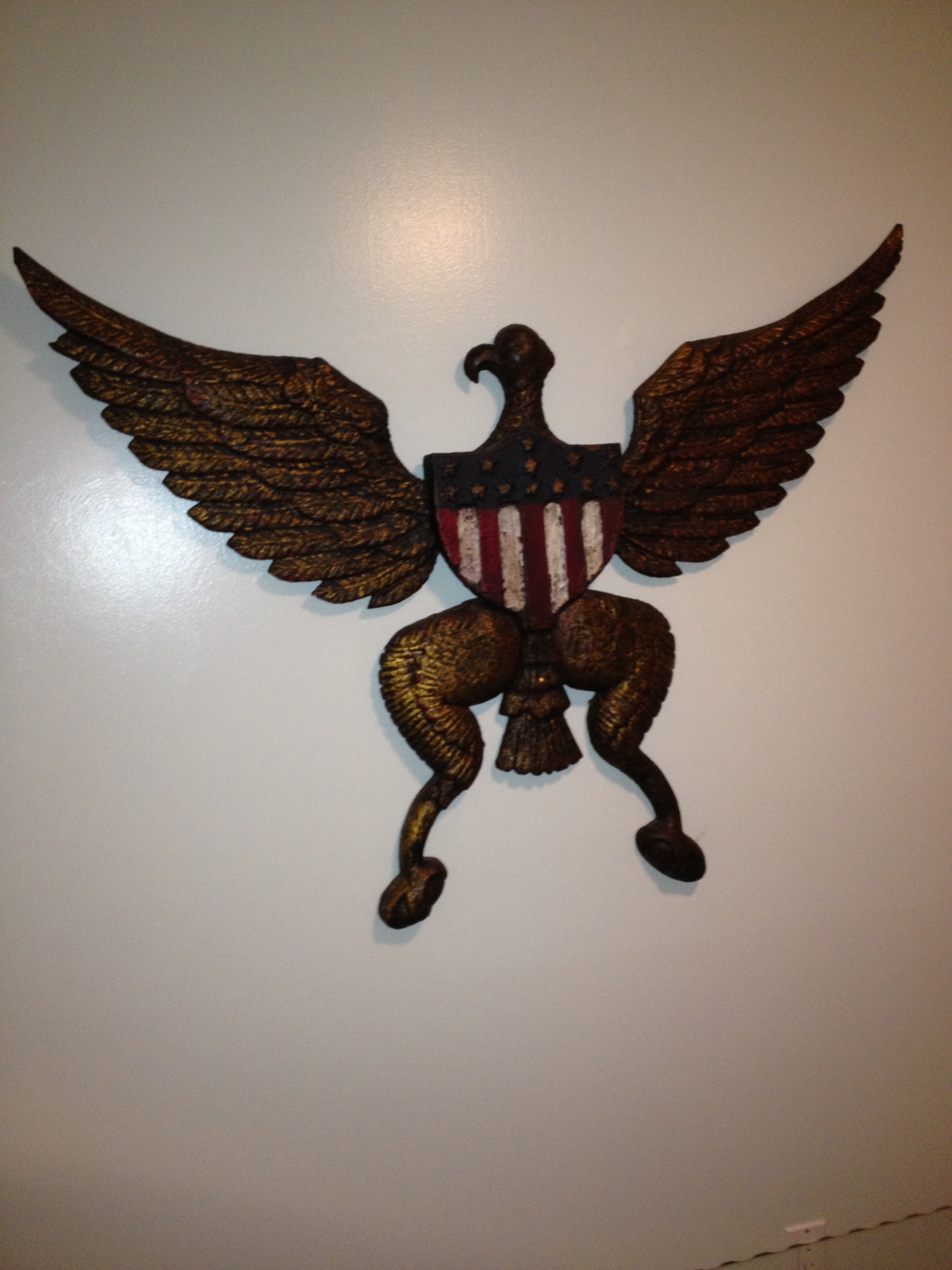 Hand carved wooden eagle from the centenial era . 13 stars on shield , could possibly be from the original 13 colonies . 4 ft. wing span , 3 1/2 ft. long , very good condition . Great detail , was bought privatly before it went to auction in Palm Beach Florida .
