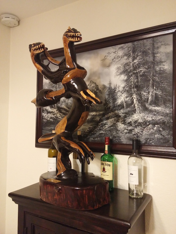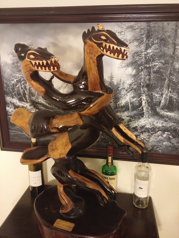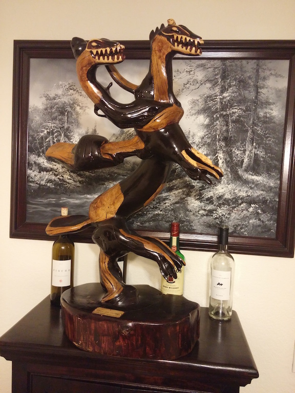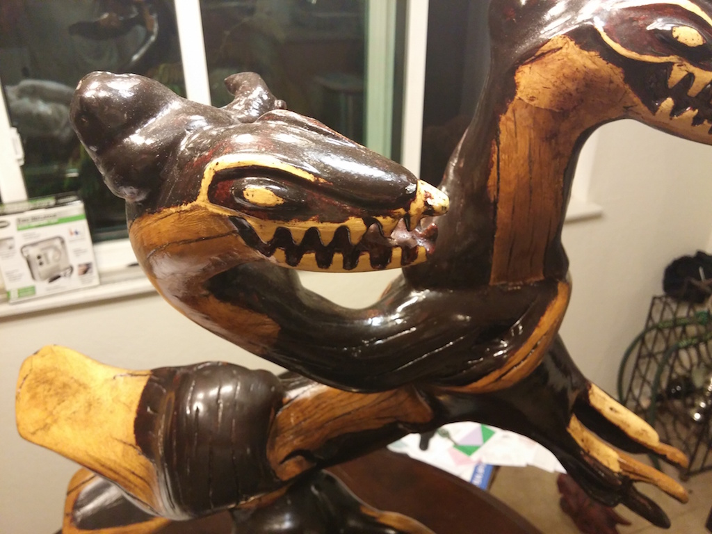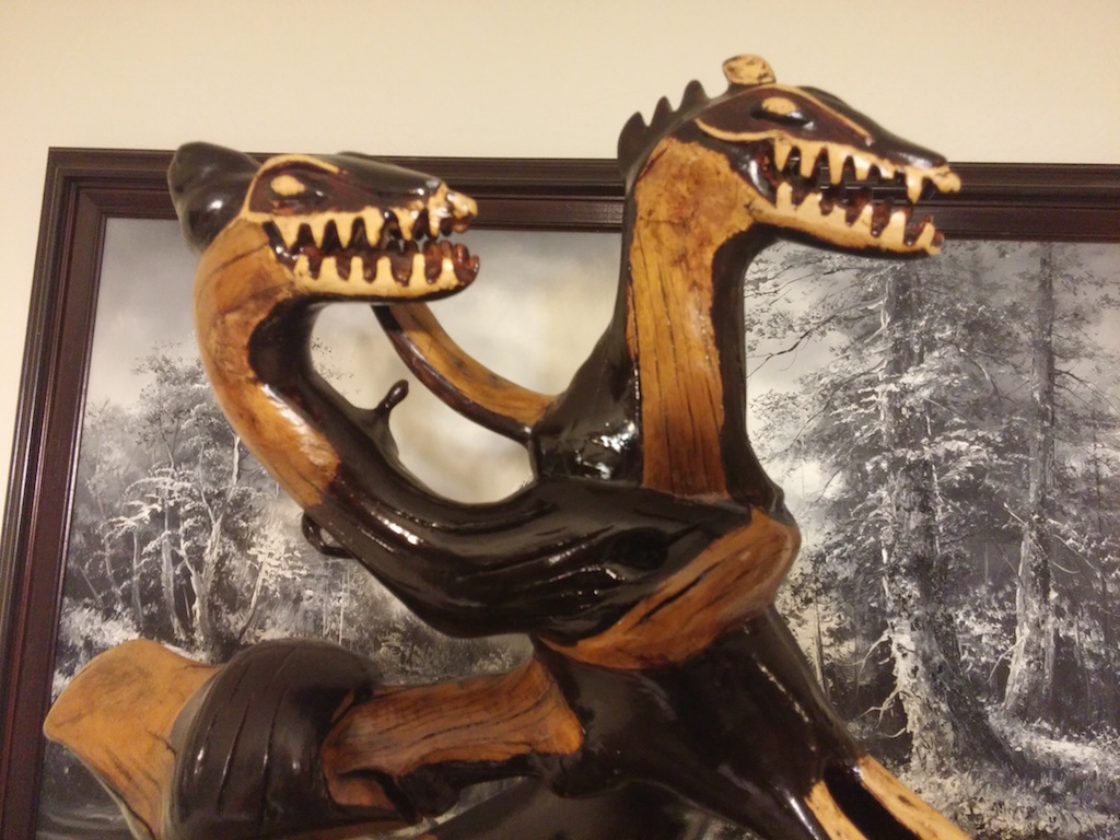 The item appears to be a hand carved and hard wood sulpture of a two headed dragon. I am not sure what type of wood the item is (possibly some kind of pine), but it is carved from one single piece of wood. It weighs approximately 40lbs and has a glossy laqued coat. It stands approximately 3 feet tall.  I would apprecaiate a ball park appraisal.