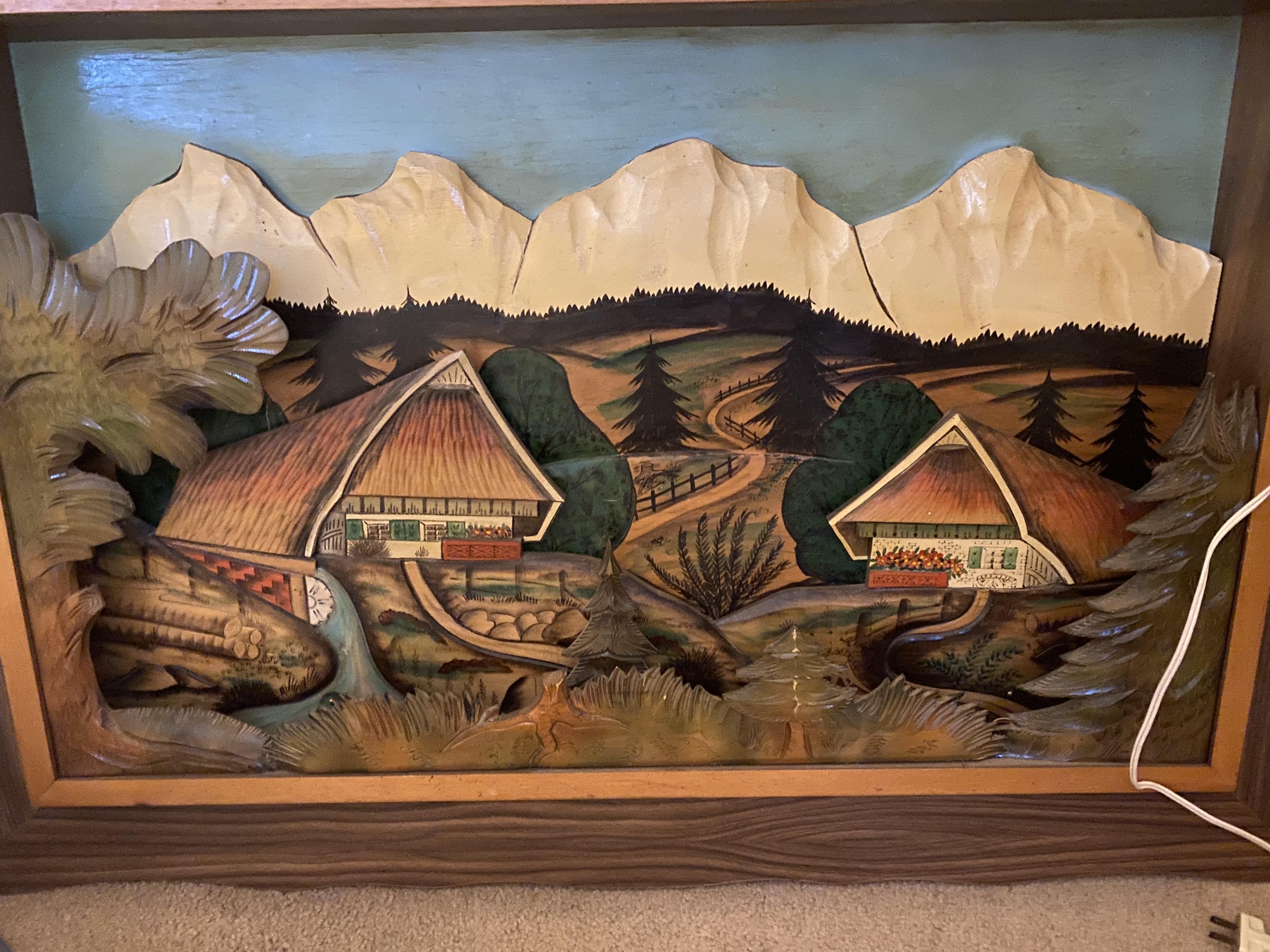 Hand carved by German in 1970. Paid over 100 back then. Tree in front pushes back to turn light on. All wood