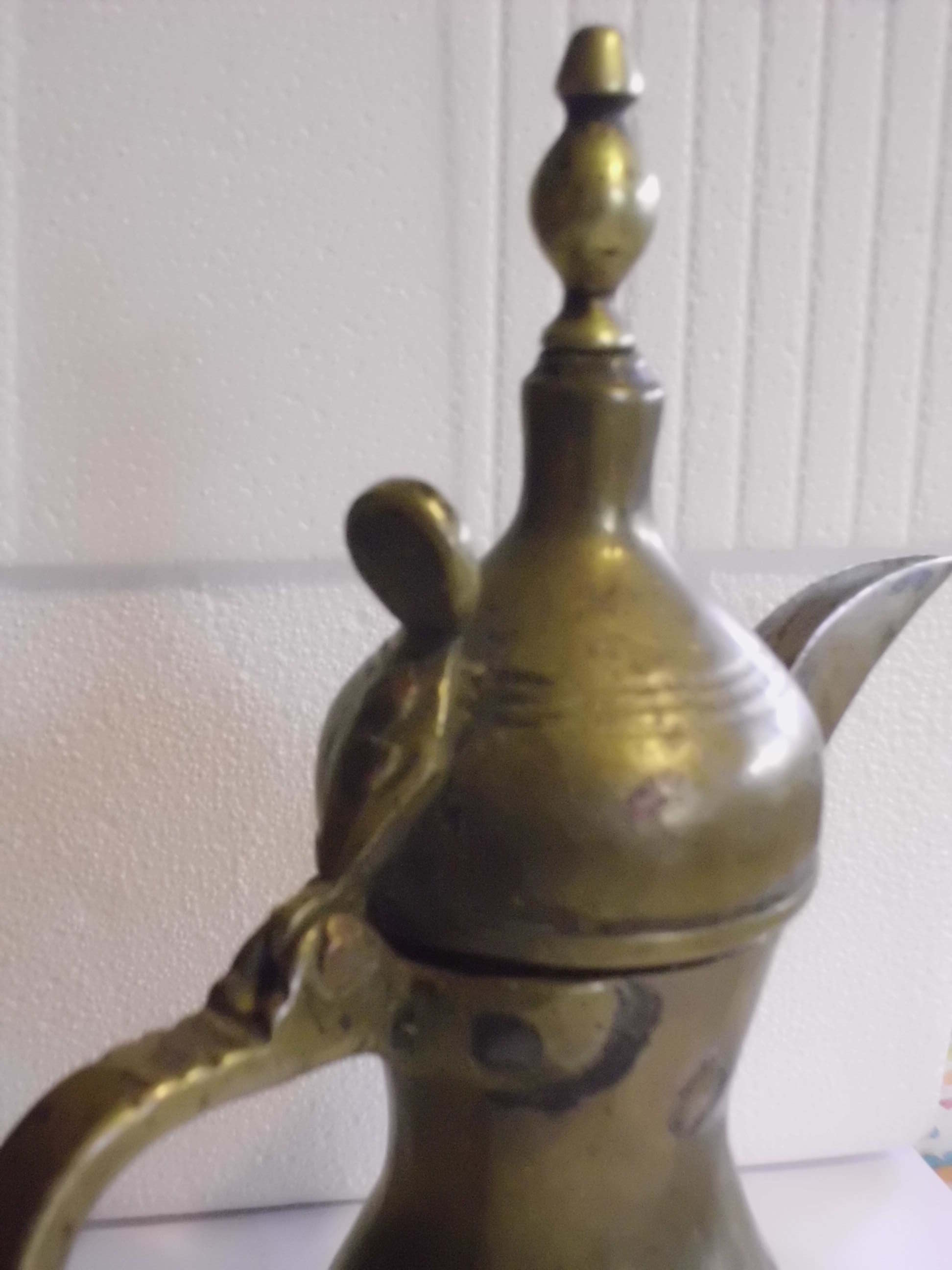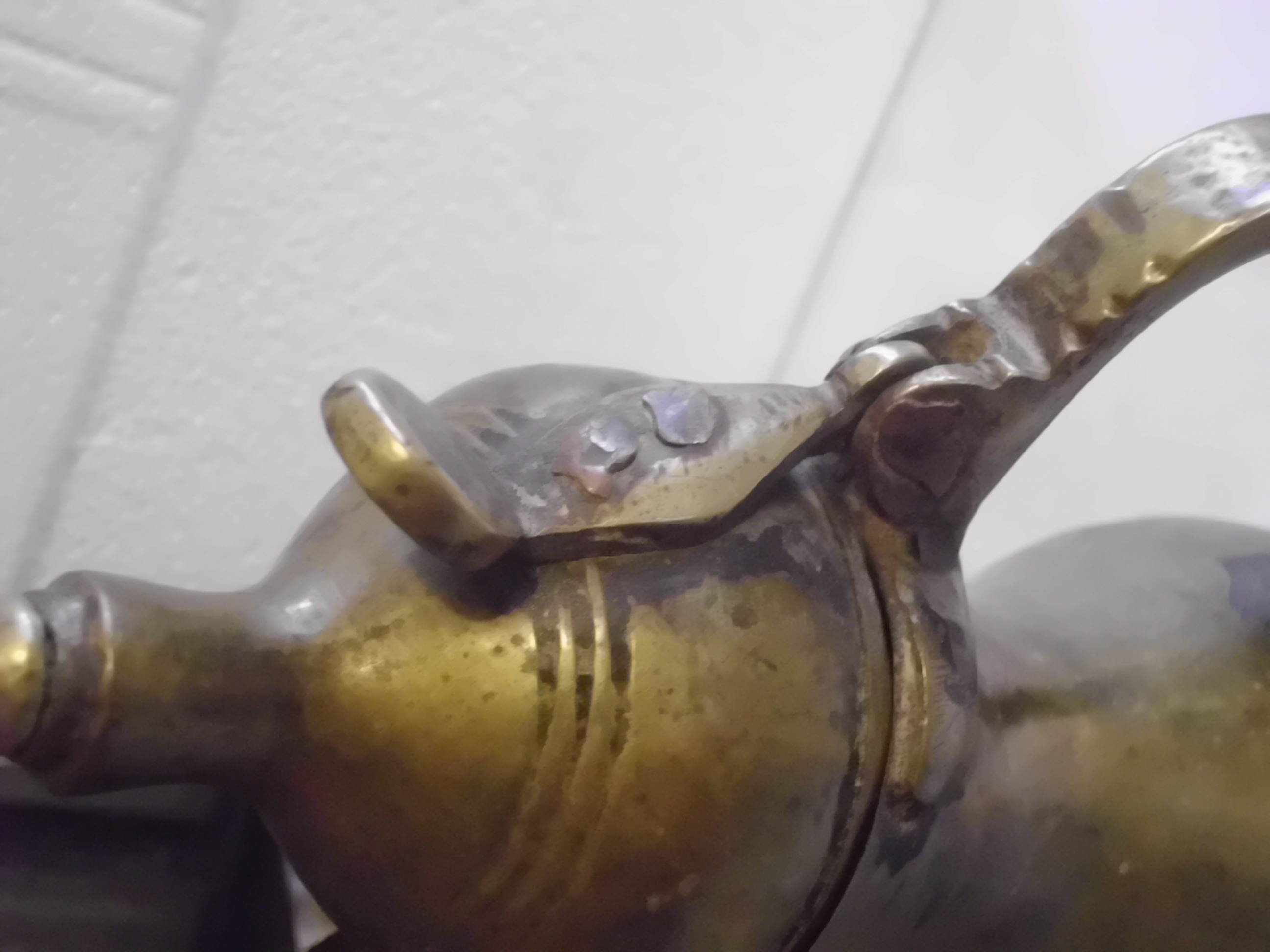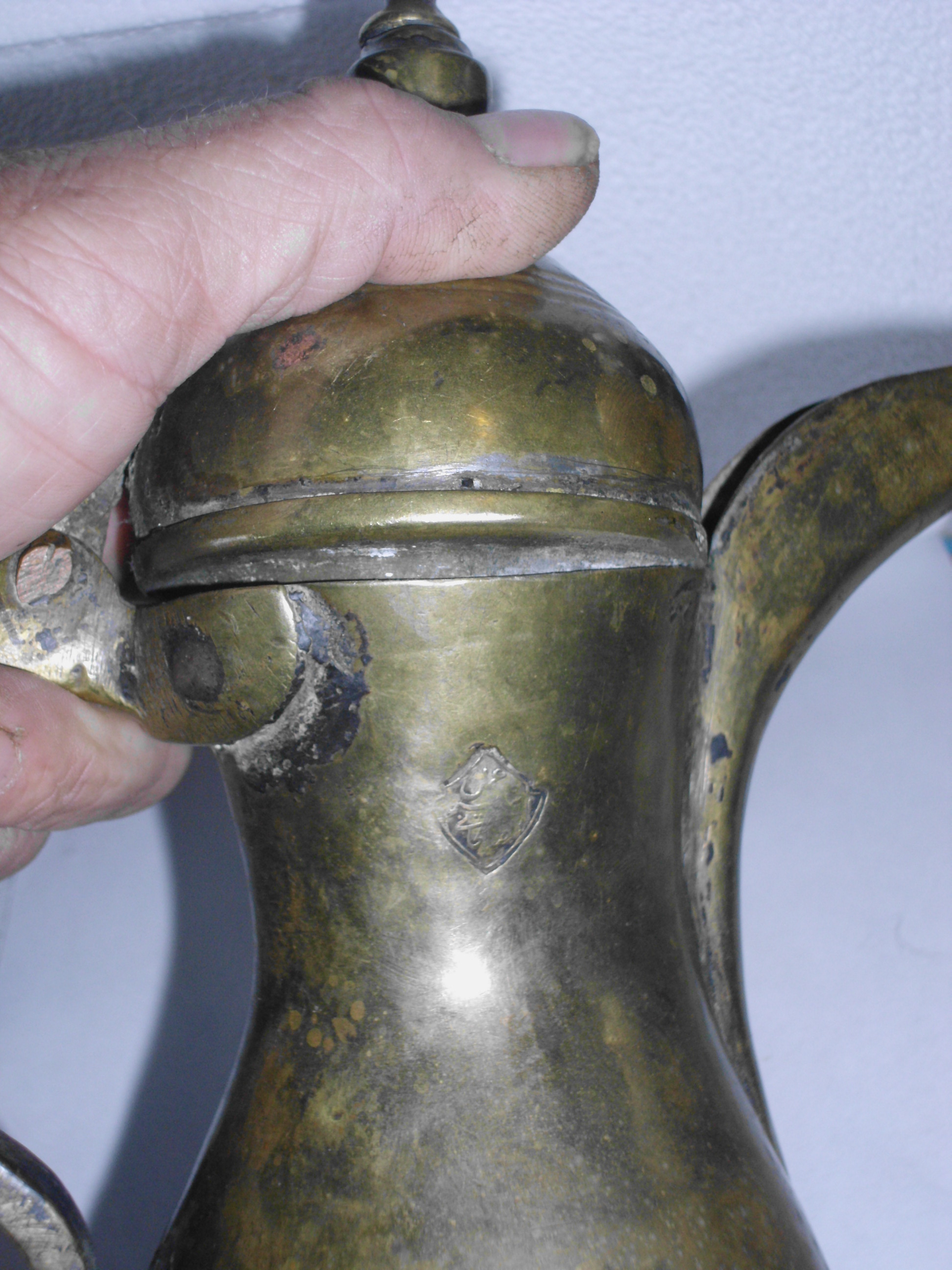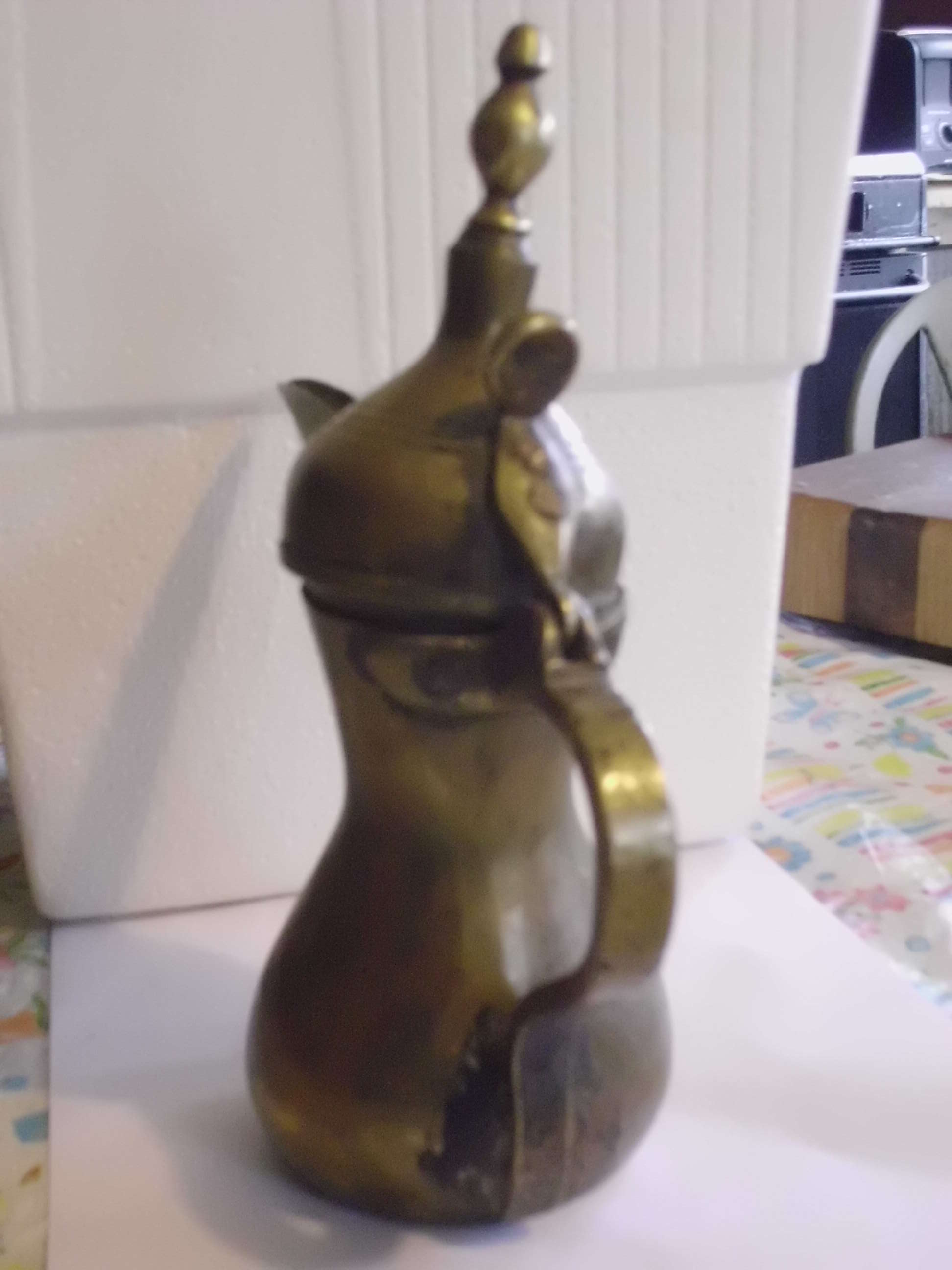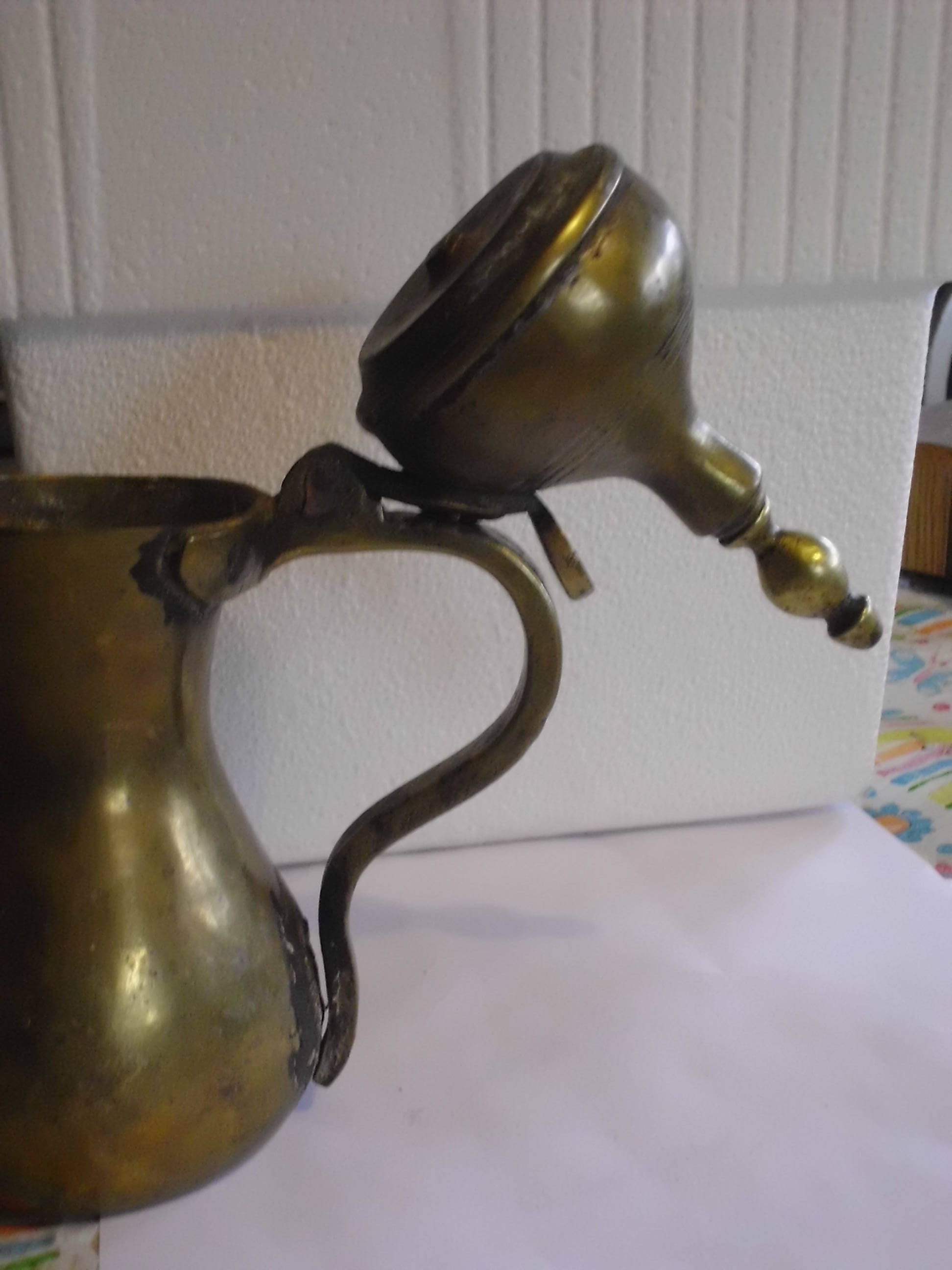 This teapot/vessel is made of handforged brass with handforged copper rivets by the looks of it. Stands about 9 1//2" tall by about 8 1/2" from the tip of the spout to furthest point on the handle. The copper rivets are hammered into the handle to hold it in place. maybe brass solder for the spout and base of the handle. Has a makers mark,I was able to get two fairly descent pictures of it, unfortunately, its pretty worn off. The base is 3 inches across. Whatever they used to hold the base of the handle on is gone, but the handle is still firm. The lid does not set right, but will with a little effort. I do think I described this item best I could and the pictures hopefully will help out.