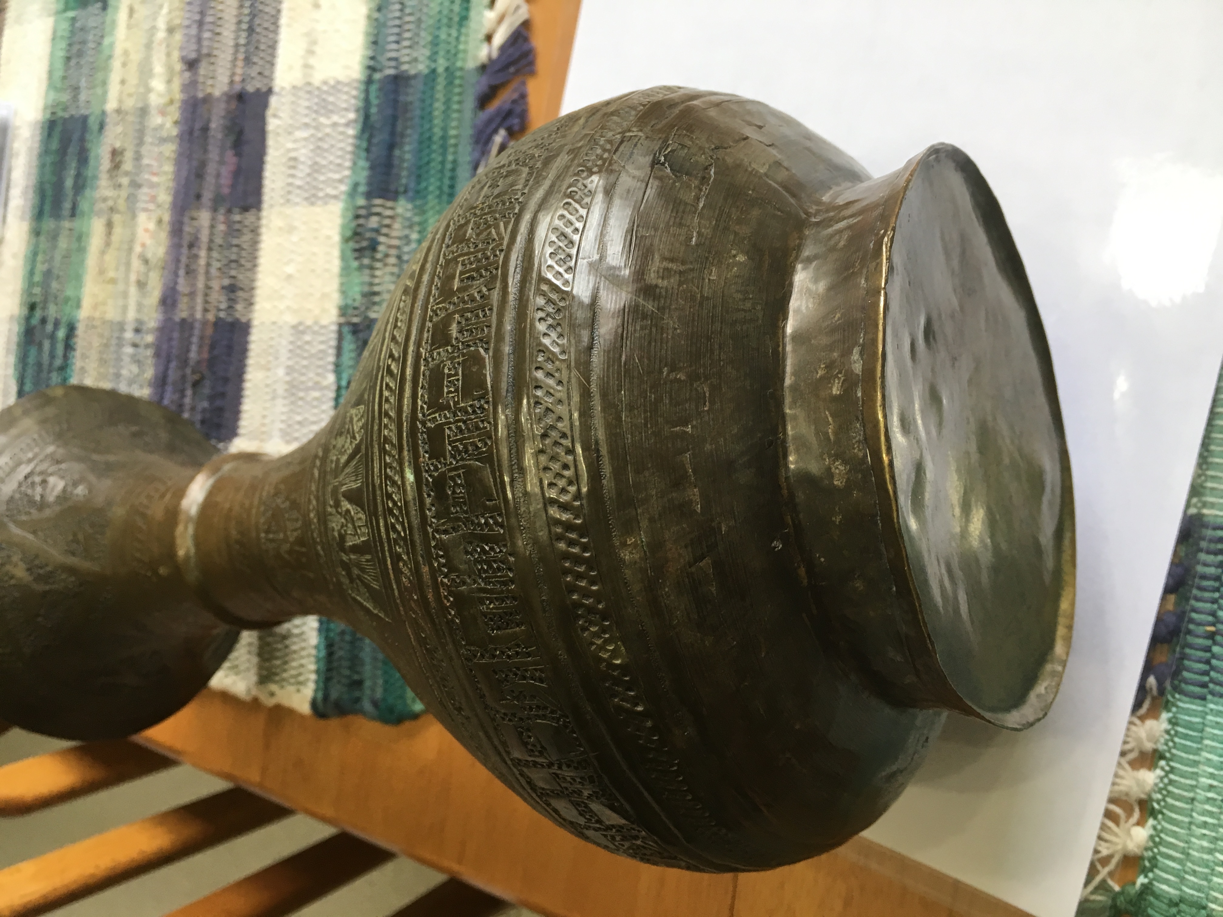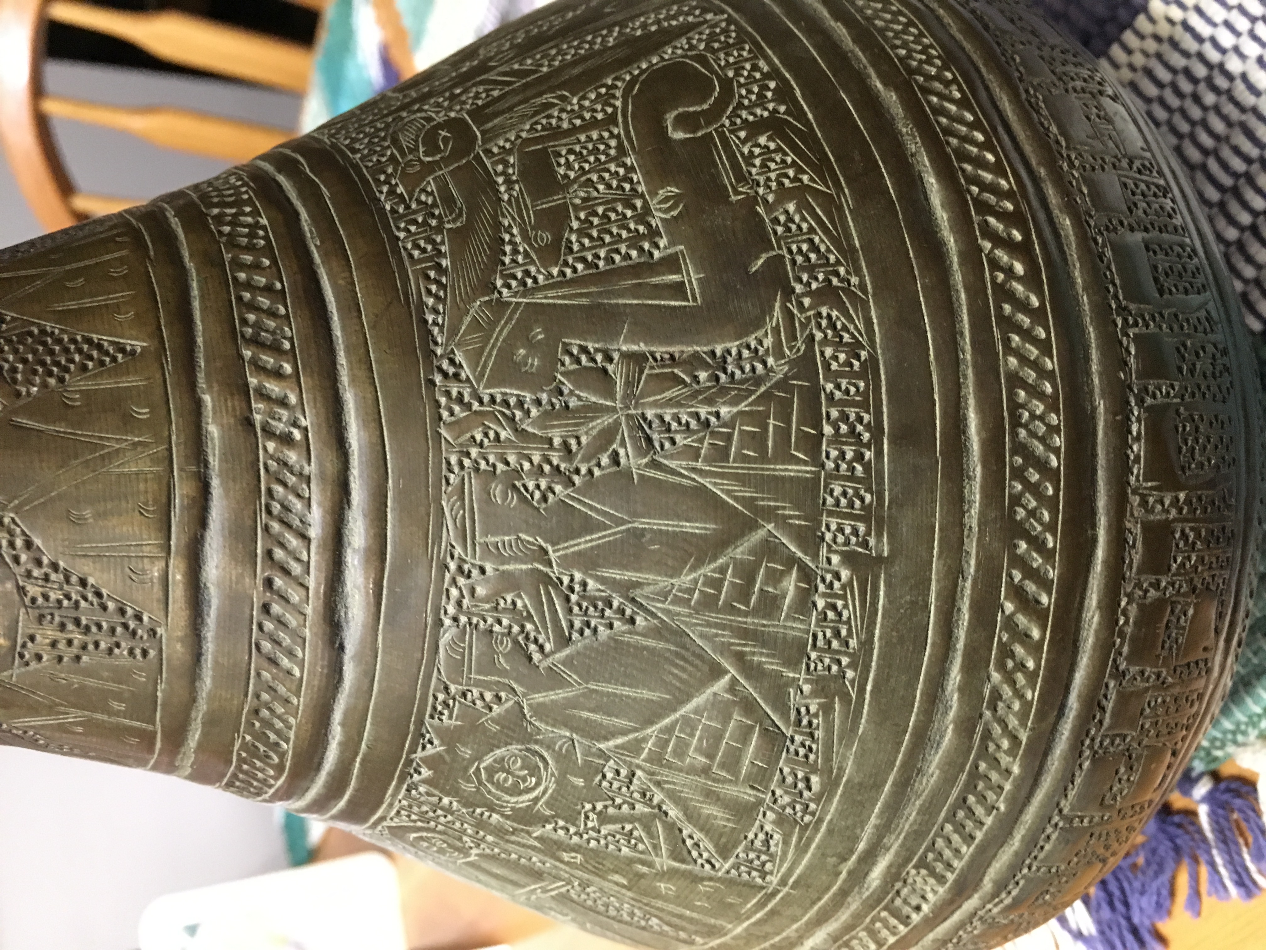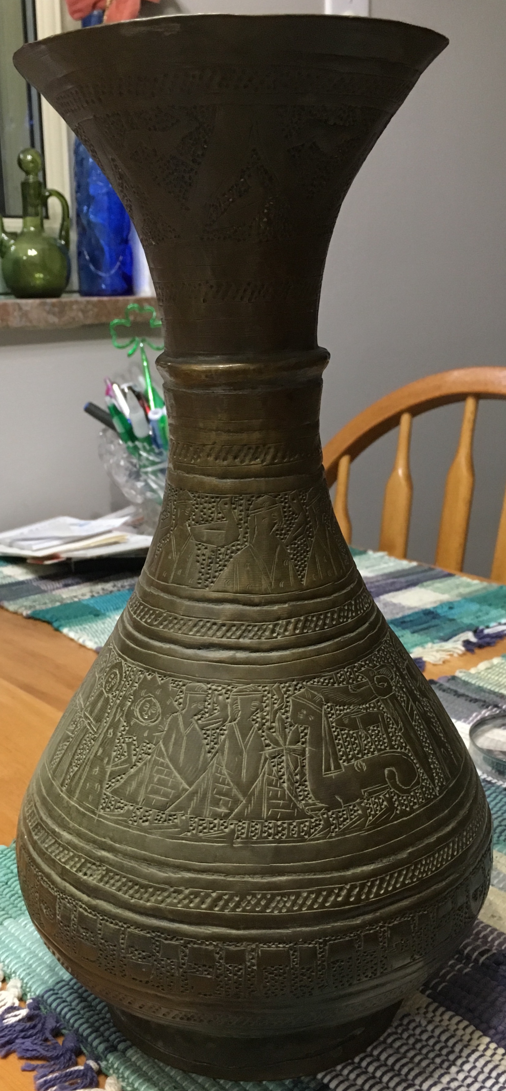 This is what we think: Mid East Brass Vase, Rare Eg yptian Hebraique Revival Hand Etched- 19th c. Hand Hammered, Judaica, Sphinx, Hebrew Inscriptions