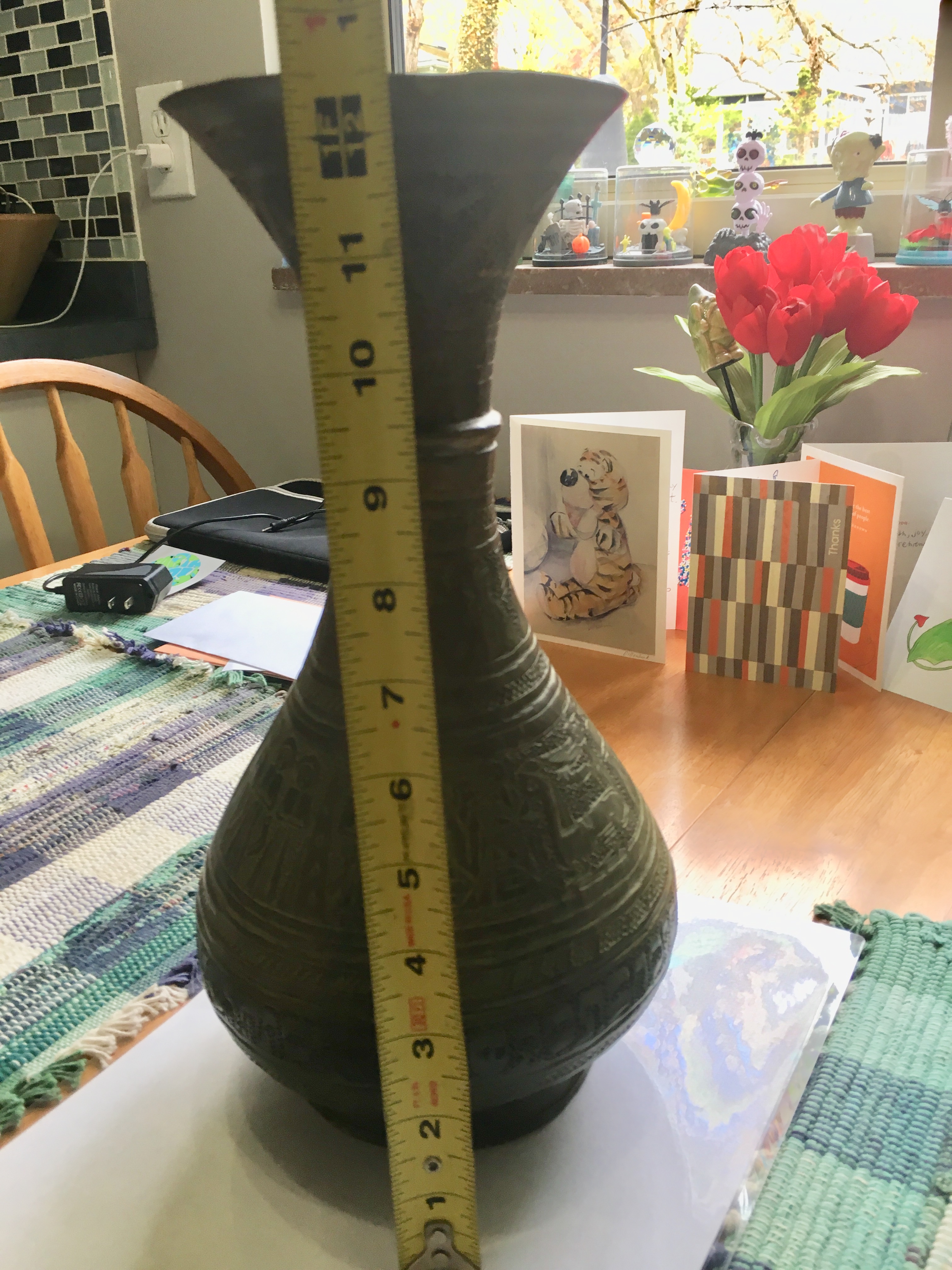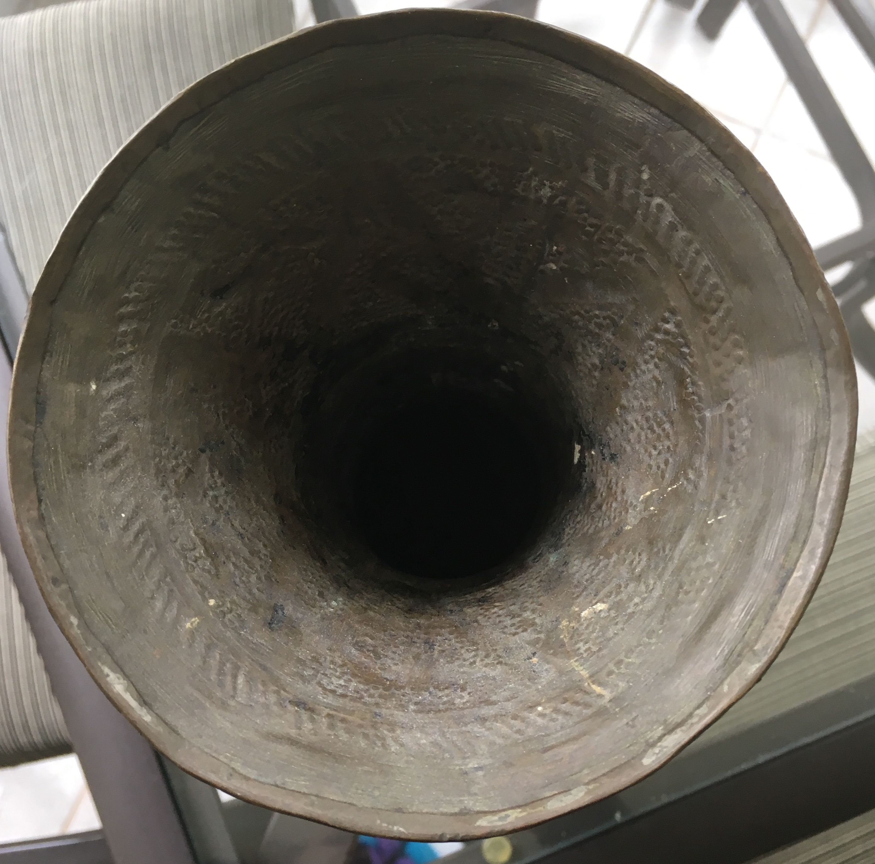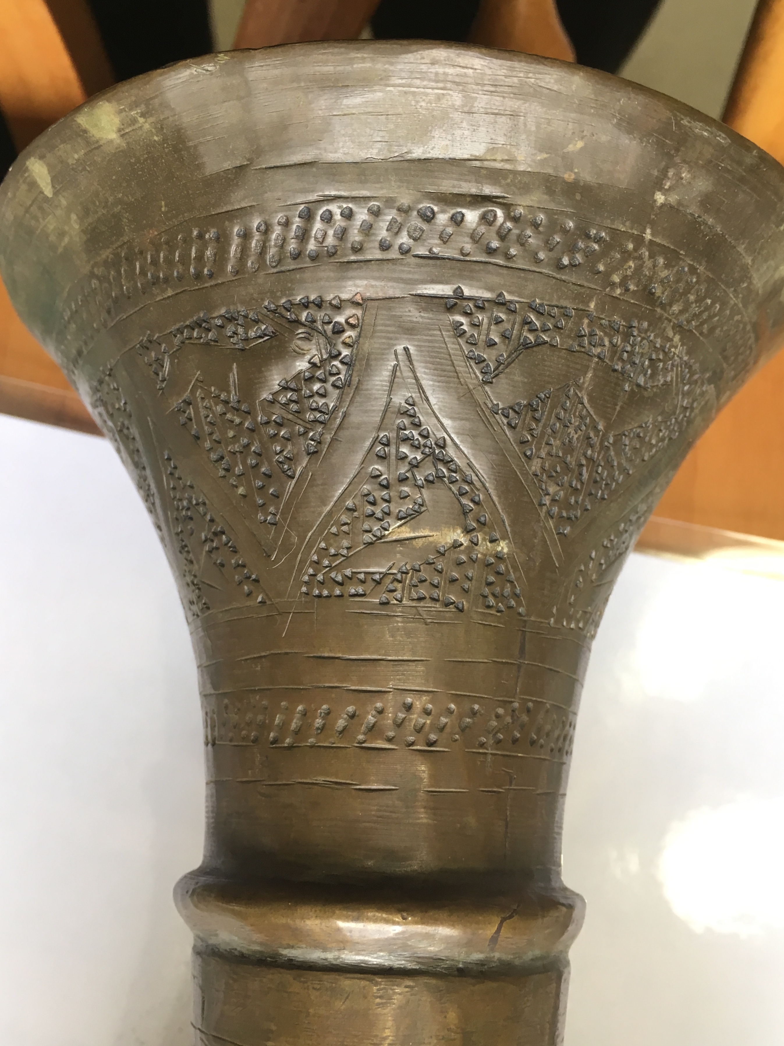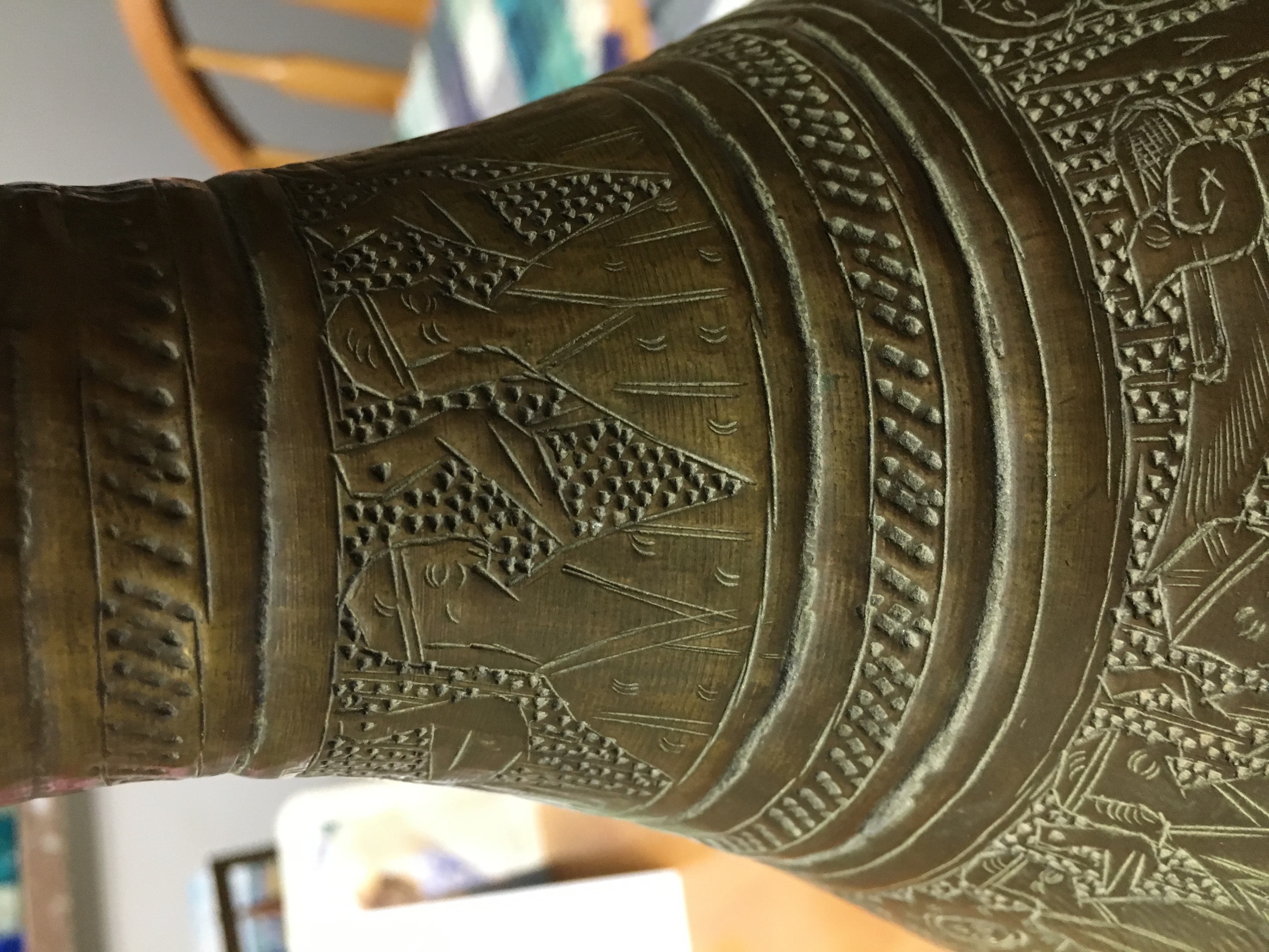 This is what we think: Mid East Brass Vase, Rare Eg yptian Hebraique Revival Hand Etched- 19th c. Hand Hammered, Judaica, Sphinx, Hebrew Inscriptions