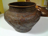 This rare and beautiful example of Mid Eastern metal art is decorated with Hebrew inscriptions, pyramids, Sphinx and human figures, birds and motifs evidently depicting the period of slavery in Egypt. It is a primitive hand hammered and etched vase in the Egyptian Hebraique Revival Style. The outer metal is brass.