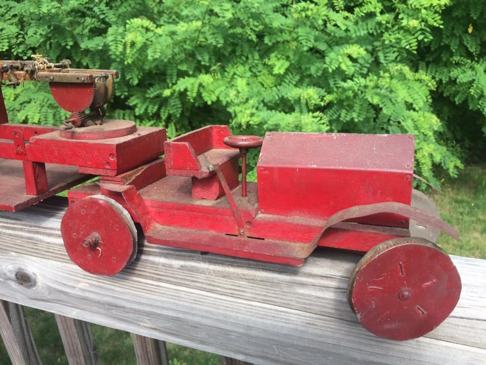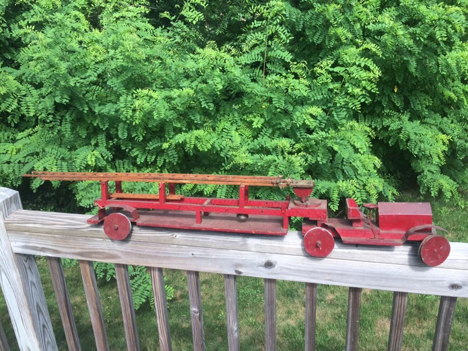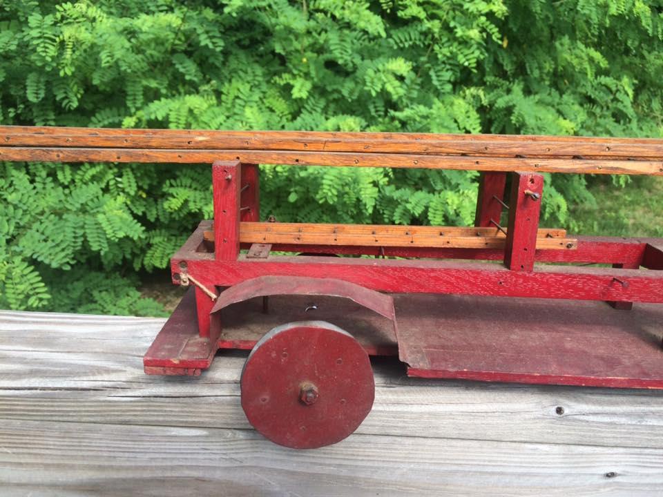 I have this one-of-a-kind hand made wooden/tin aerial fire engine. I believe it may be from the '20's but not quite sure. It measures over 54" long and has a number of hand made ladders and associated firefighting tools. Which really adds to the piece. I'd like to get an idea of what it may be worth. Thanks.
