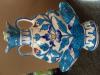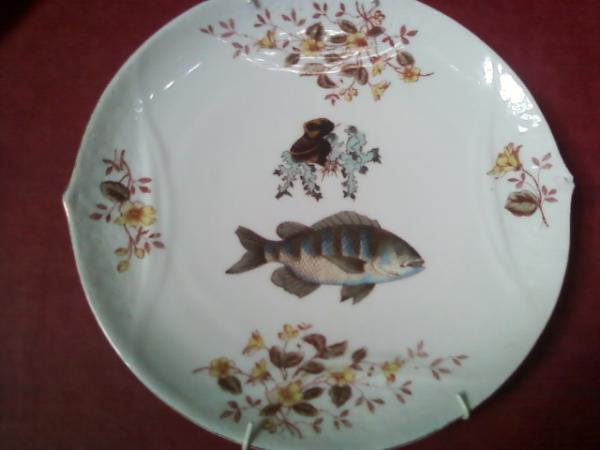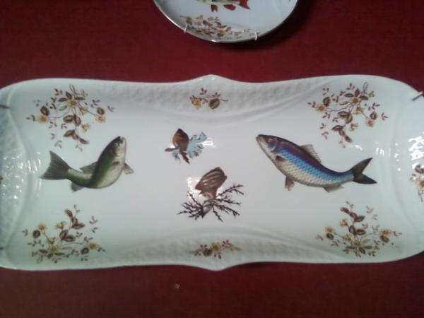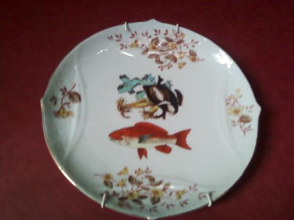 Hand painted 10 piece set of 9 plates and 1 platter. All are decorated with a fish, some floral designs near the edges, and gold trim on the edges. 3 different types of fish are used, with one type repeated on 3 plates. The back of each plate is signed with F.4. and the number 95, 103, or 122. If anyone has any information about who the artist is, it would be appreciated. The condition is great except some of the gold trim has worn off.
