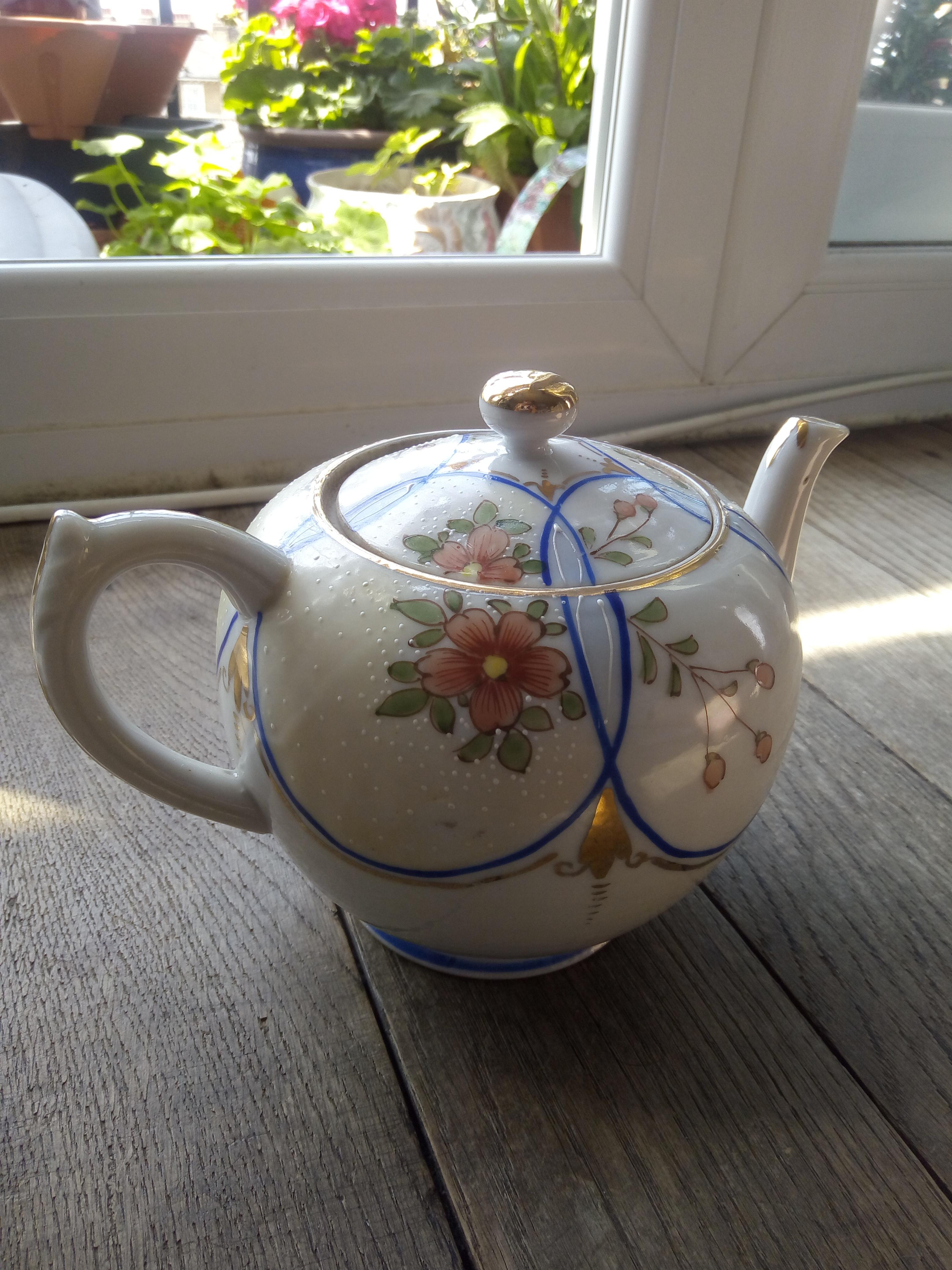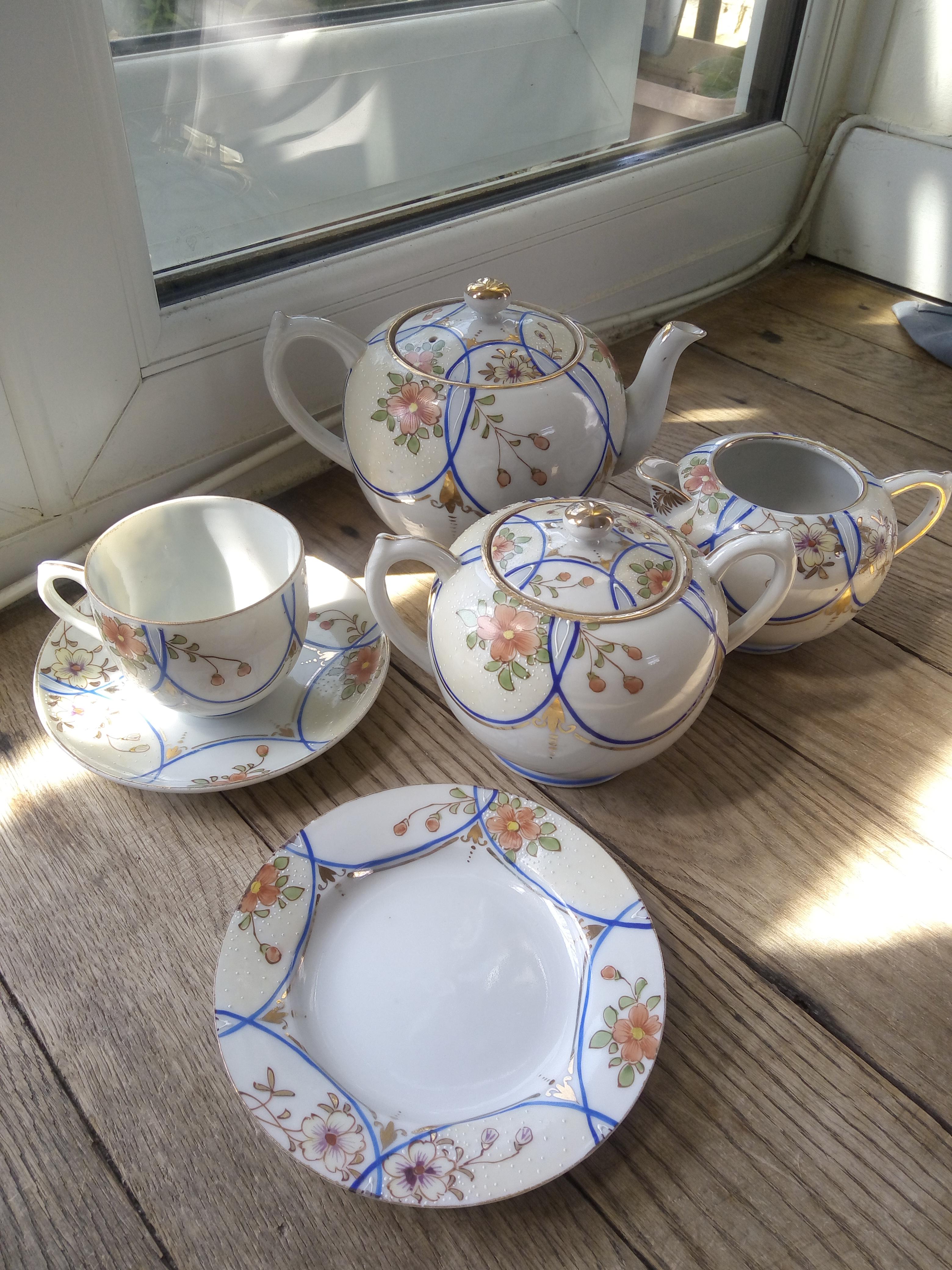 I believe it was purchased in England and it is made up of 6 x tea cups and their saucers, a millk jug, a sugar bowl, a tea pot and 5 x side plates.