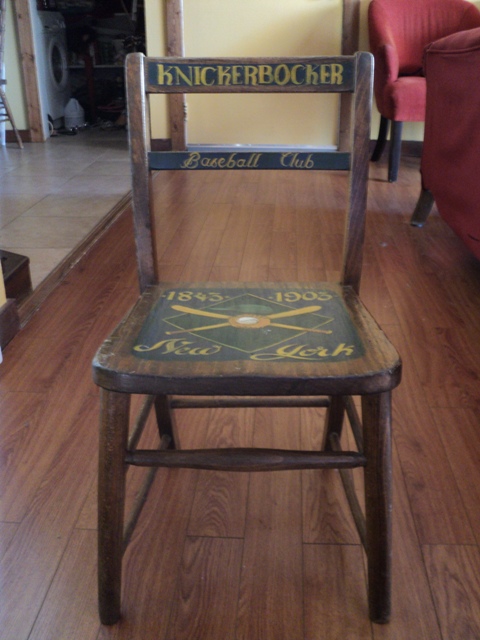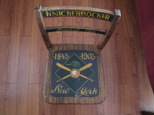 This chair is 27" high and 13" wide. It has painted sign "KNICKERBOCKER" on a back of the chair, it also have anather sign just below the first one "Baseball club"  On a sitting area there is picture of two cross baseball bats with baseball glave with a ball in the middle, also painted date 1843-1903 and "New York" sign under. You can tell that the wood is old.  Thanks!