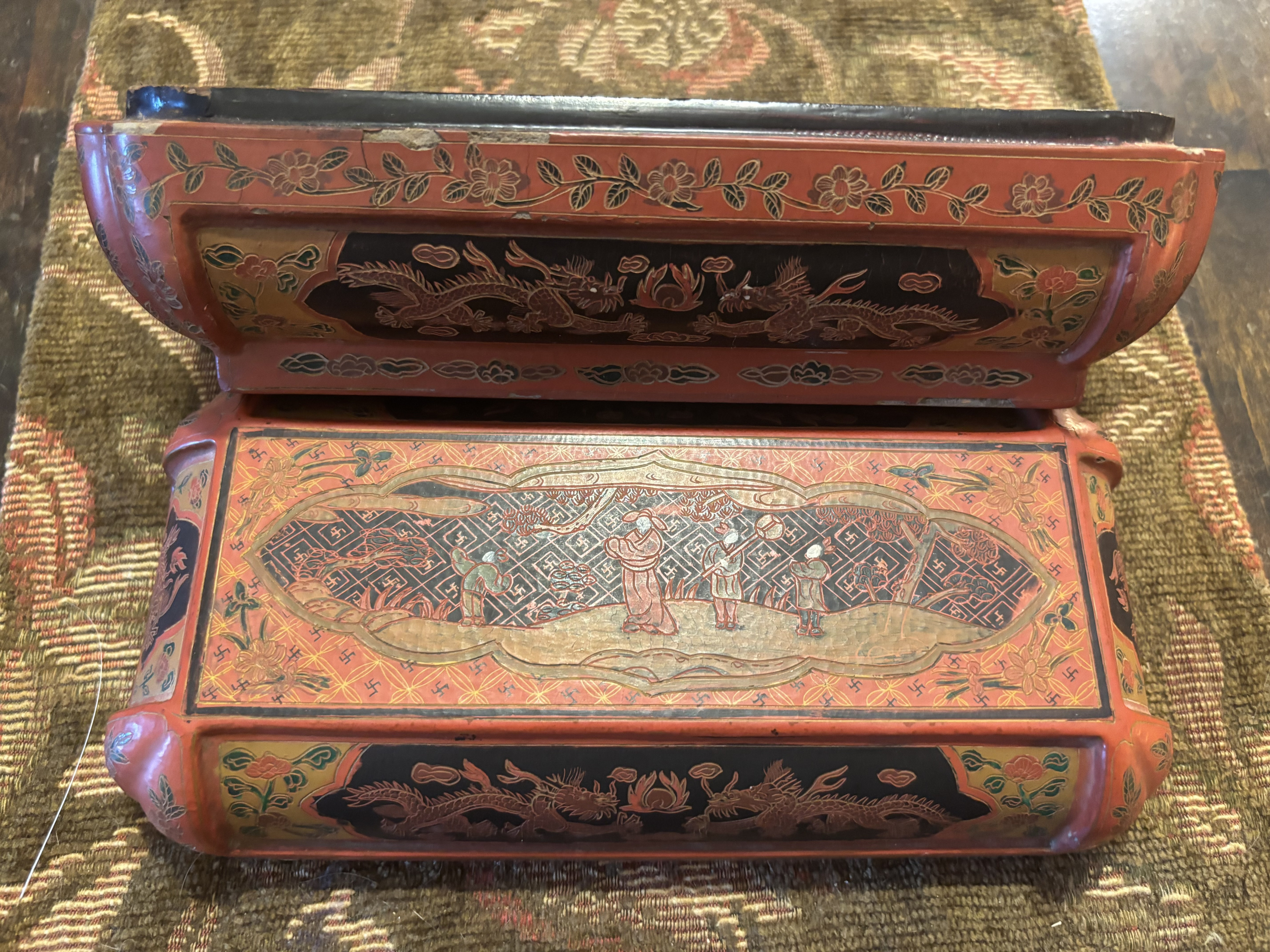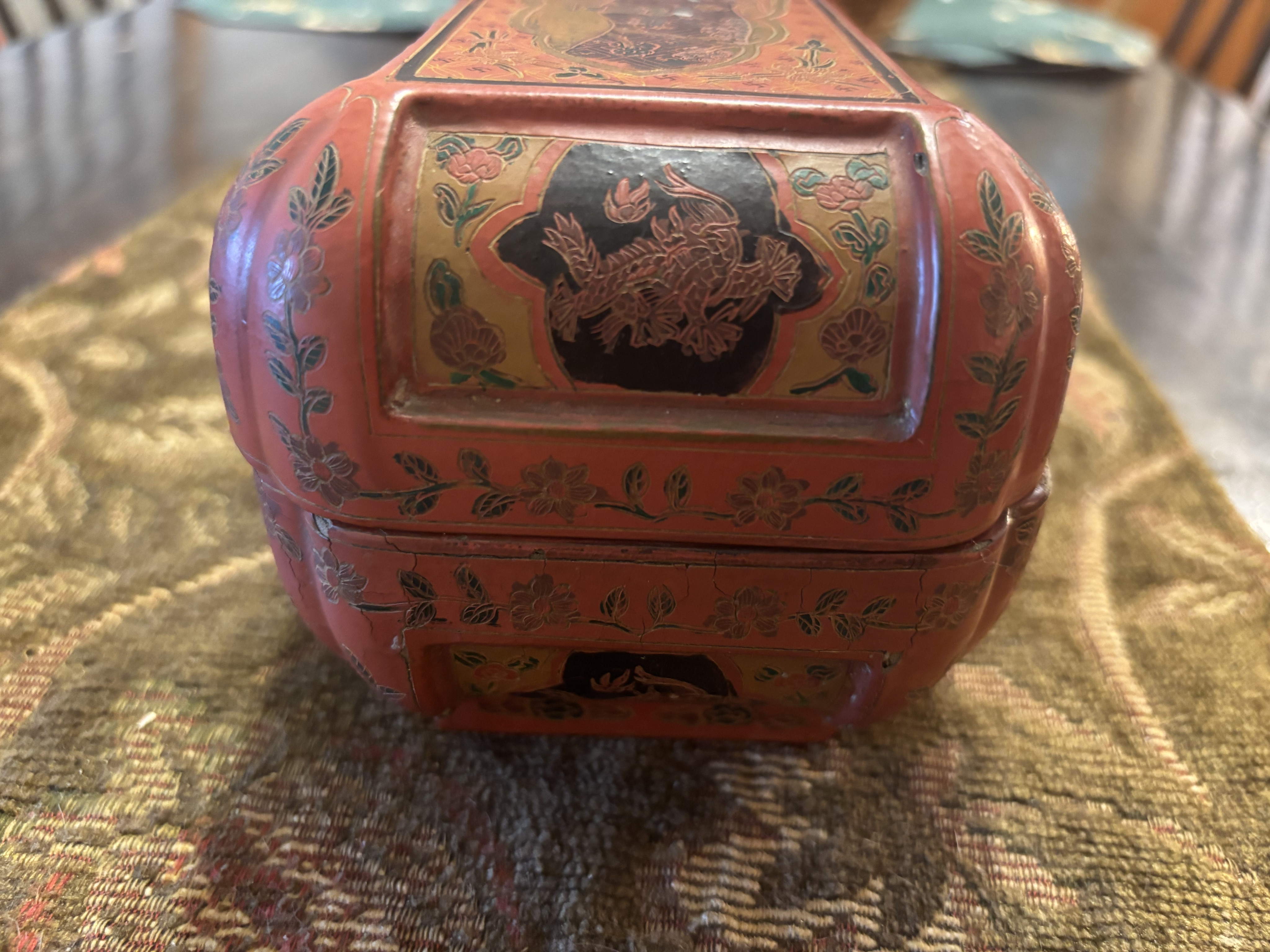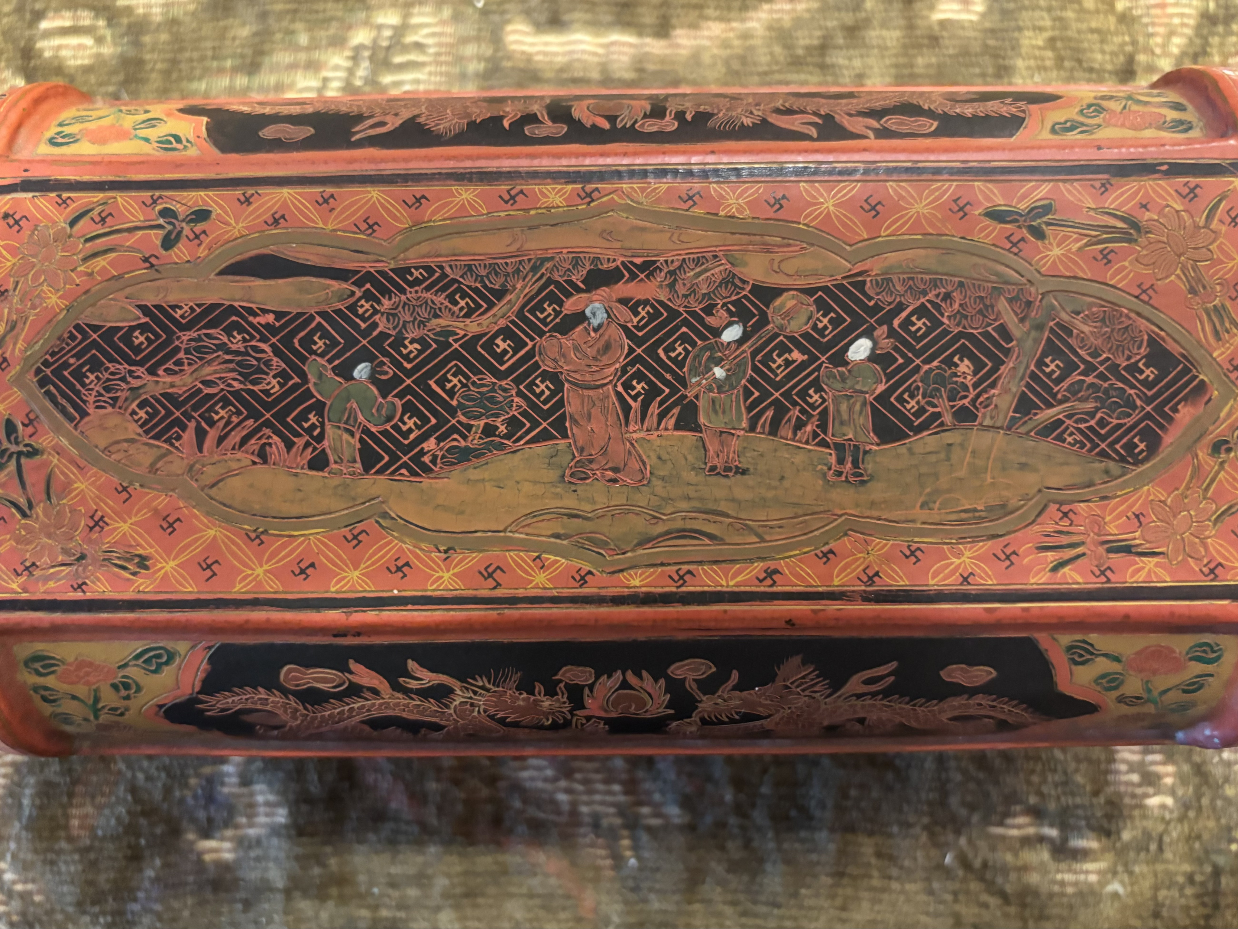 Description I have aquired this box, I have little insight as to the origin etc. The box contains 12 dragons along the sides of the box. On the lid is an image of four people in a scene with trees and clouds and swastika like motifs throughout. The box is carved and hand painted.