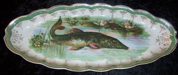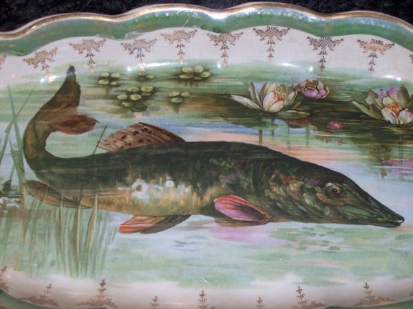 Antique Beautifully Detailed Hand Painted Fish Platter and has no cracks, shows crazing, chipped in a couple of places, and shows some wear. Color is very vibrant.