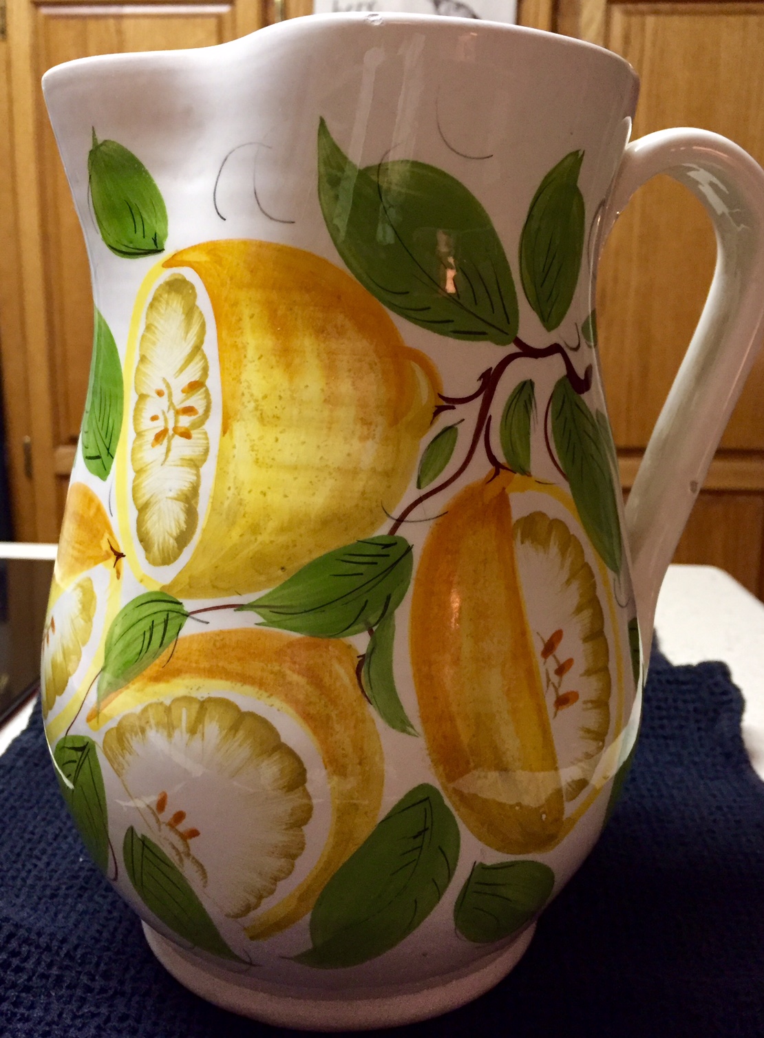 9" high, pinched nose ceramic pitcher with lemons painted on it. looks like grazing in the bottom.