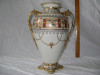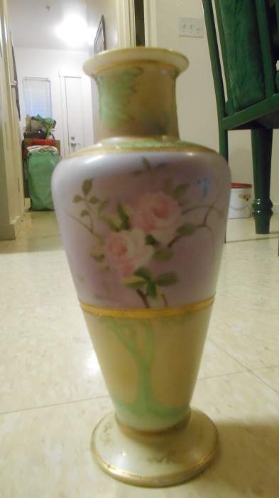 This is an old porcelian, hand-painted vase, decorated with a floral design, and what appears to be a bit of gold (although, I am unsure). On the bottom of the vase, "Hand Painted Nippon" is written.