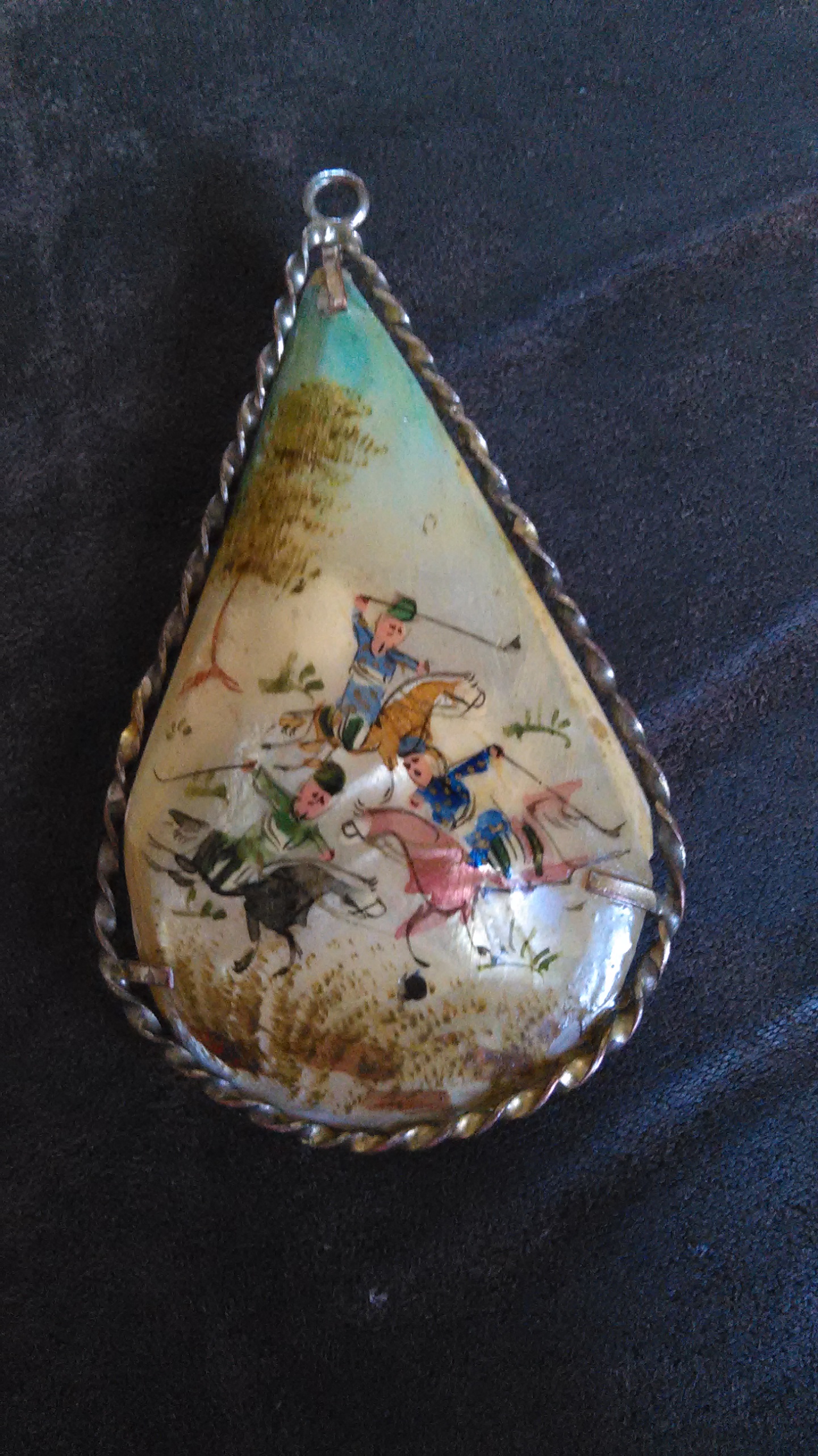 Teardrop pendant hand painted approximately 2" tall birds on one side men on horses playing polo on reverse