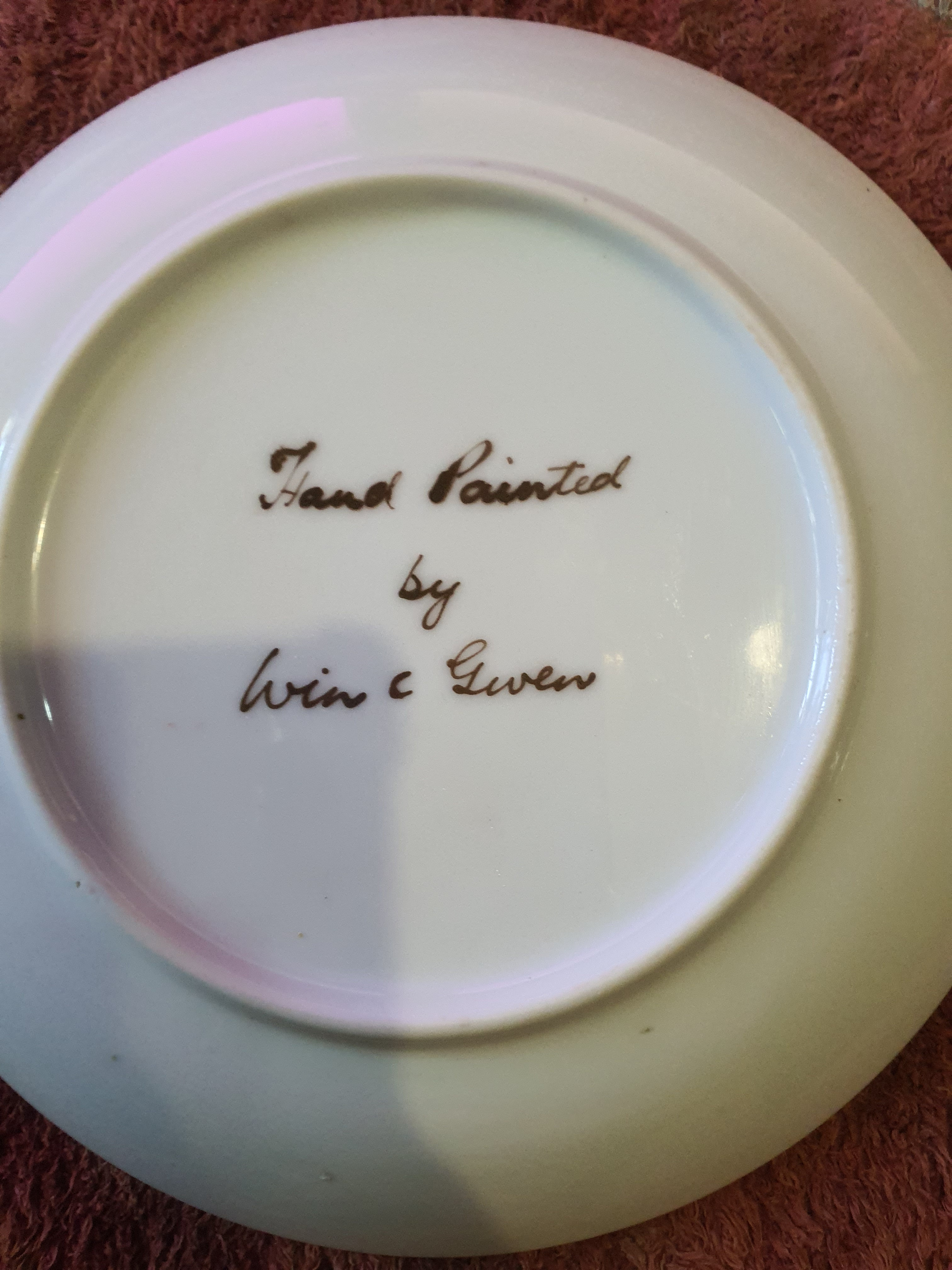 Description A butter plate with hand painted flowers on it. On the back it is written in running writing "Hand painted by Win c Given
