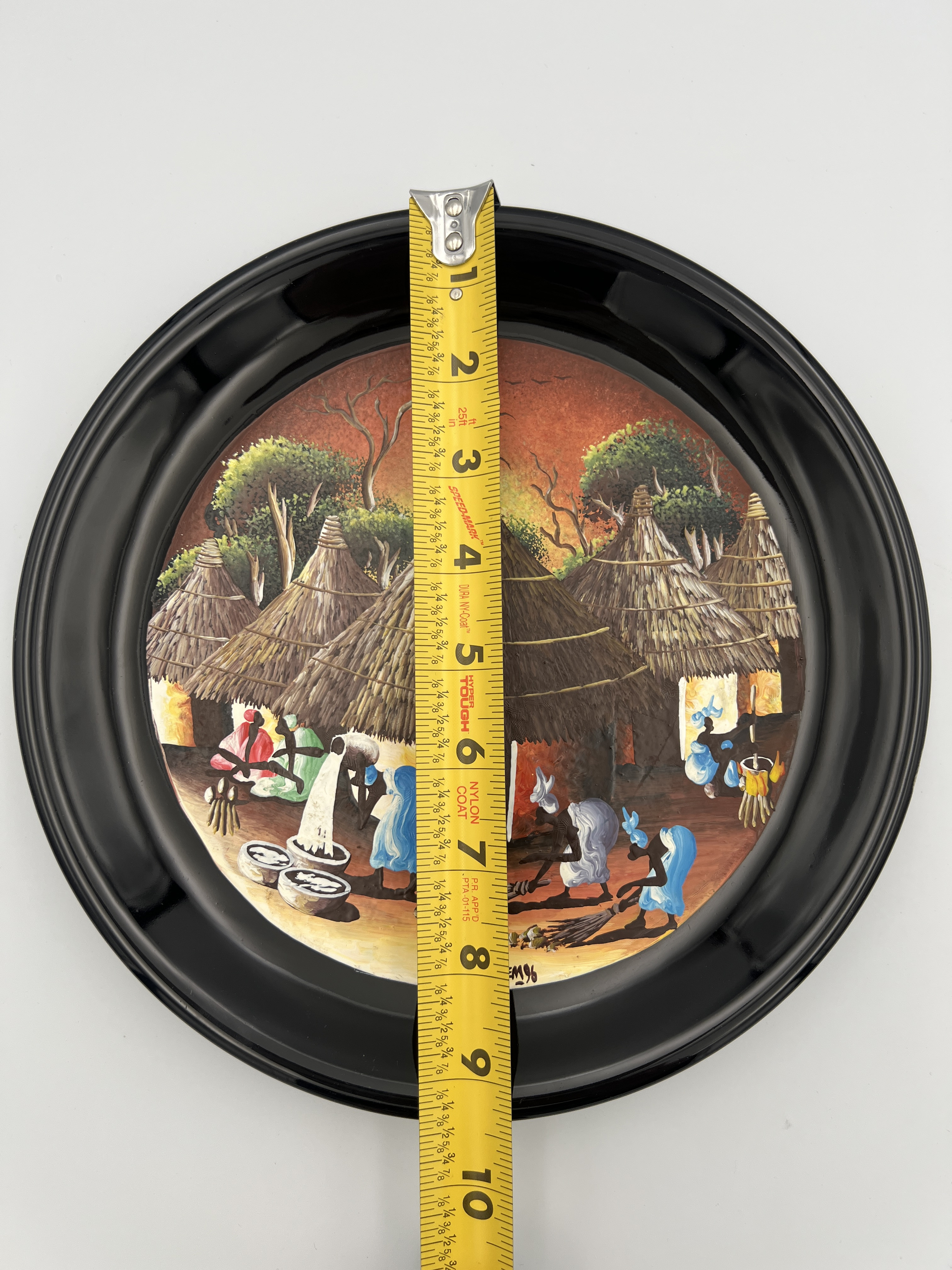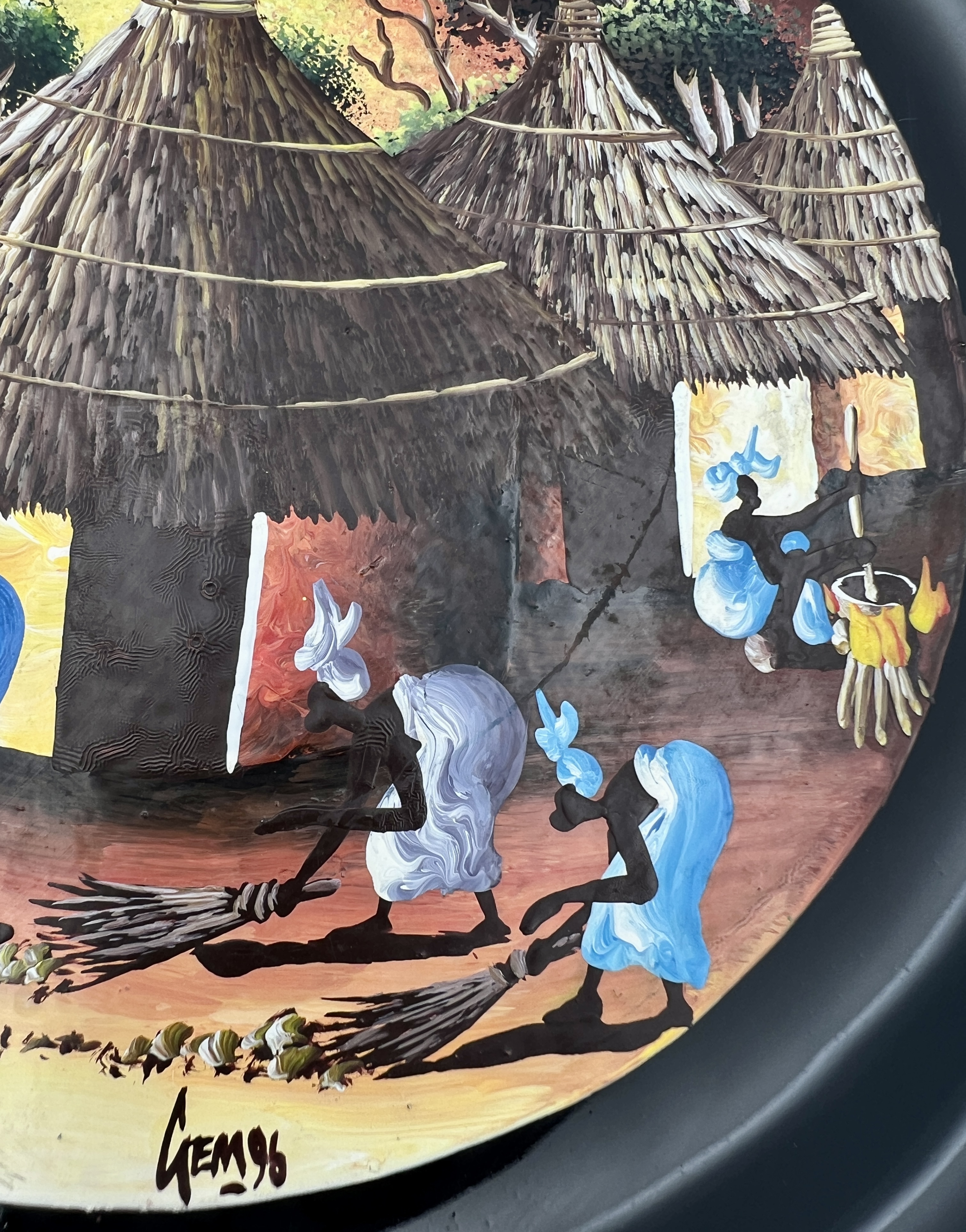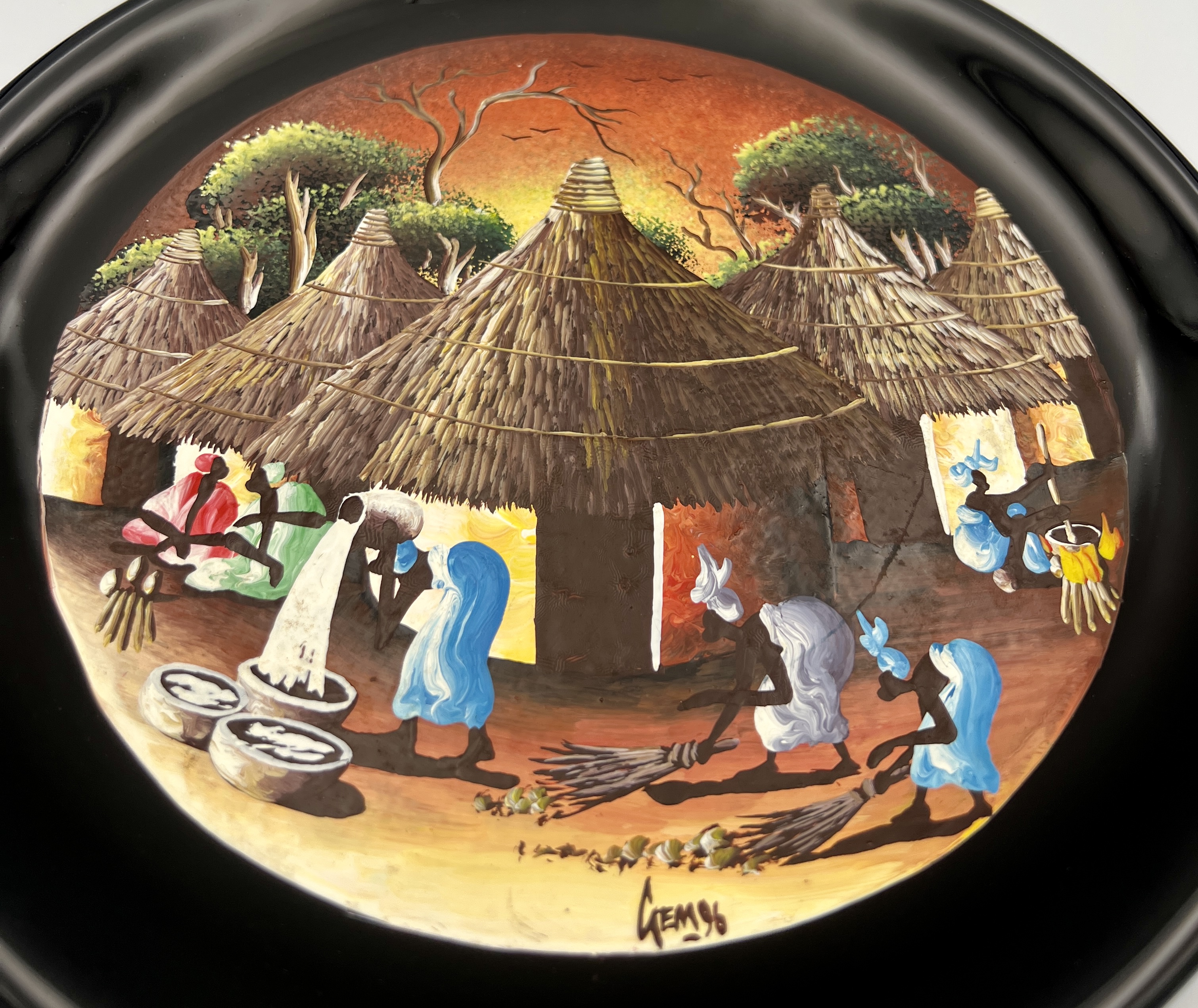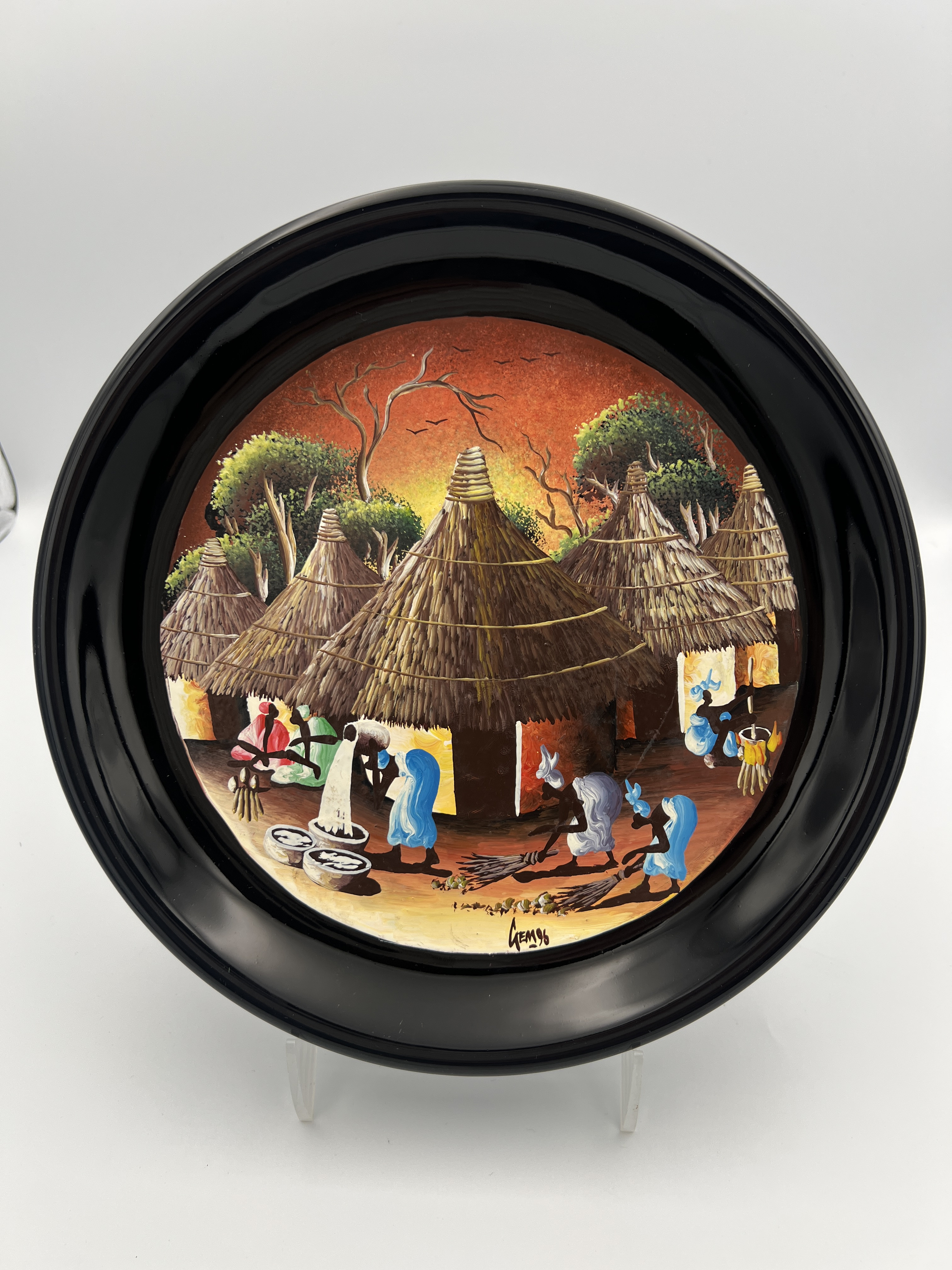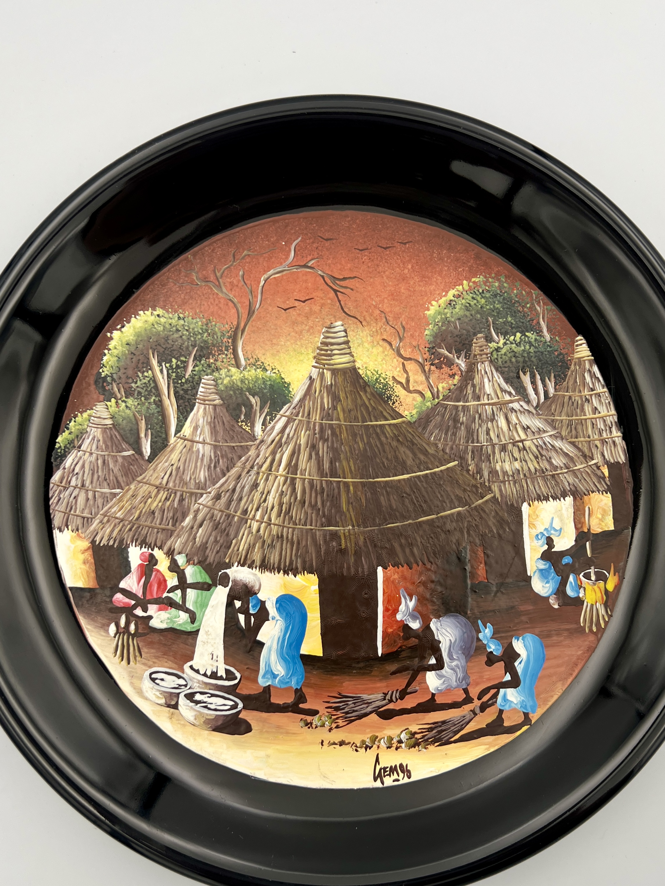 Physical Description: This hand-painted plate features a vibrant depiction of an African village scene, showcasing women engaged in daily activities such as gathering water and sweeping. The plate measures approximately 9 1/4 inches in diameter and is made of ceramic with a glossy black rim. The central artwork is signed 'Gem 96', indicating the artist and year of creation.