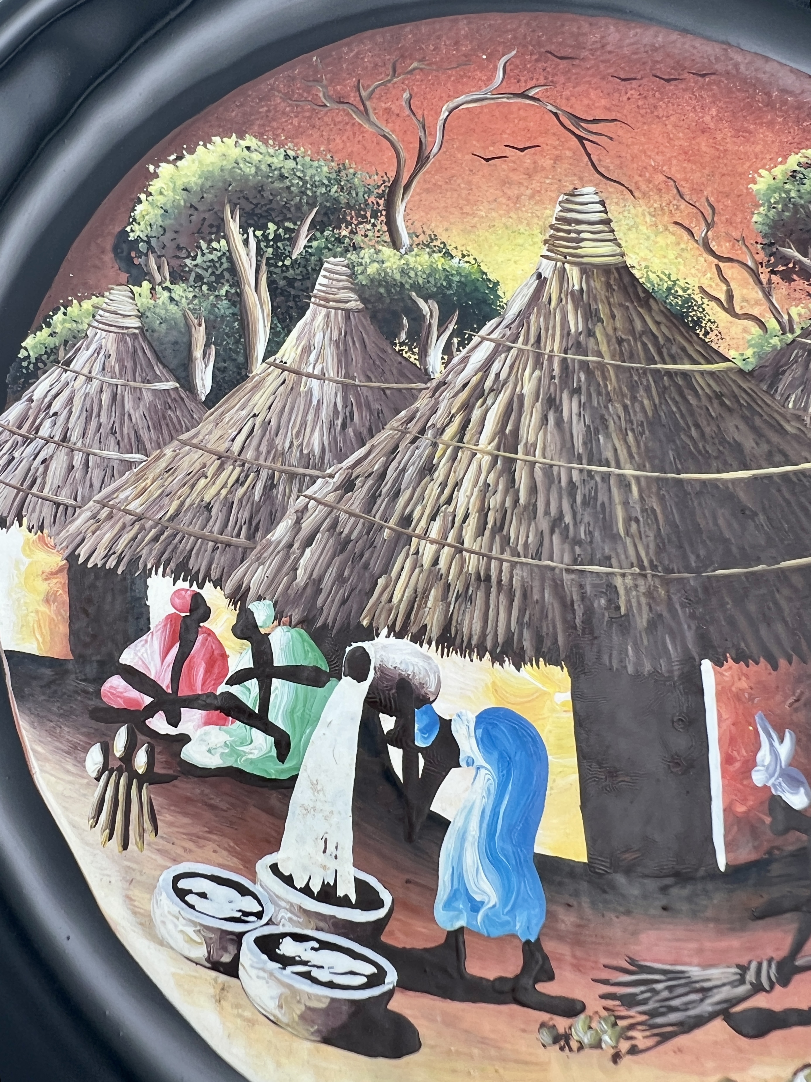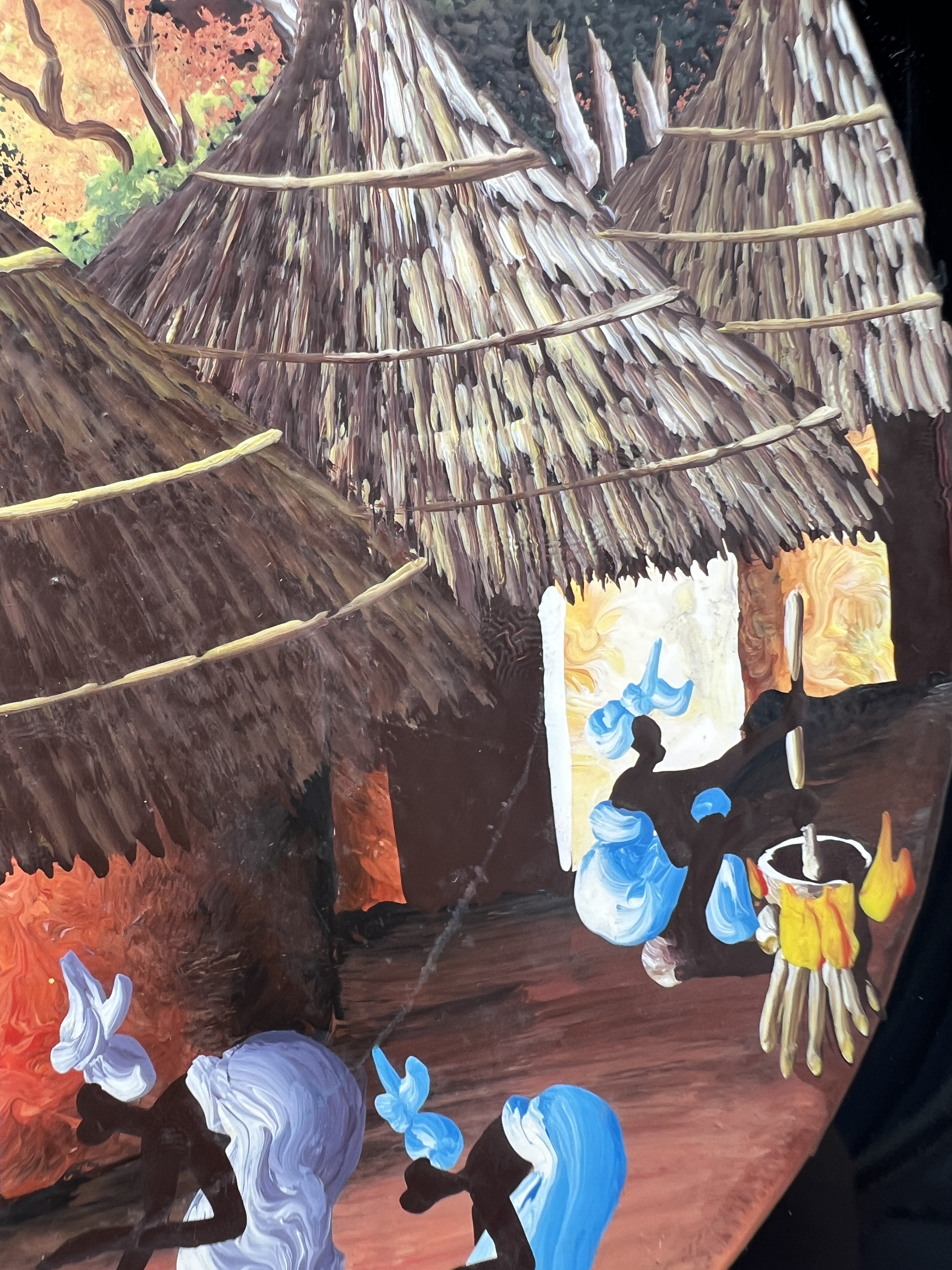 Hand painted plate depicting an African village with women gathering water, sweeping, doing laundry.