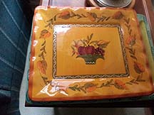 A muted orange, squarish serving platter that is hand painted in the center and borders with russet colored floral designs. Origin unclear. The color pallette says Mexico or Italy but maybe someone will recognise the design as being from elsewhere?