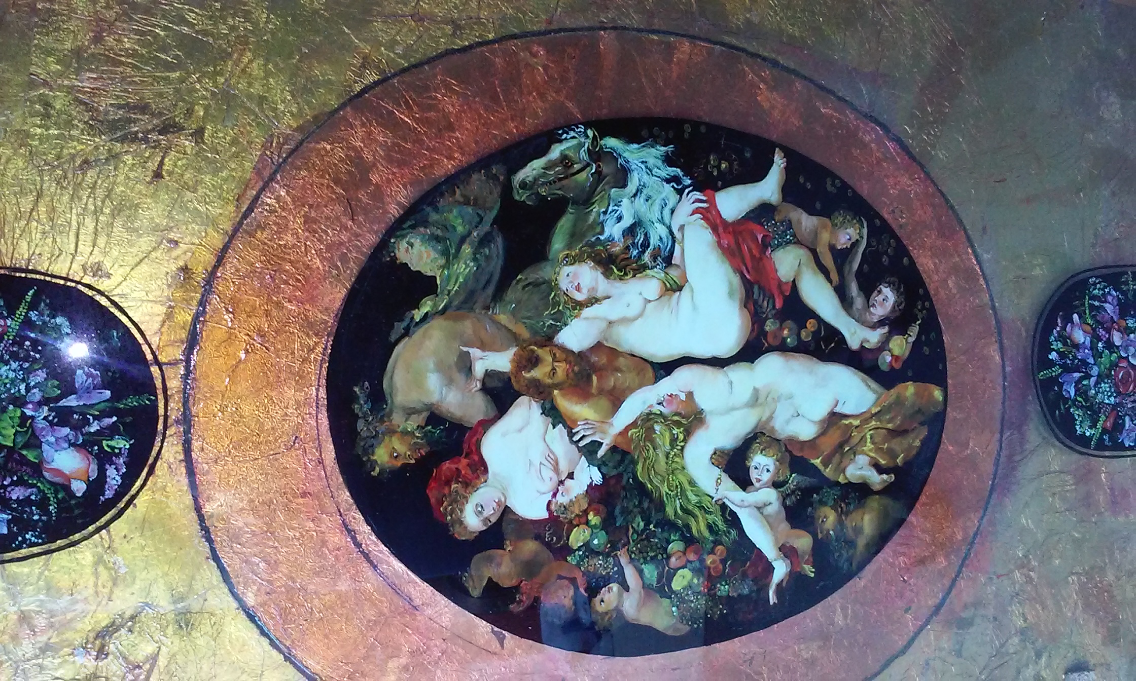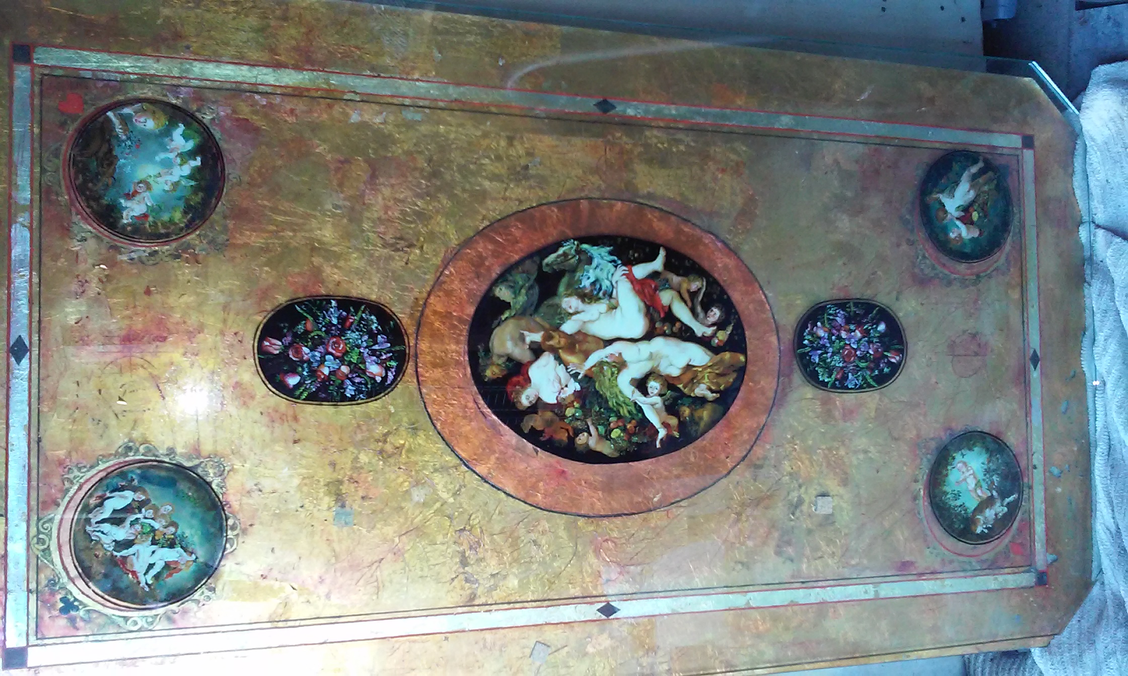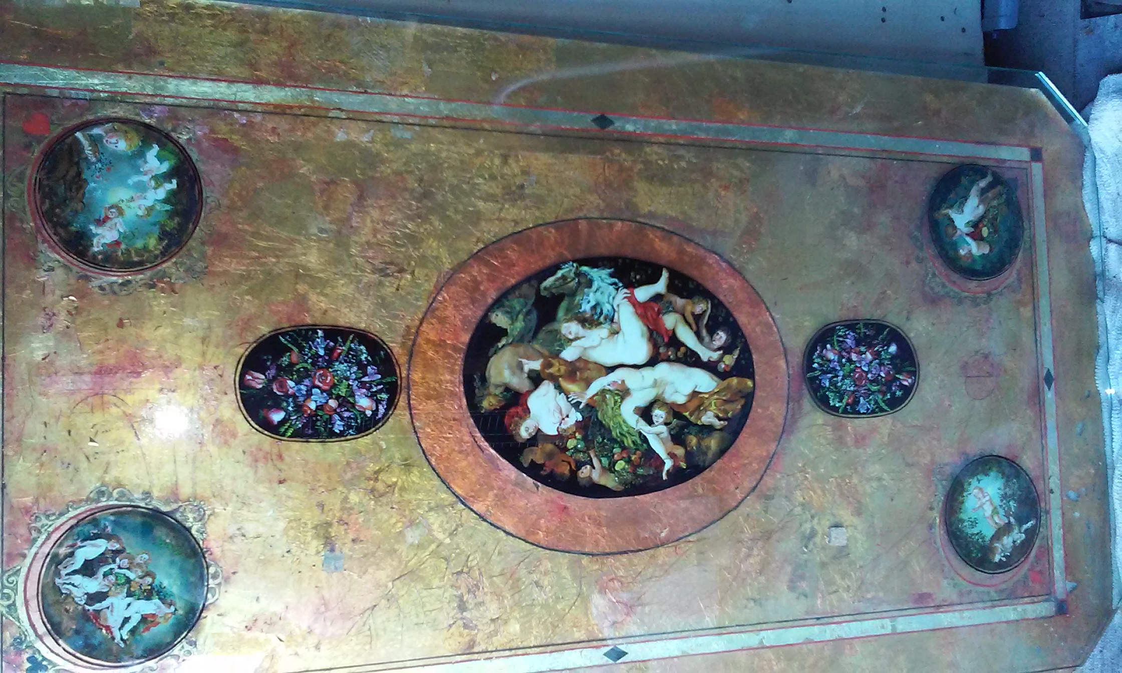 I have a hand painted table top imported from Greece. The table is 2 piece with the painted glass sitting on top of another piece covered in gold flake.. The table has Cherubs and and what looks like Greek God's. There is a heart on one corner, a spade on one corner, a diamond on one corner, and a club on one corner..
