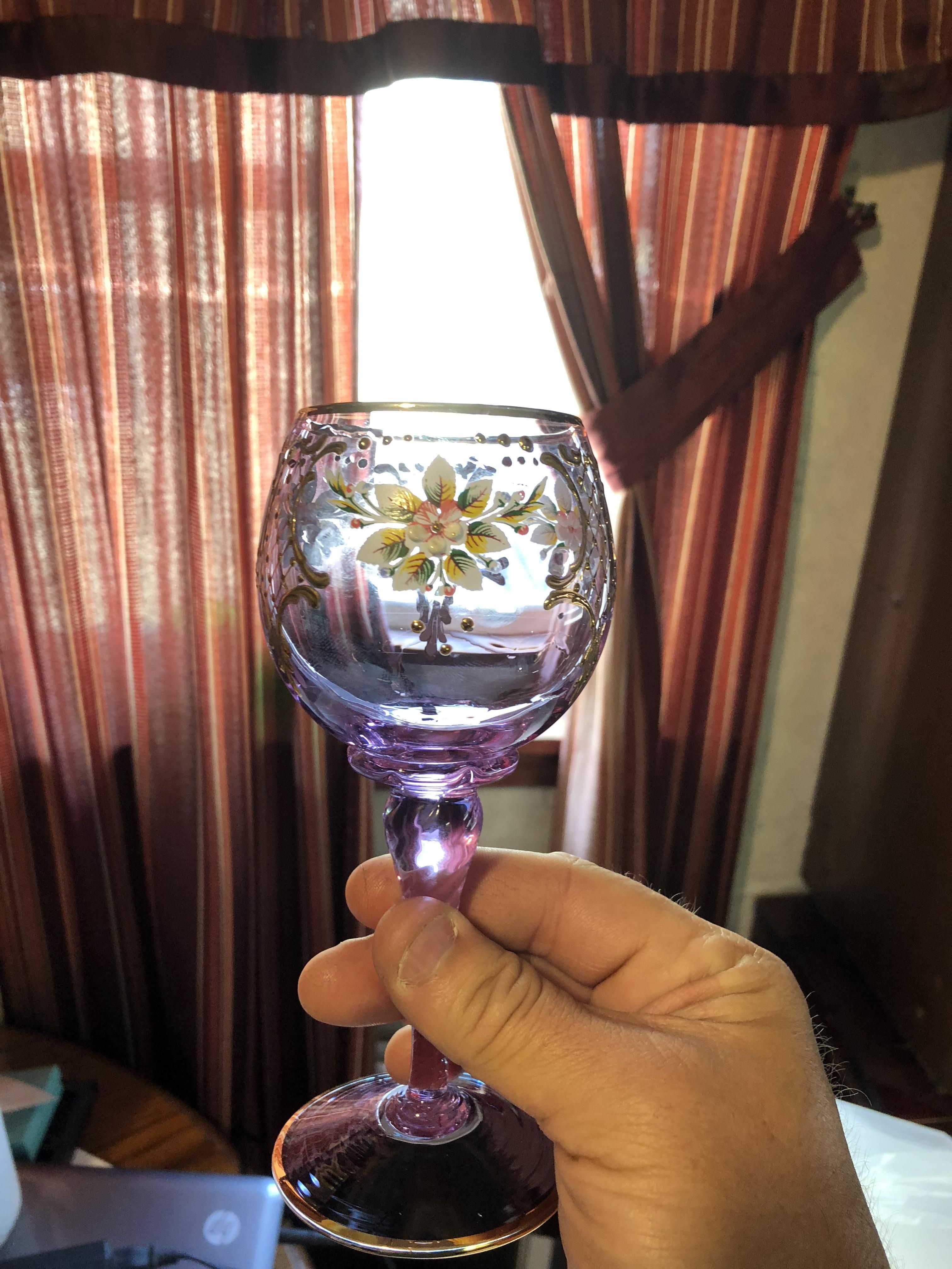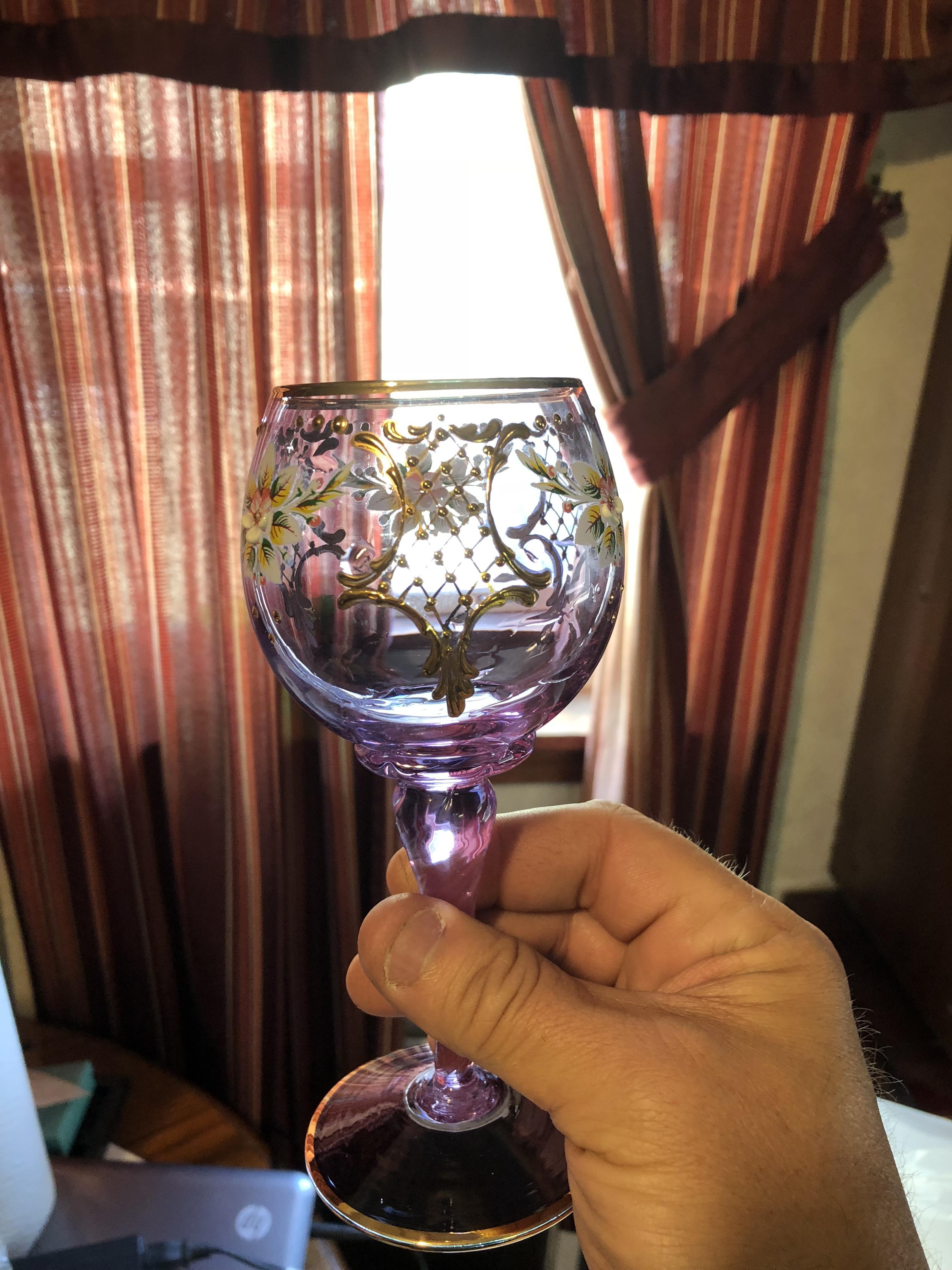 Wine glasses with hand painted flowers gold rimmed on the top and bottom of the stems also has gold accent pieces