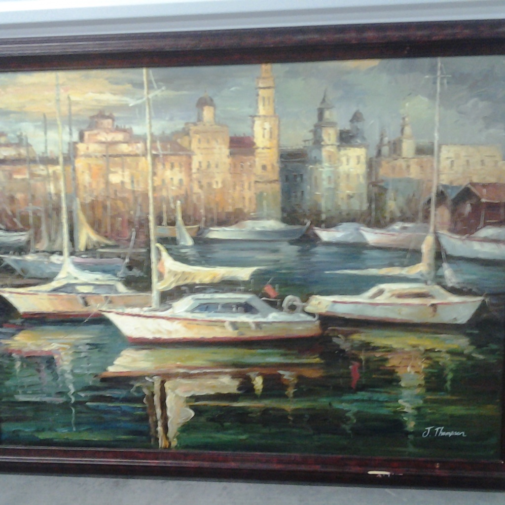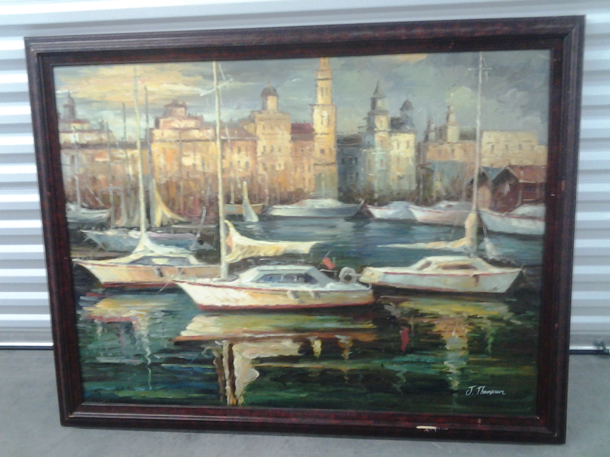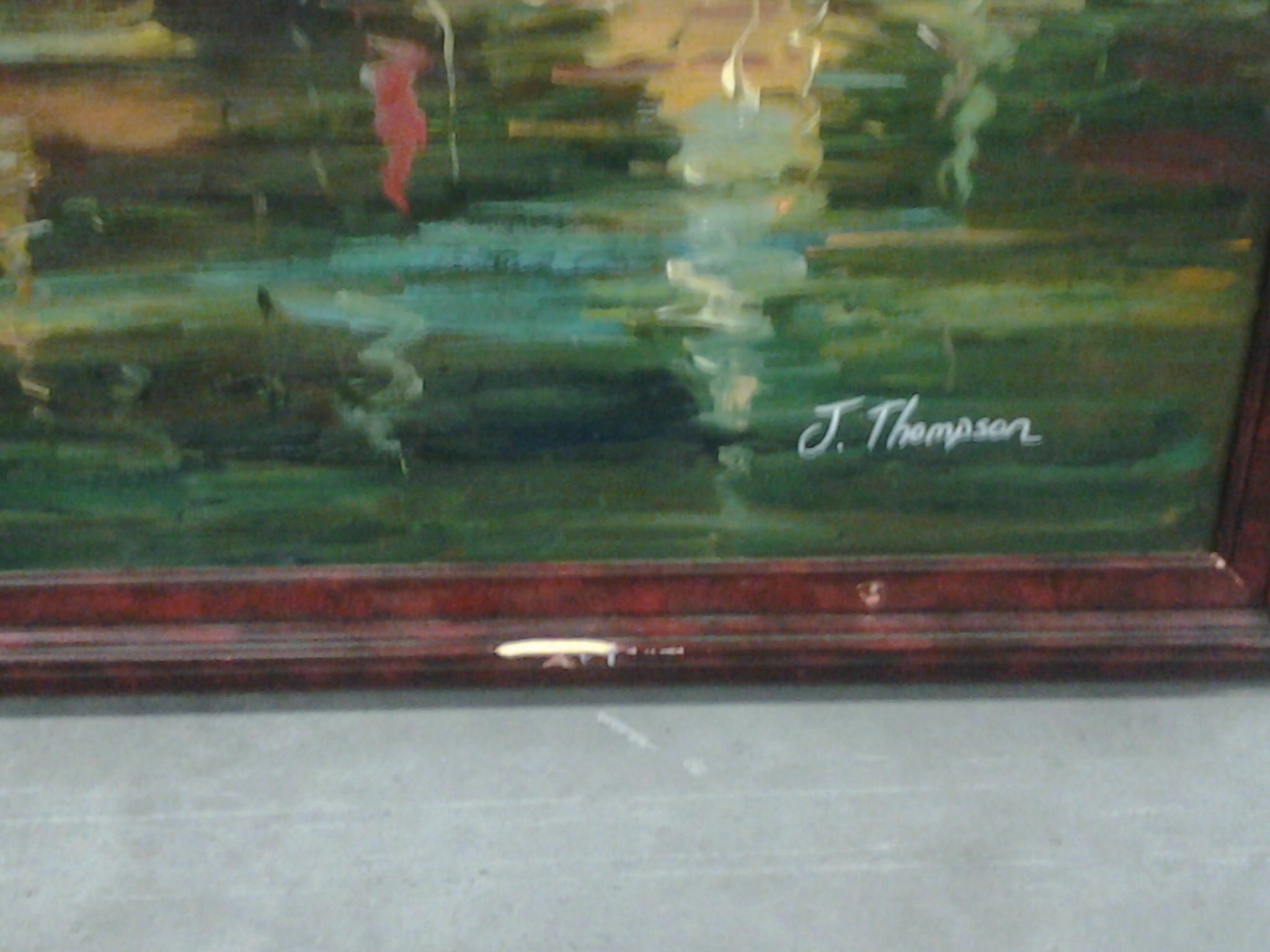 Hello, I was given this painting several years ago and am trying to determine the value and a brief history if available. This (oil or acrylic, unsure) painting is on canvas and is custom-framed. As you can see, there is some slight damage to the frame, (from moving). This is a very large painting, (approx 4x2 feet) so it is currently in my climate-controlled storage.