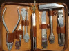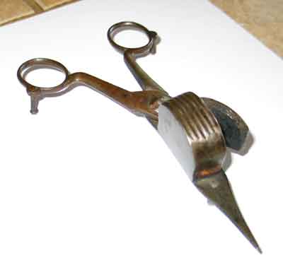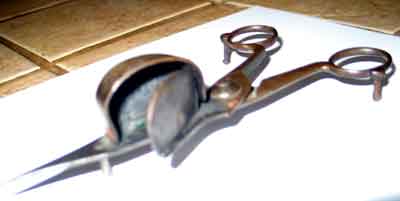 The tool must be old because the pieces are hand riveted together. As you can see in the pictures I have partially opened it. The piece that opens is the cap on what looks like a well that shows in picture 2 with several ribs embossed in it. The inside of the well looks like there may have been some charring like maybe tobacco embers or something. The sharp end has never been sharpened and is stationary. I can't imagine that it is valuable but I would like to know what it is, what it does and how old it it.