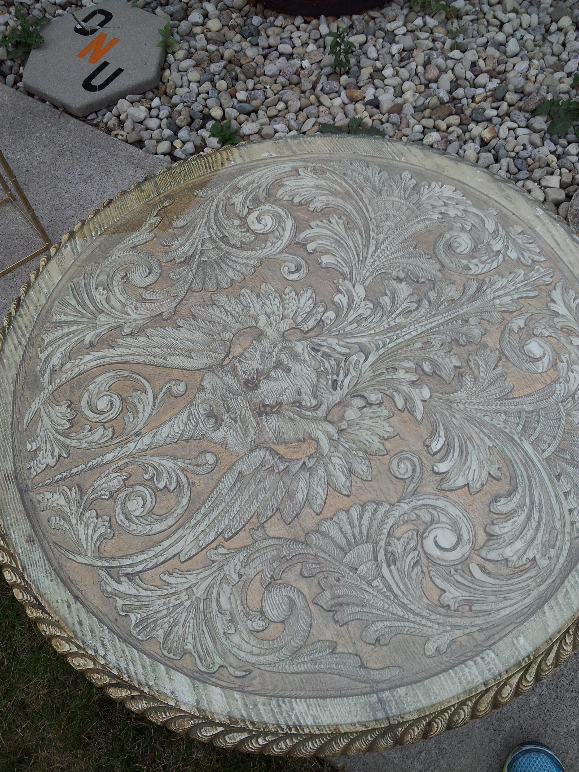 Top of table is also hand carved around the edge and across the entire face of the top. Glass top protects the top carvings. In our research we have found a very similar piece with the same base (3 claw feet), but as a "Hunters table" (I believe I found it on mrbeasleys.com).