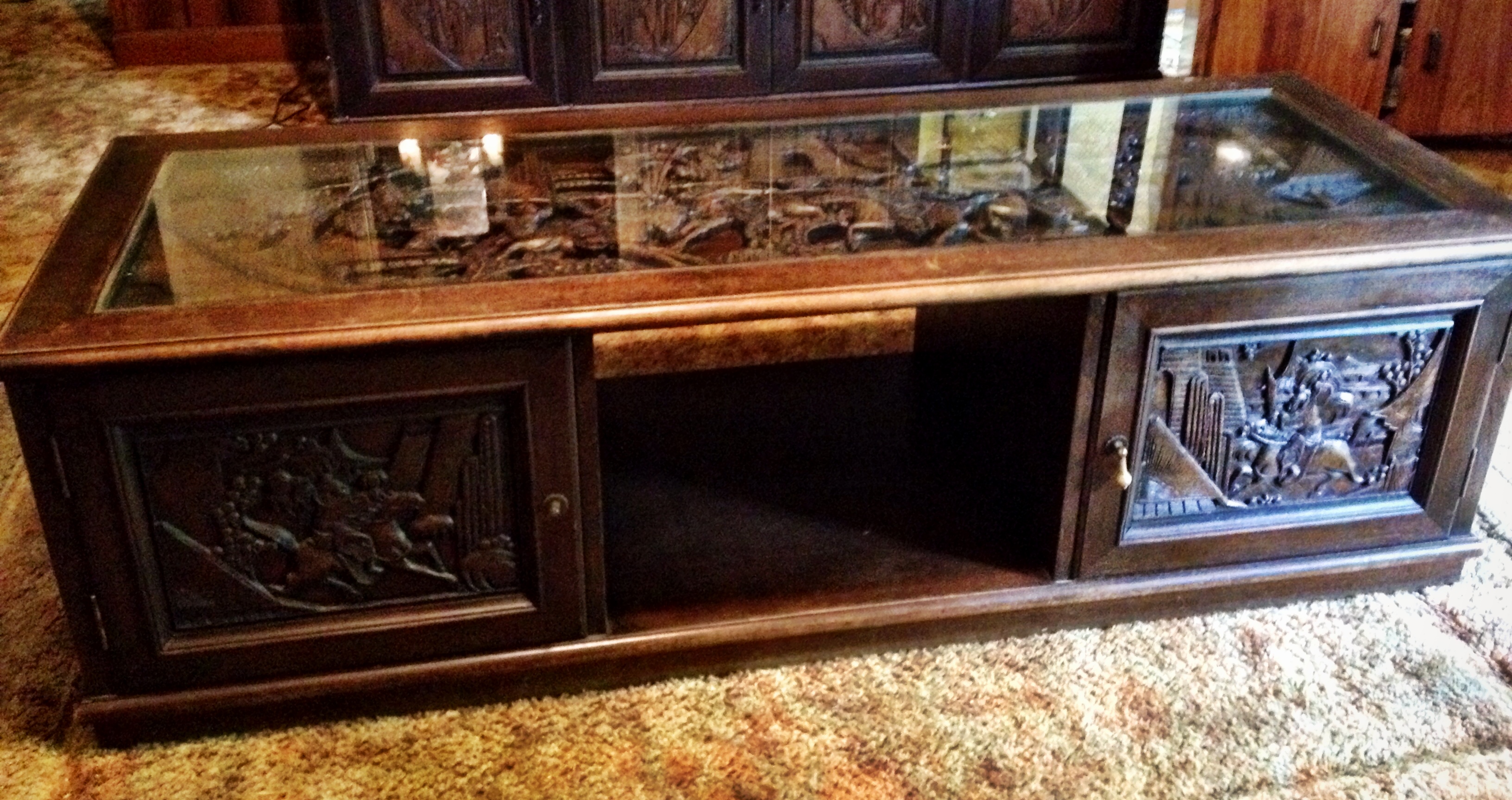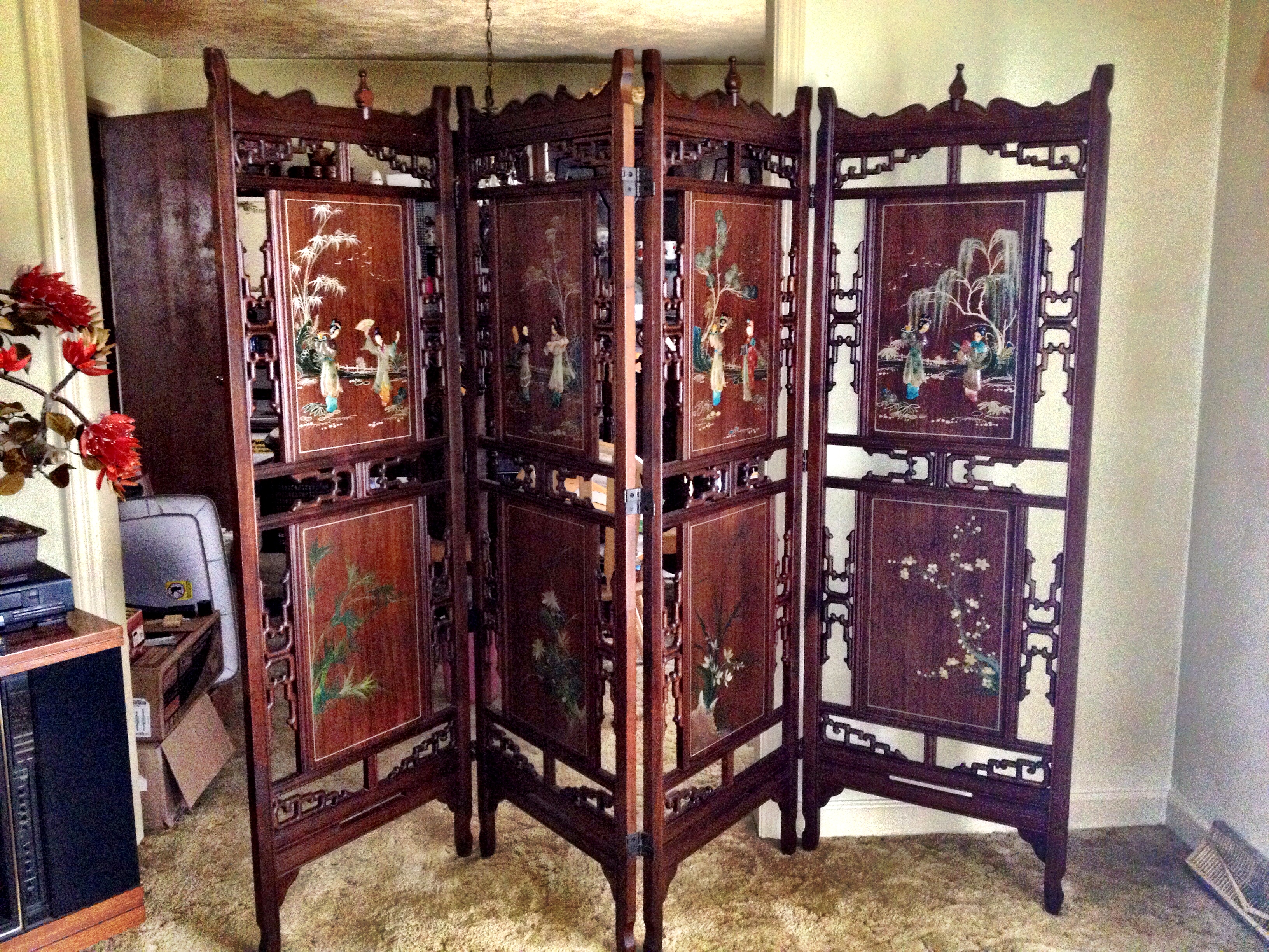 Bought in the late 1960's/early 1970's in Okinawa, Japan, my parents brought these items to Hawaii, California and now here on the East Coast. They have been taken in very good care, my mother polished them with wood polish and kept them as clean as possible. There are more piece, but I was unable to photograph them since we are moving. There is also a formal 6 person dining room set, chairs are all handcarved as well and there is a large China Cabinet with the same hand carved detail. Two side tables with glass tops, shaped in hexagons, same handcarvings underneath glasstop and on the sides. All together I believe it accounts for 15 pieces including each chair for dining table. All matching, same handcarvings and same wood. They were all bought together.