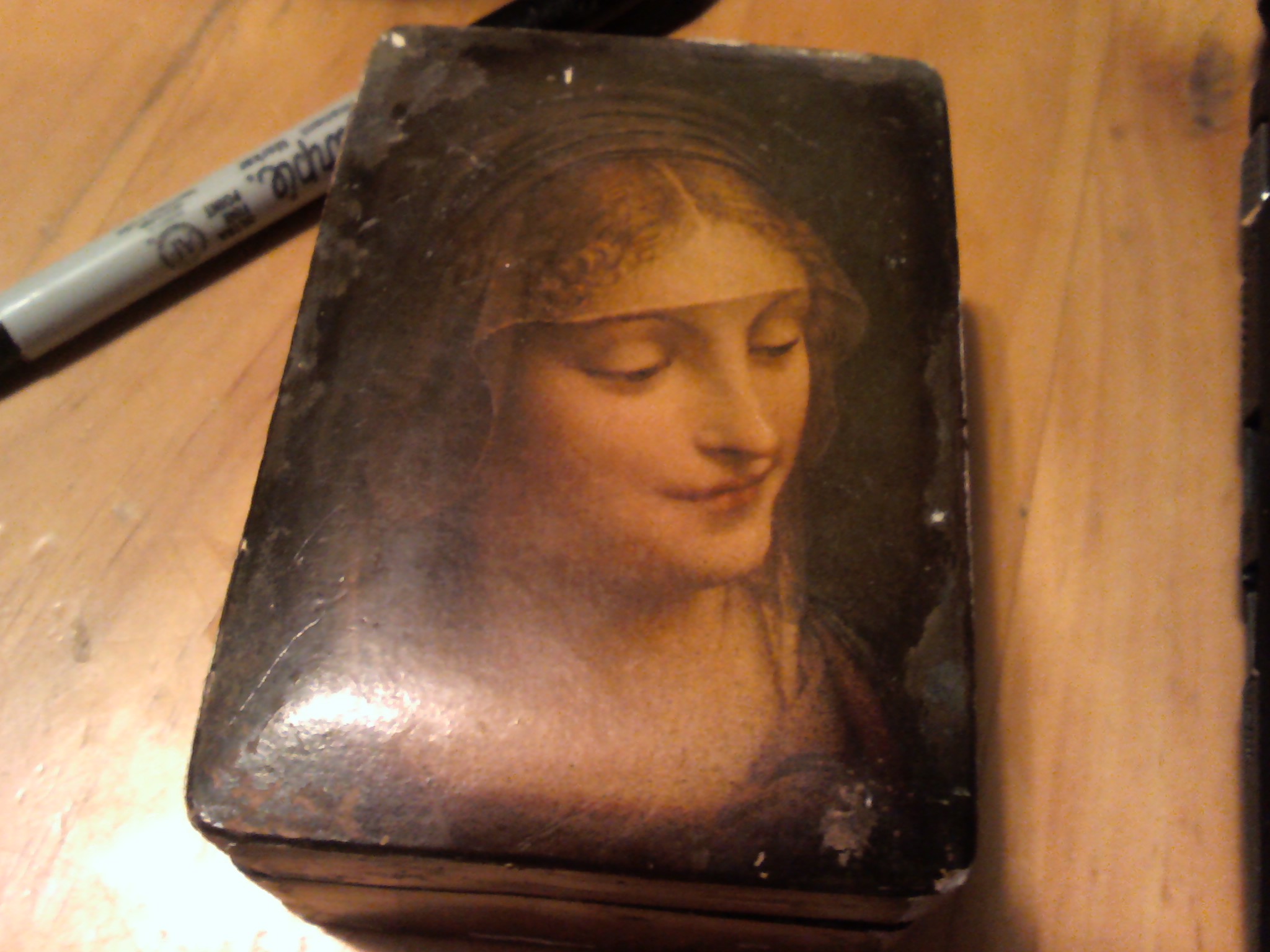 I believe it to be a handcrafted rosary box with a pic of mary magdalene.