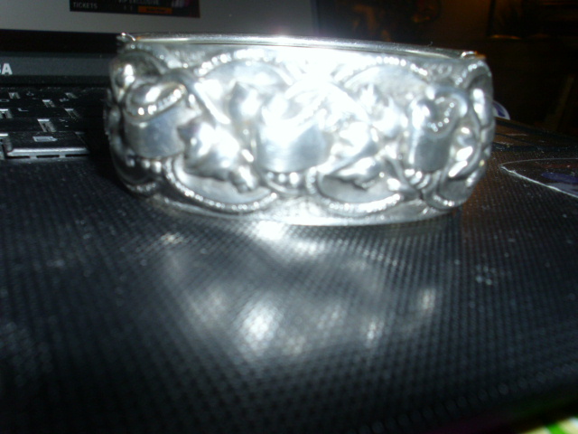 The bangle is thick and heavy looks handcrafted, The bangle has no hallmark stamps, it is unmarked, it is embossed with leaves. it also has a saftey clasp.