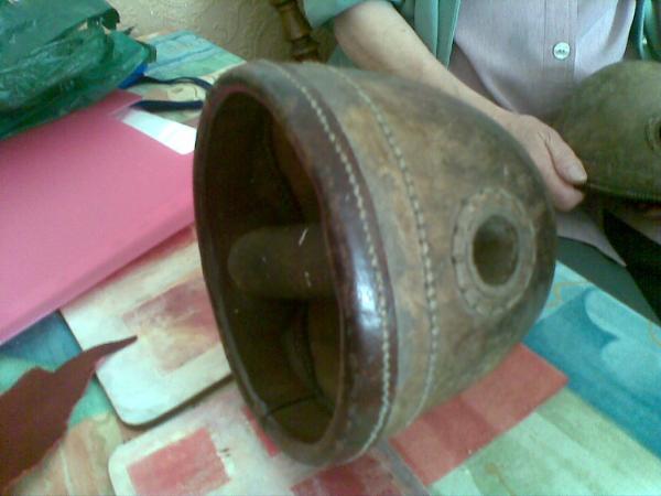 Toughened leather handheld items, obviously very old, worn on both hands as there are two of them and they look like a pair. One appears more worn on the outside than the other, almost grazed appearance. Each one has a round, smooth hard, leather handle on the inside. Obviously used for something very strenuous as the leather is very thick and strong as is the stitching, almost like the leather on a vintage cricket ball. Please help identify them as my next step is to take them to a museum.