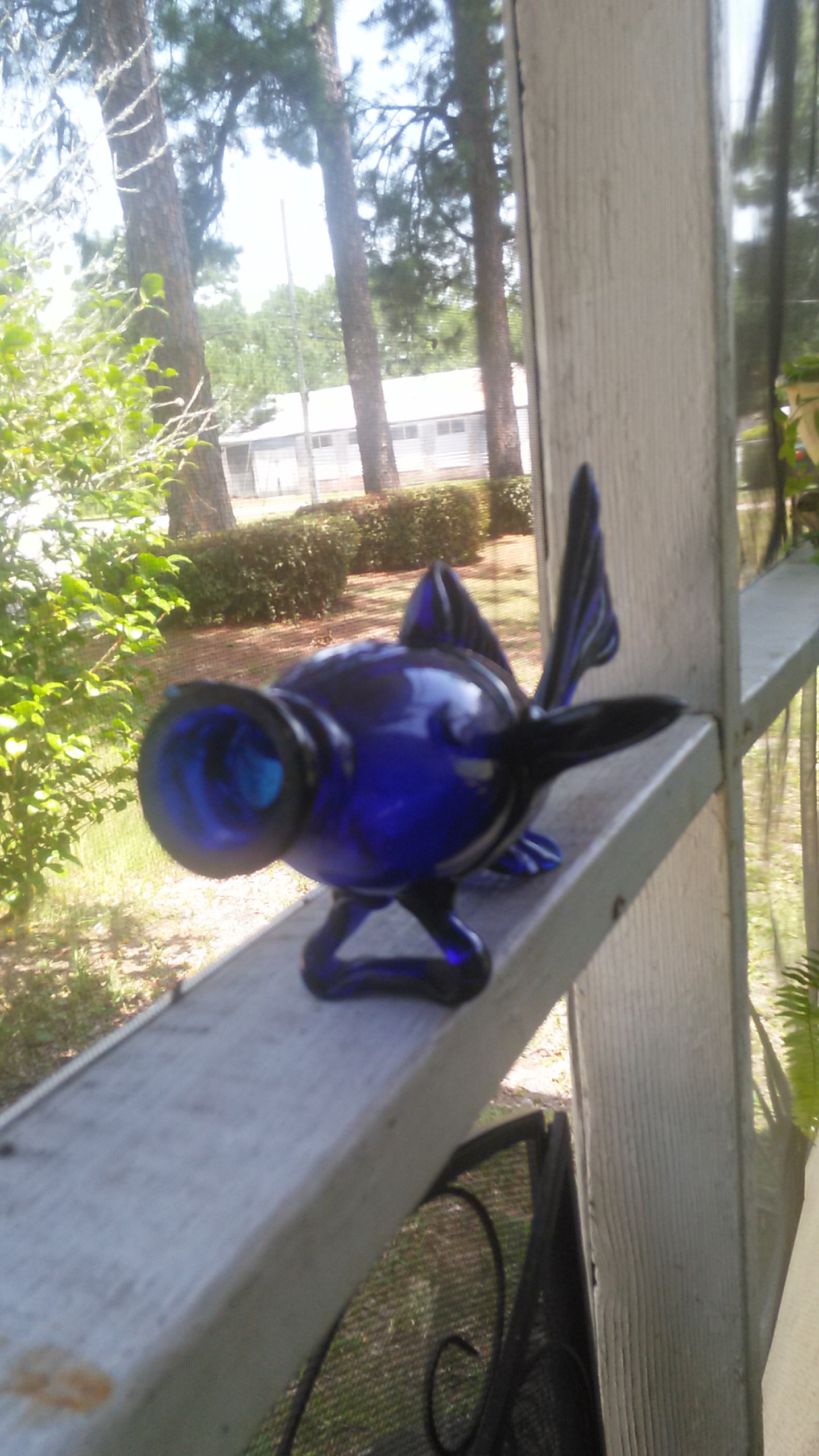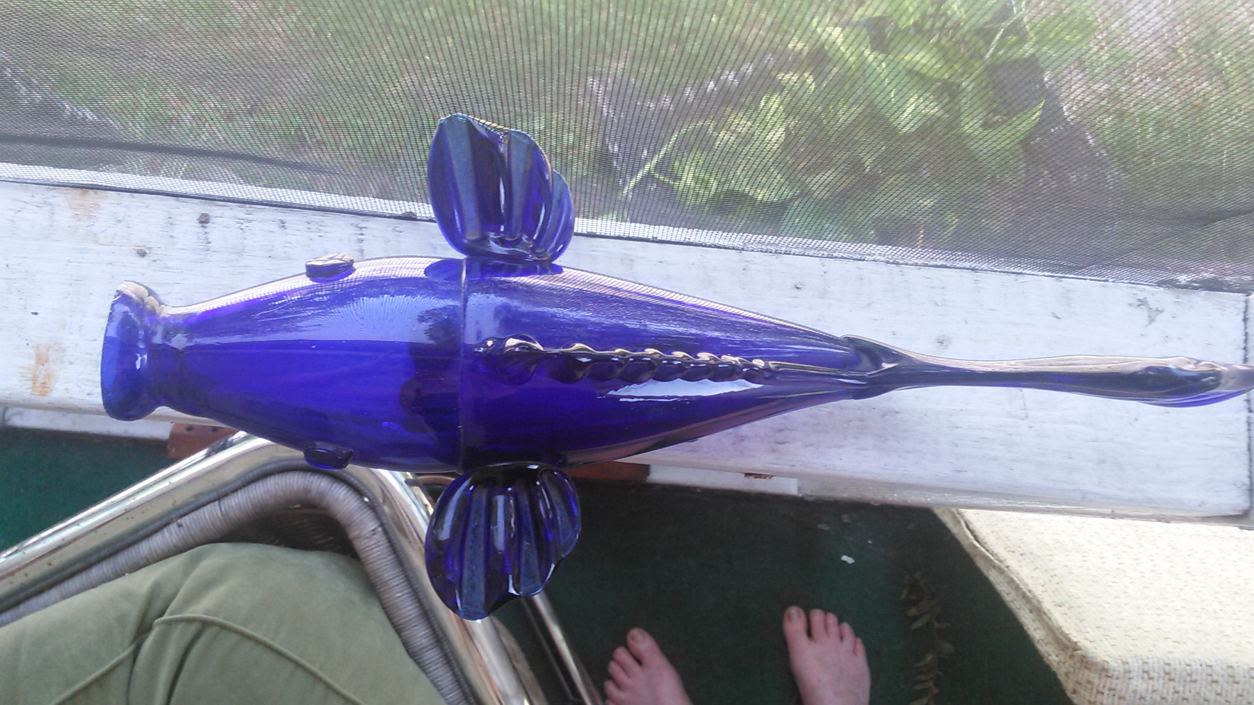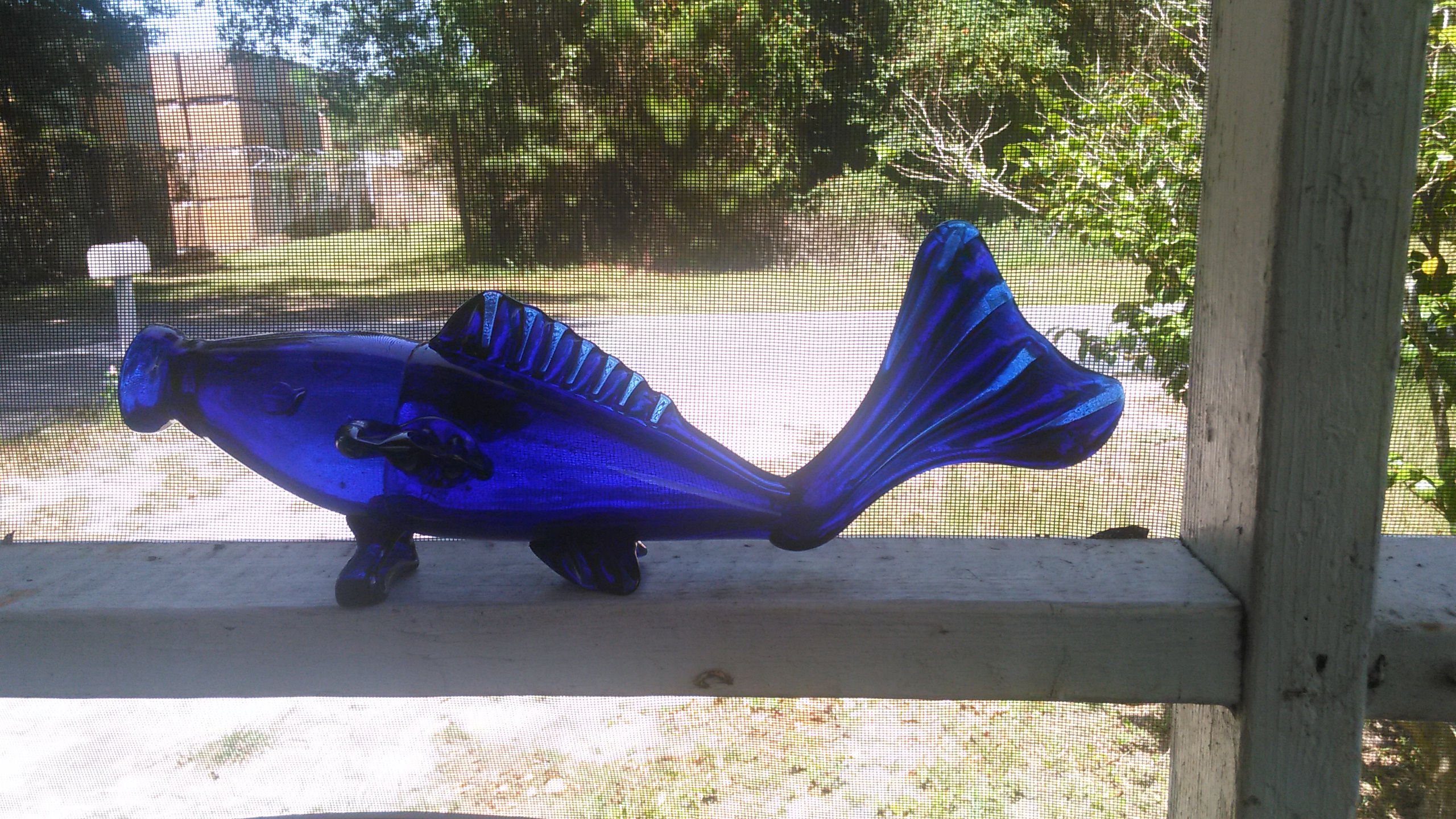 This fish looks as if two bottles were adjoined to compose bottle. No chips, nice heavy glass. I know it to be at least 40 yrs old. It has been visible to me since childhood. Measures 14 1/2" long.