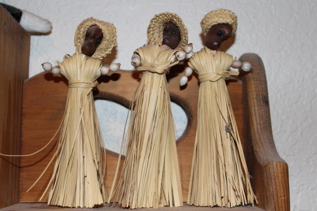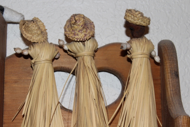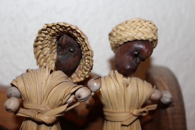This is a set of three dolls made out of some kind of straw. Each doll has a head made out of some kind of dark bean which looks like faces. They have handmade hats which are woven and are all unique to each doll.