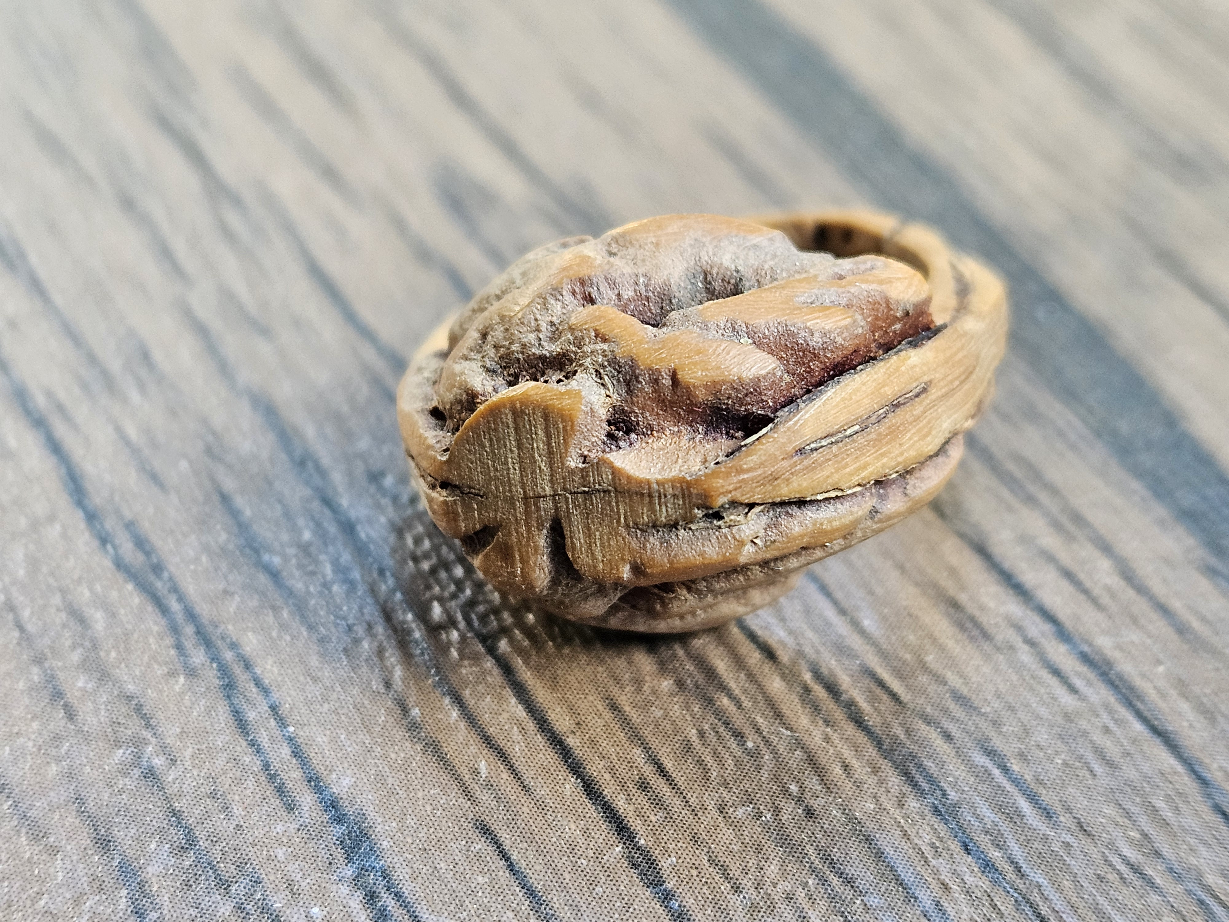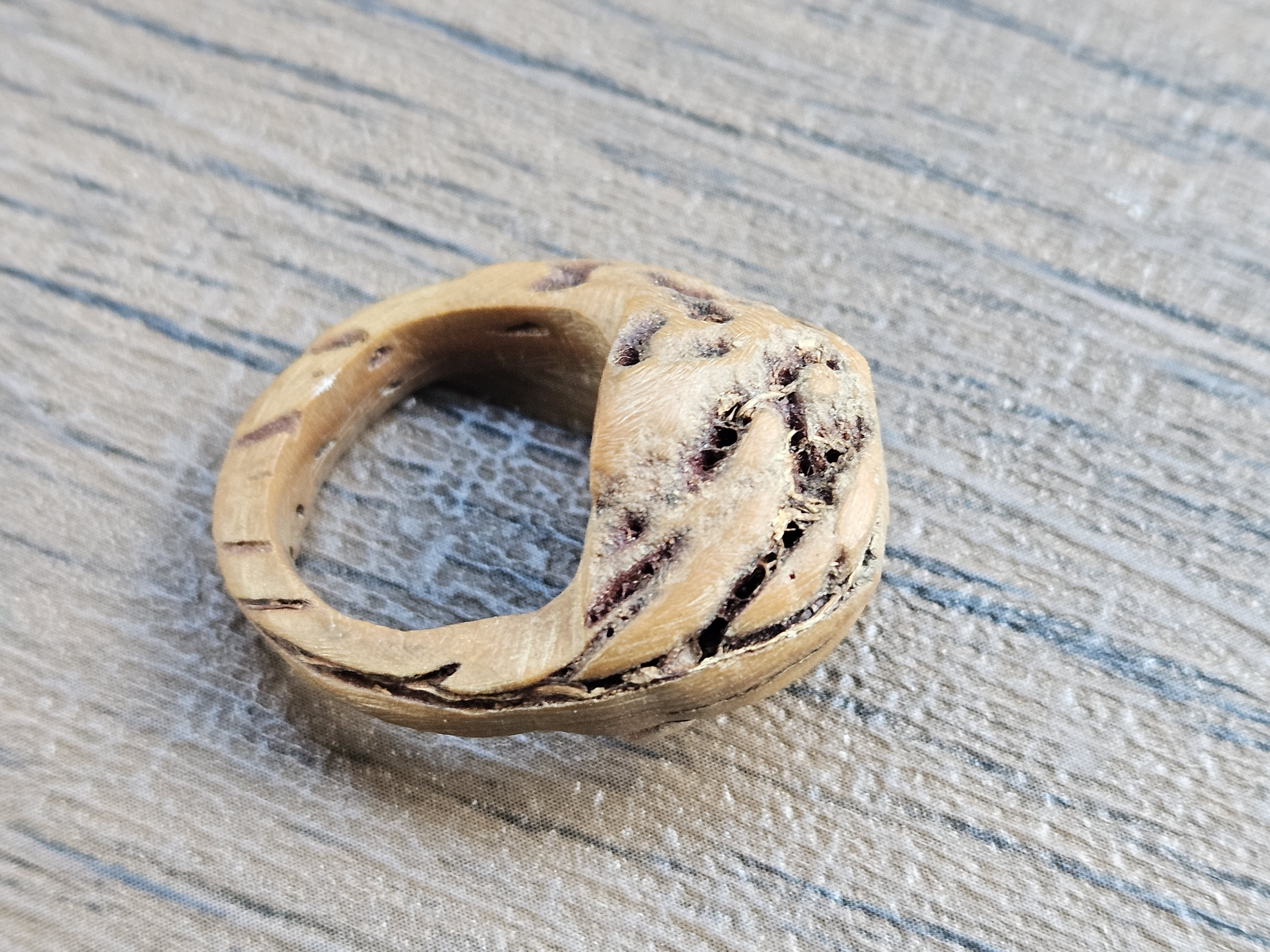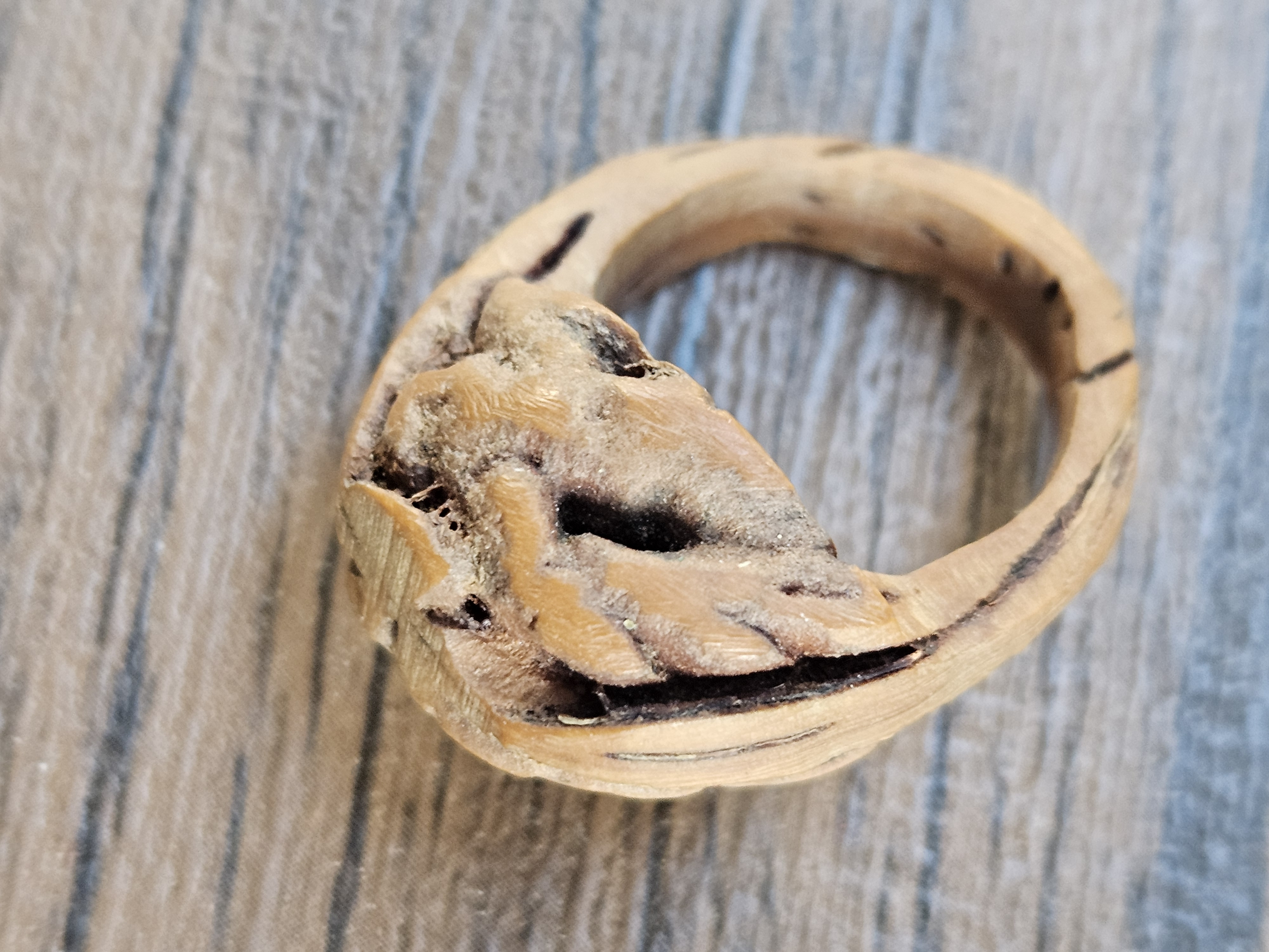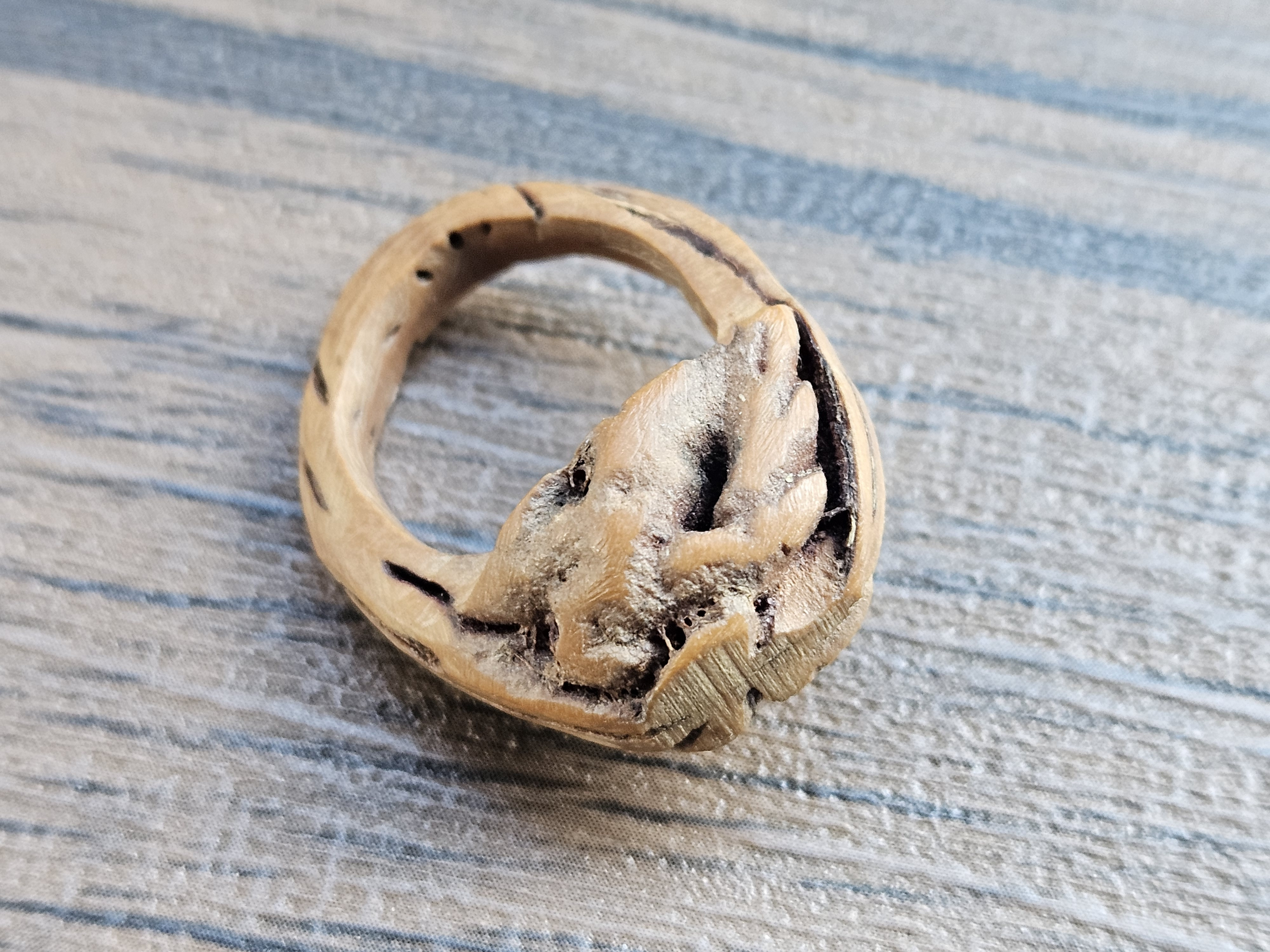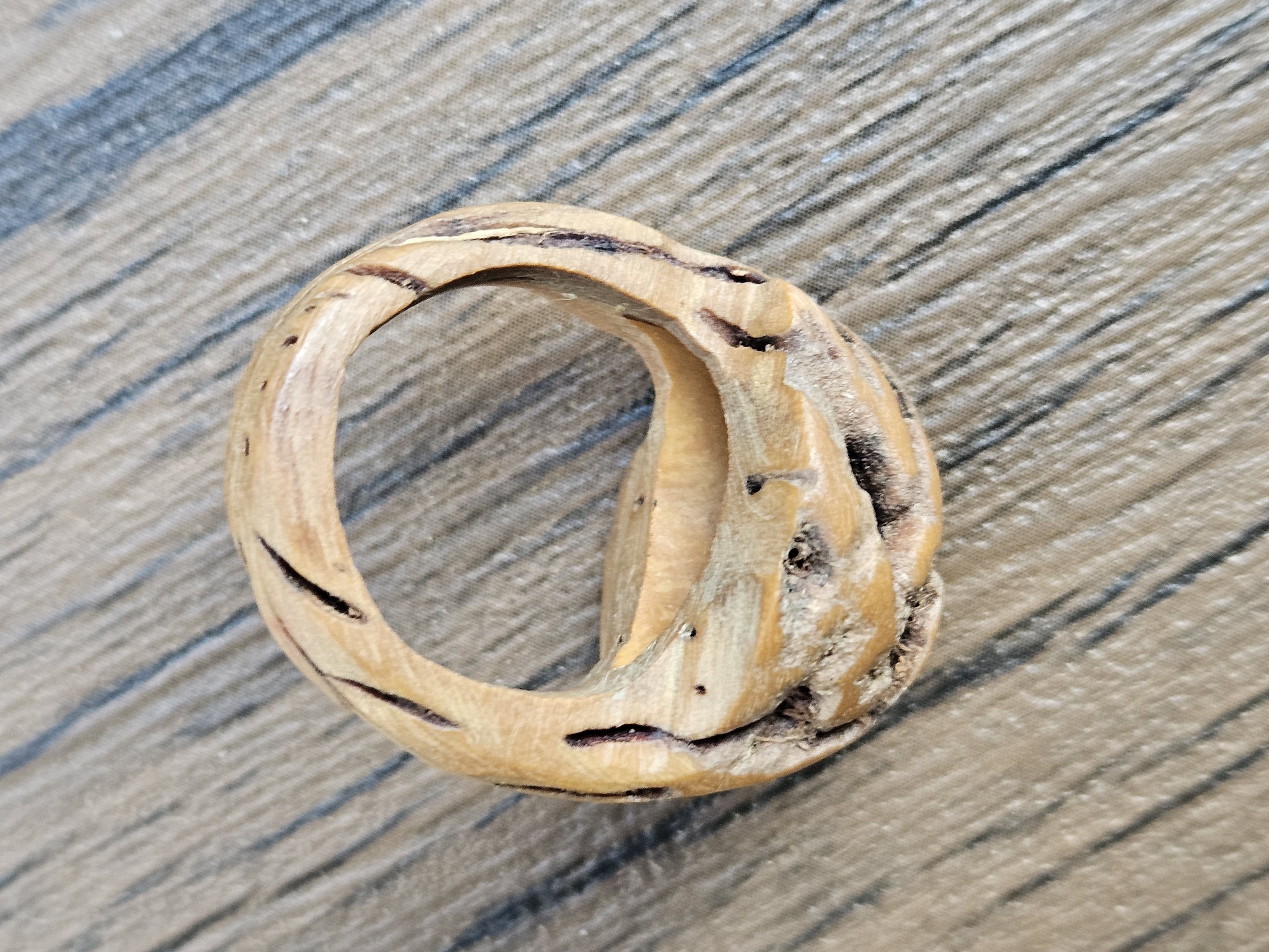 Carved rings from olive pits, peach seeds, and tagua nut were also popular in various cultures. However, this ring does not appear to be carved from a pit or nut; the scale and grain indicate it is wood, possibly lightly burled or flawed intentionally for natural aesthetic.