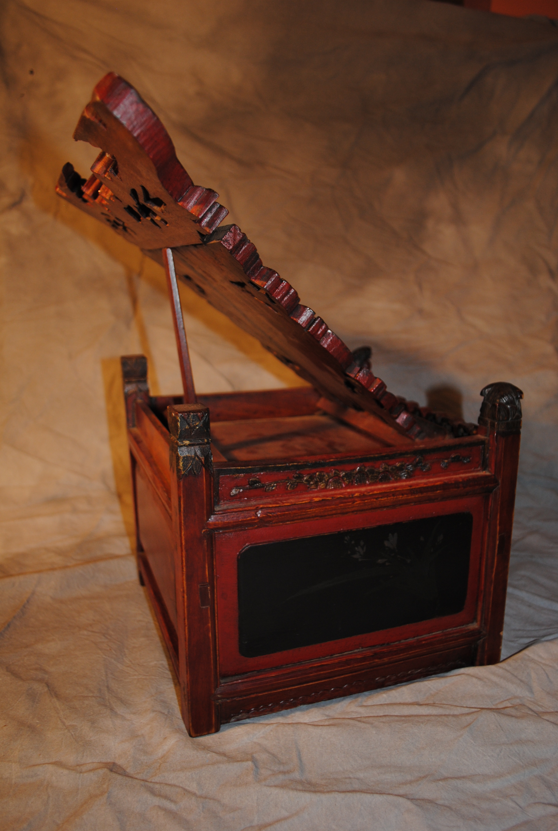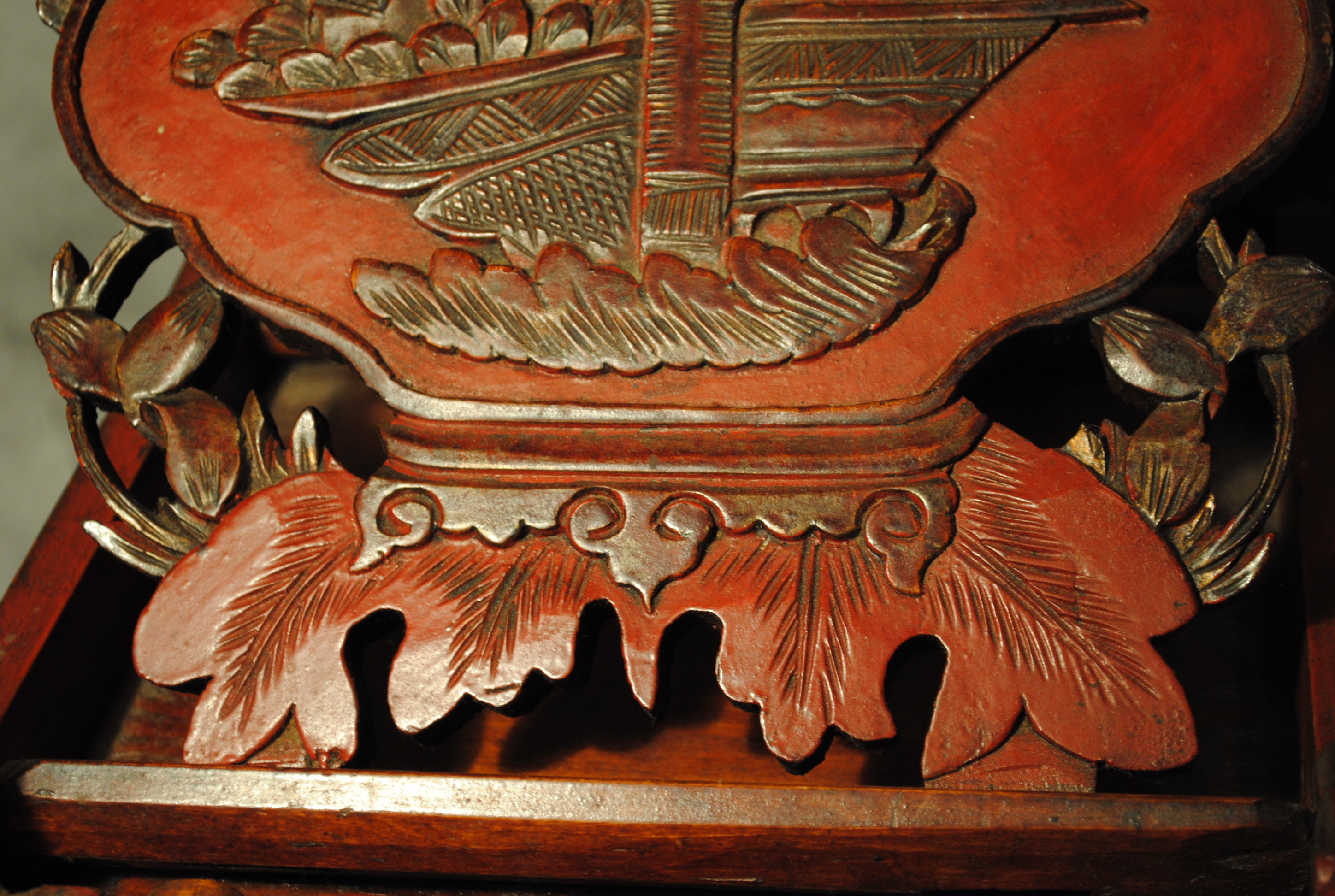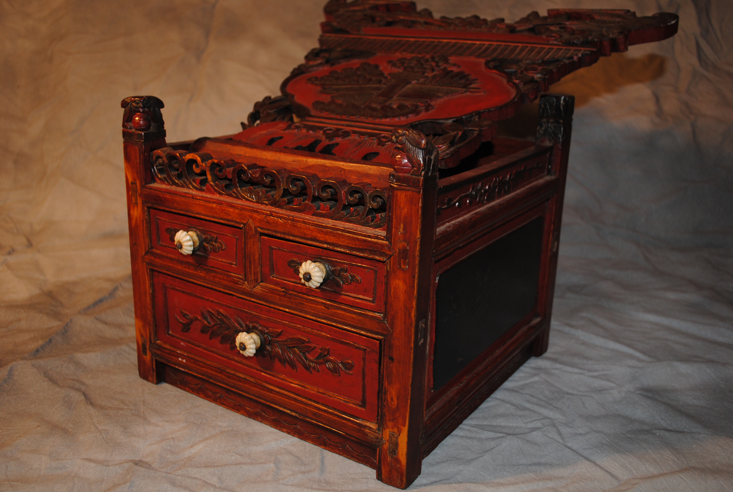 I have a handmade and hand carved asian jewlery chest that contains three drawers. The chest is obviously an antique and has handmade dove tail joints. All beveled areas are beveled by hand. On the top of the chest, there is a crest or shield that stands up and is propped up by a fold up brace. The entire crest/shield is hand carved. You can see the joint work in the pictures. There appears to be different kinds of wood used for this piece. There are also little animal figures on the corners of the front posts. The chest has a deep red hue to it and it is NOT a traditional laquer. The finish on this appears to be more of a plant dye than anything else. I have been doing antiques for years and have NEVER seen a handmade piece like this one, so any help would be appreciated.