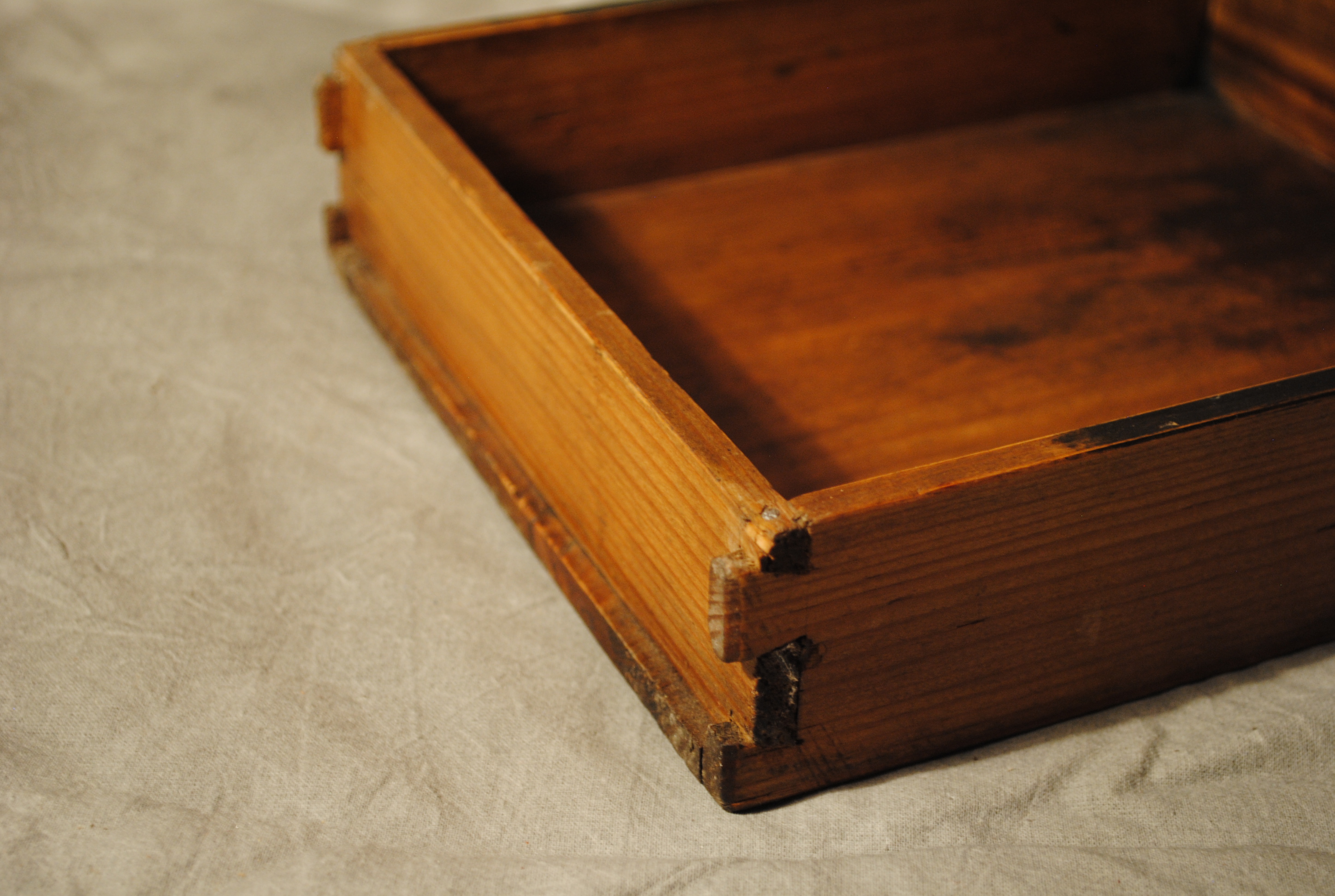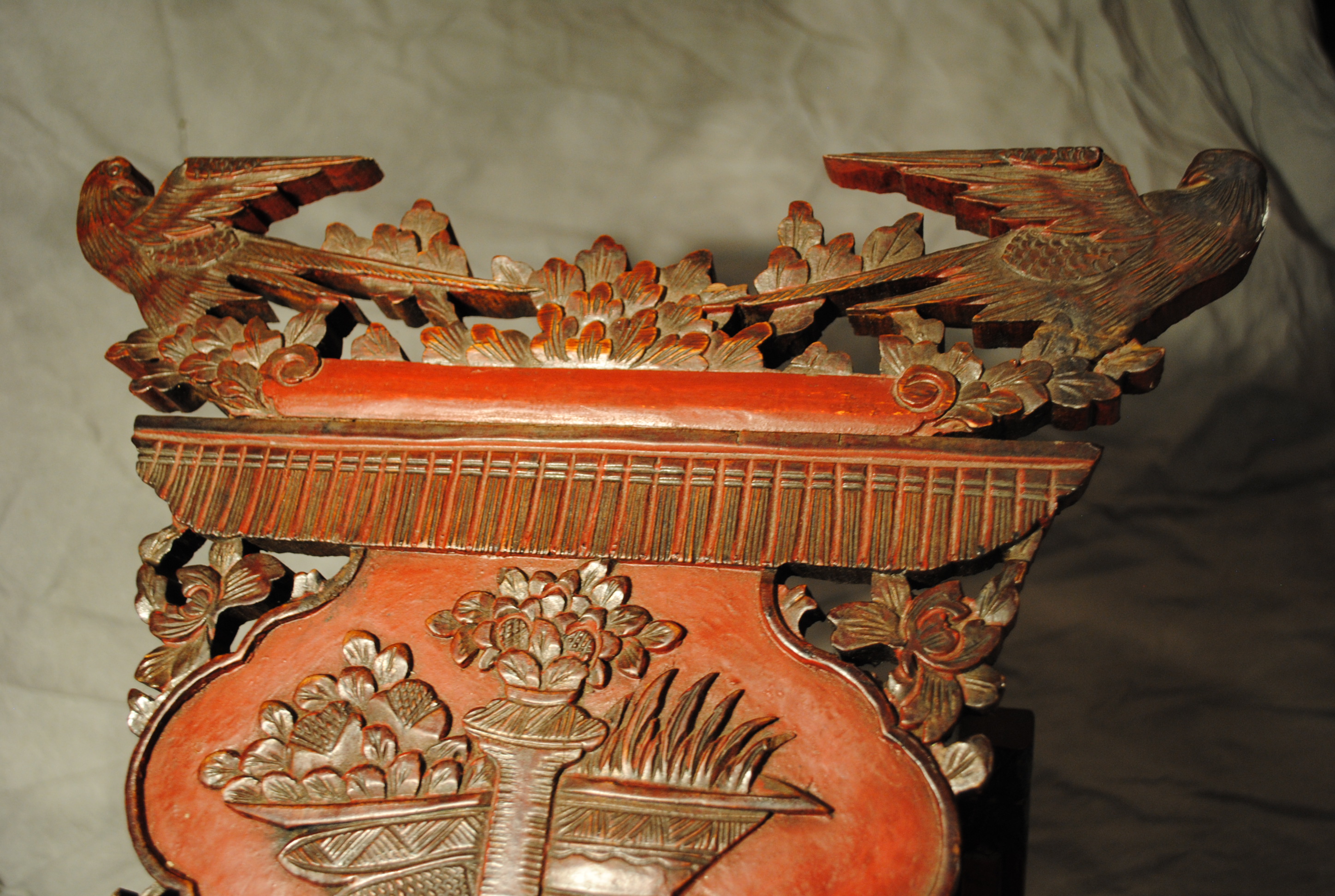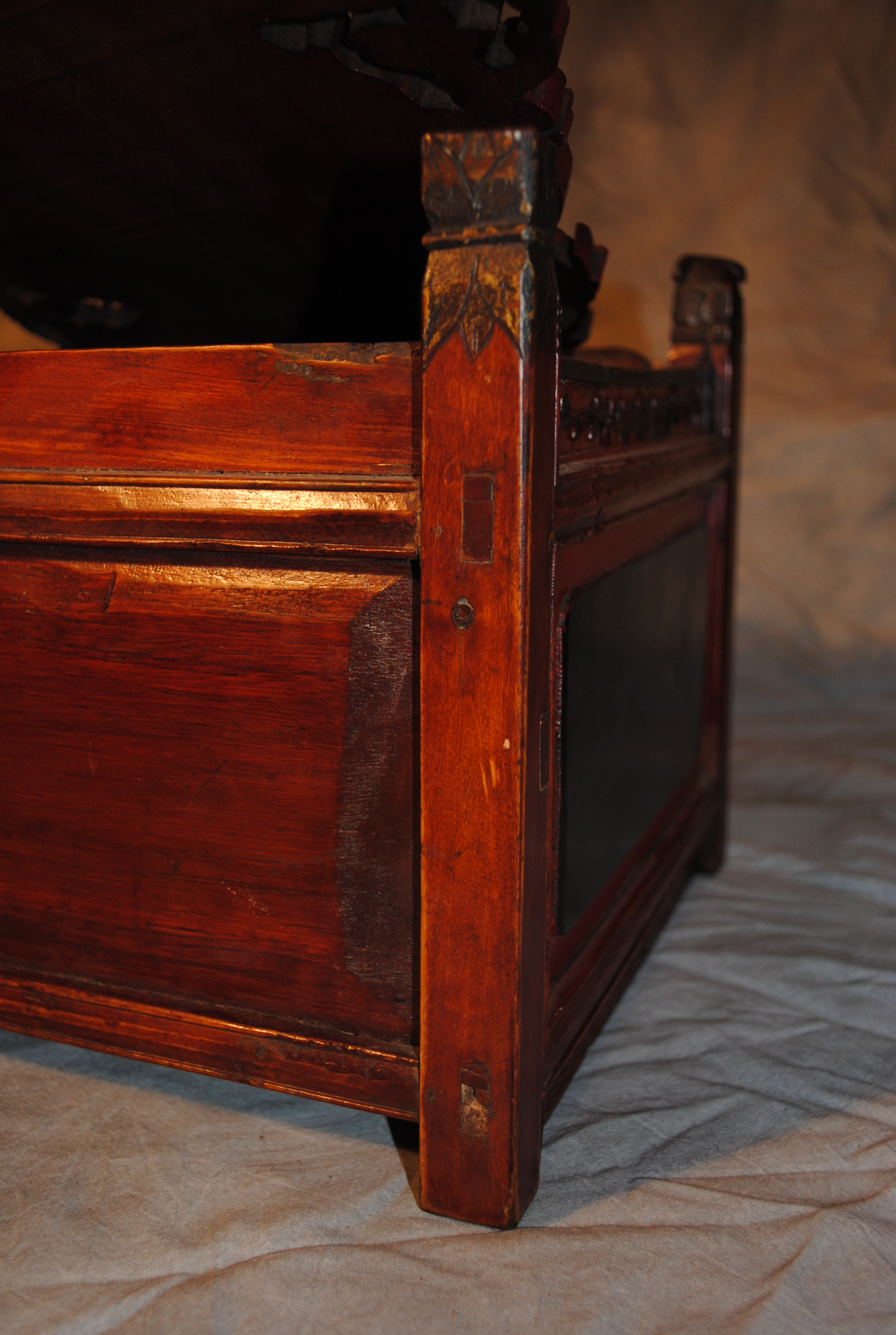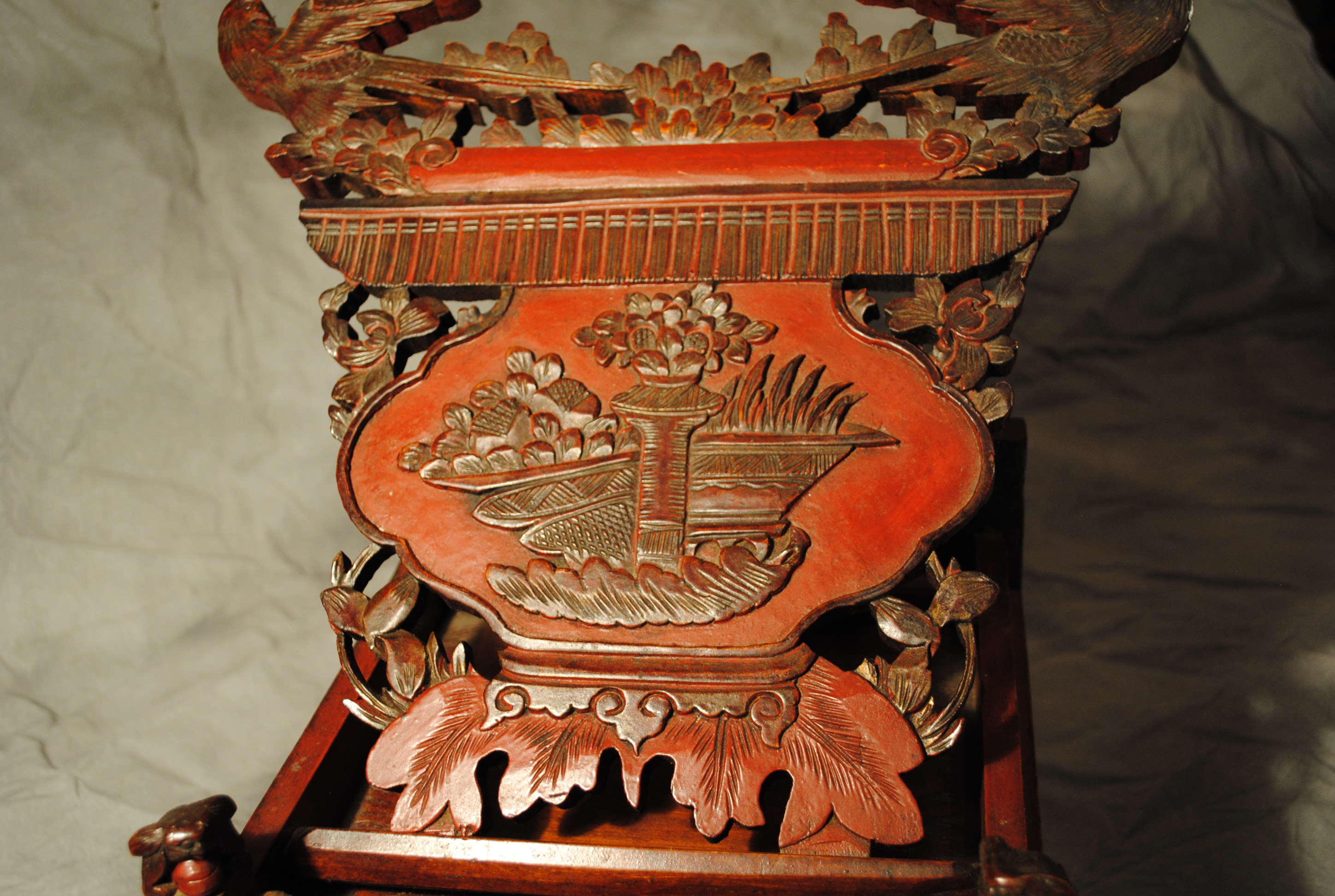I have a handmade and hand carved asian jewlery chest that contains three drawers. The chest is obviously an antique and has handmade dove tail joints. All beveled areas are beveled by hand. On the top of the chest, there is a crest or shield that stands up and is propped up by a fold up brace. The entire crest/shield is hand carved. You can see the joint work in the pictures. There appears to be different kinds of wood used for this piece. There are also little animal figures on the corners of the front posts. The chest has a deep red hue to it and it is NOT a traditional laquer. The finish on this appears to be more of a plant dye than anything else. I have been doing antiques for years and have NEVER seen a handmade piece like this one, so any help would be appreciated.