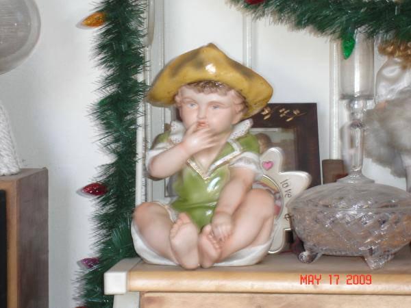 Porcelain Handpainted approx 14" boy with feather in hat and gold trim outfit numbered 6639 on bottom