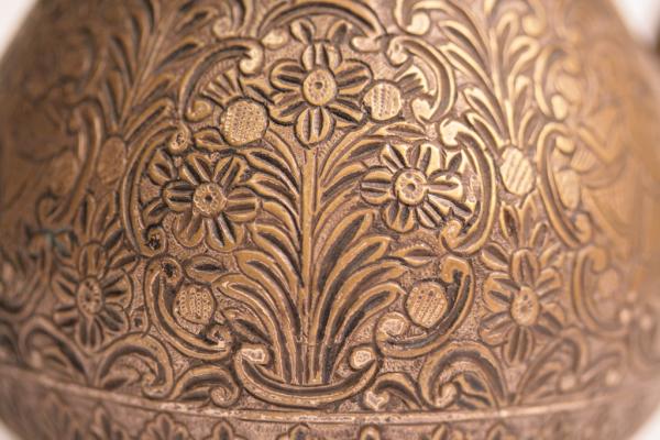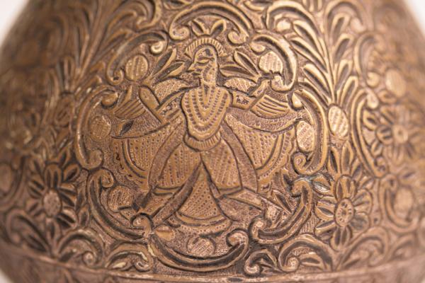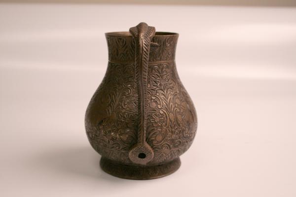 Bronze vessel with cobra handle. All markings are irregular and appear to be hand-etched. Handle appears to be hand-riveted to body of vessel. I'm told this piece may be of 19th century kashmir origin, but am seeking confirmation of that if anyone can help...