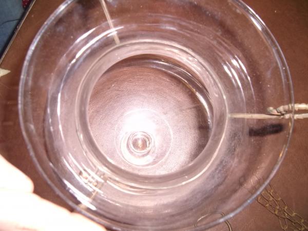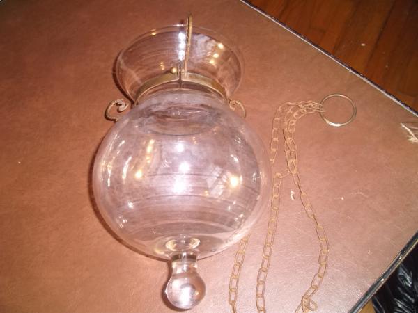This hanging Hurricane lamp is in perfect condition, My grandfather believes its over 100 + years old. it is hand blown glass. it has no chips, or cracks. and when you thump the glass it rings like a bell. and is extremley well made, it took my father over 5 hard puffs to blow out the candle inside. it does come with the orgional chain hanger. In perfect condition. pictures speak for themselves!