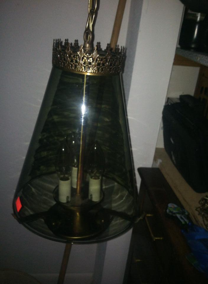 Hanging light fixture, smoked glass, 3 candle like bulbs on the inside.