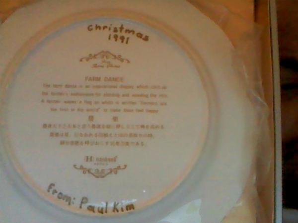 Fine bone china made by Hankook. Has a picture of farm dance with meaning of farm dance on back of it.Three birds are on front of box flying,with Hankook england original tech in corner of box. I can email better pictures.