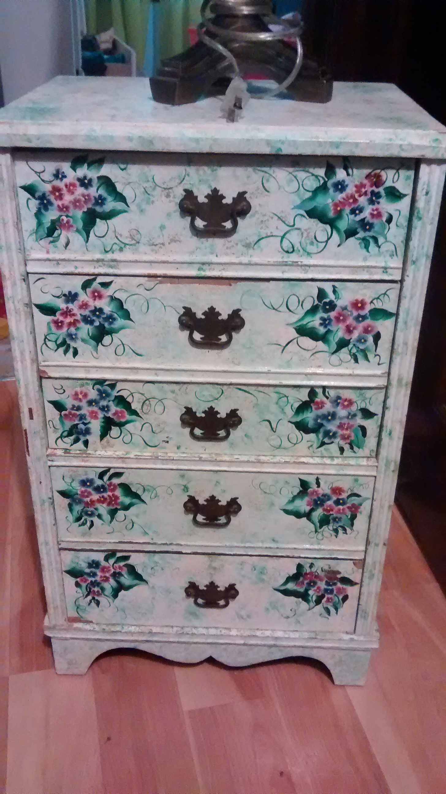 I have a dresser that is about 3ft tall it appears to be hand painted. It does have some paint chipping here and there. It is white with green and gold blotches and has flowers painted on the drawers. On the bottom of the dresser there is the Hanson clock co. Label and Rockford IL. I believe this is fairly old and I'm wondering what this could be worth?
