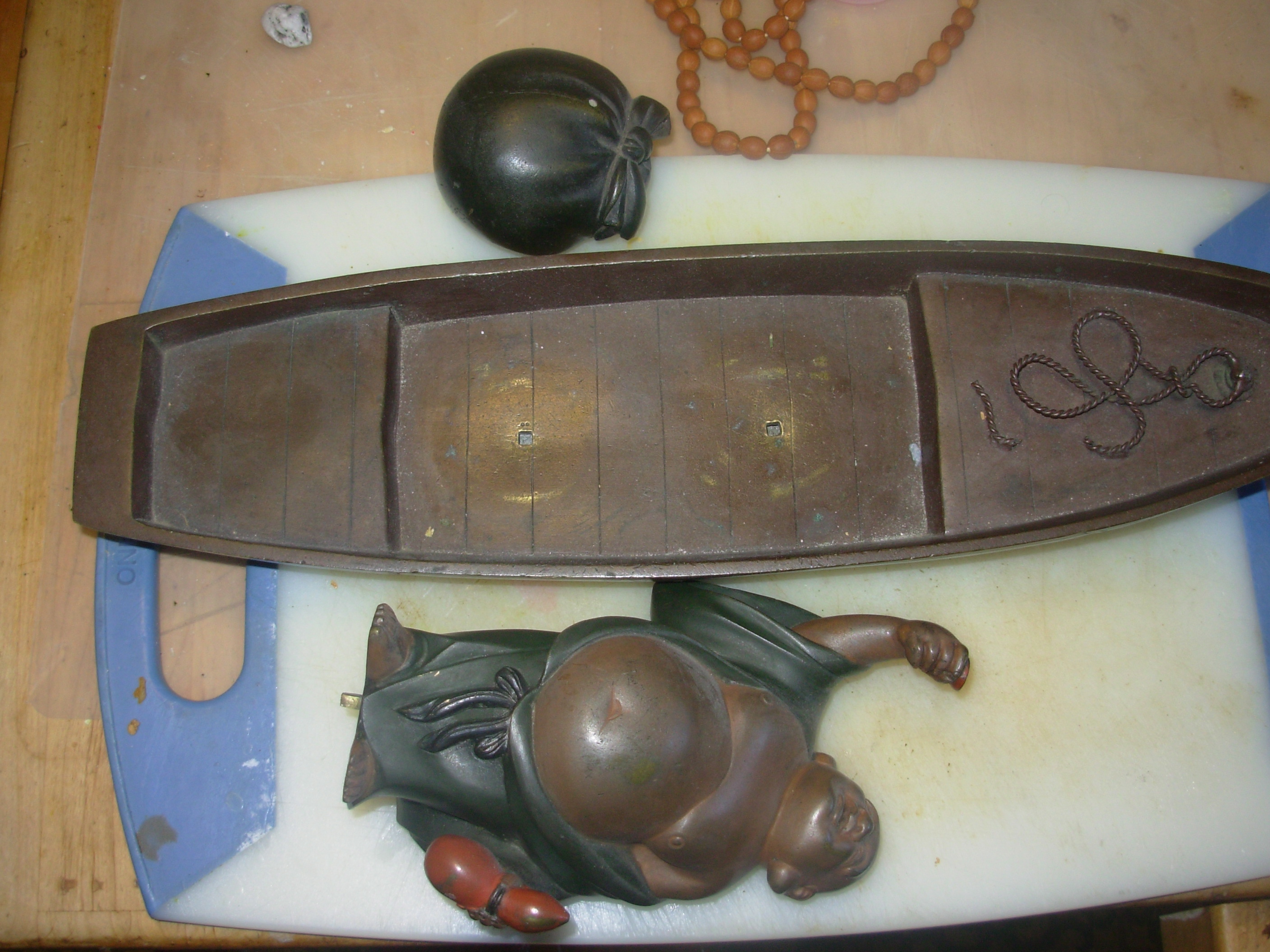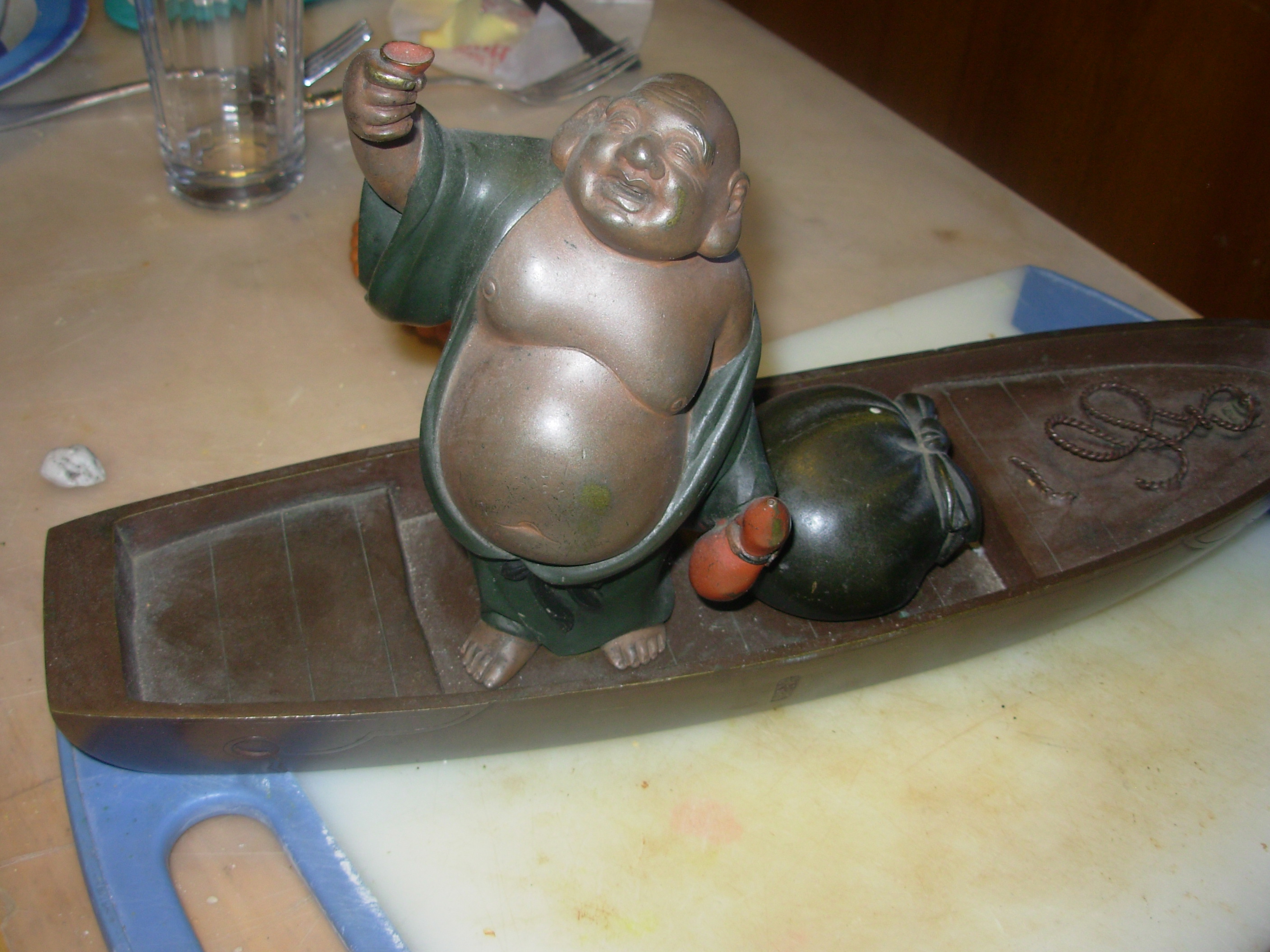 could be a buddha not sure, a man raising a cup, has a bag with him on a boat. it comes apart and you can change the position of the man and the bag.