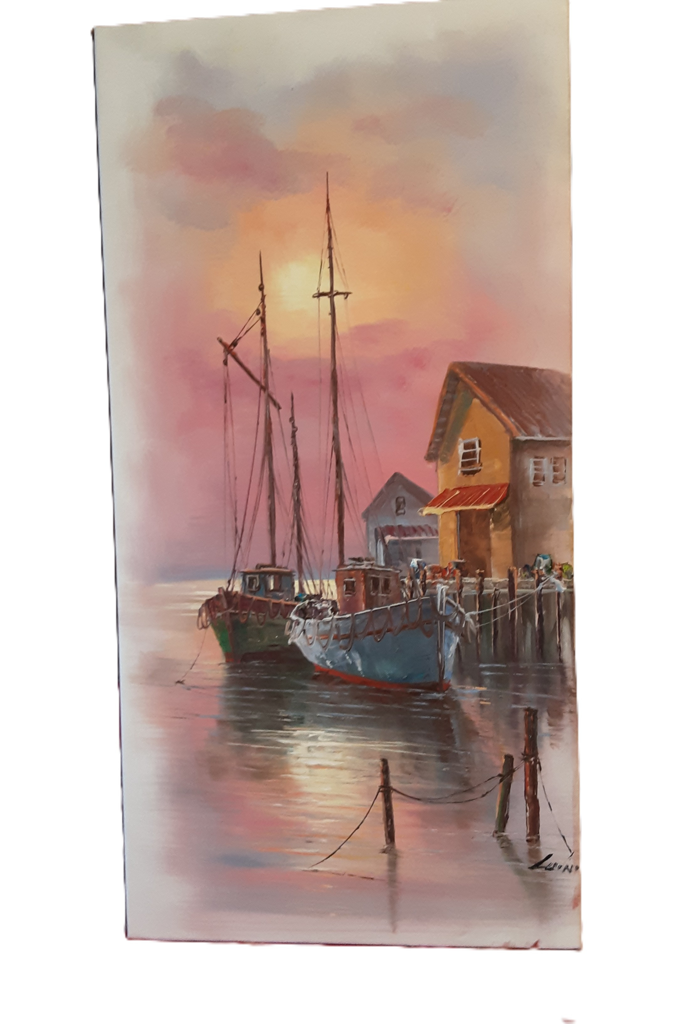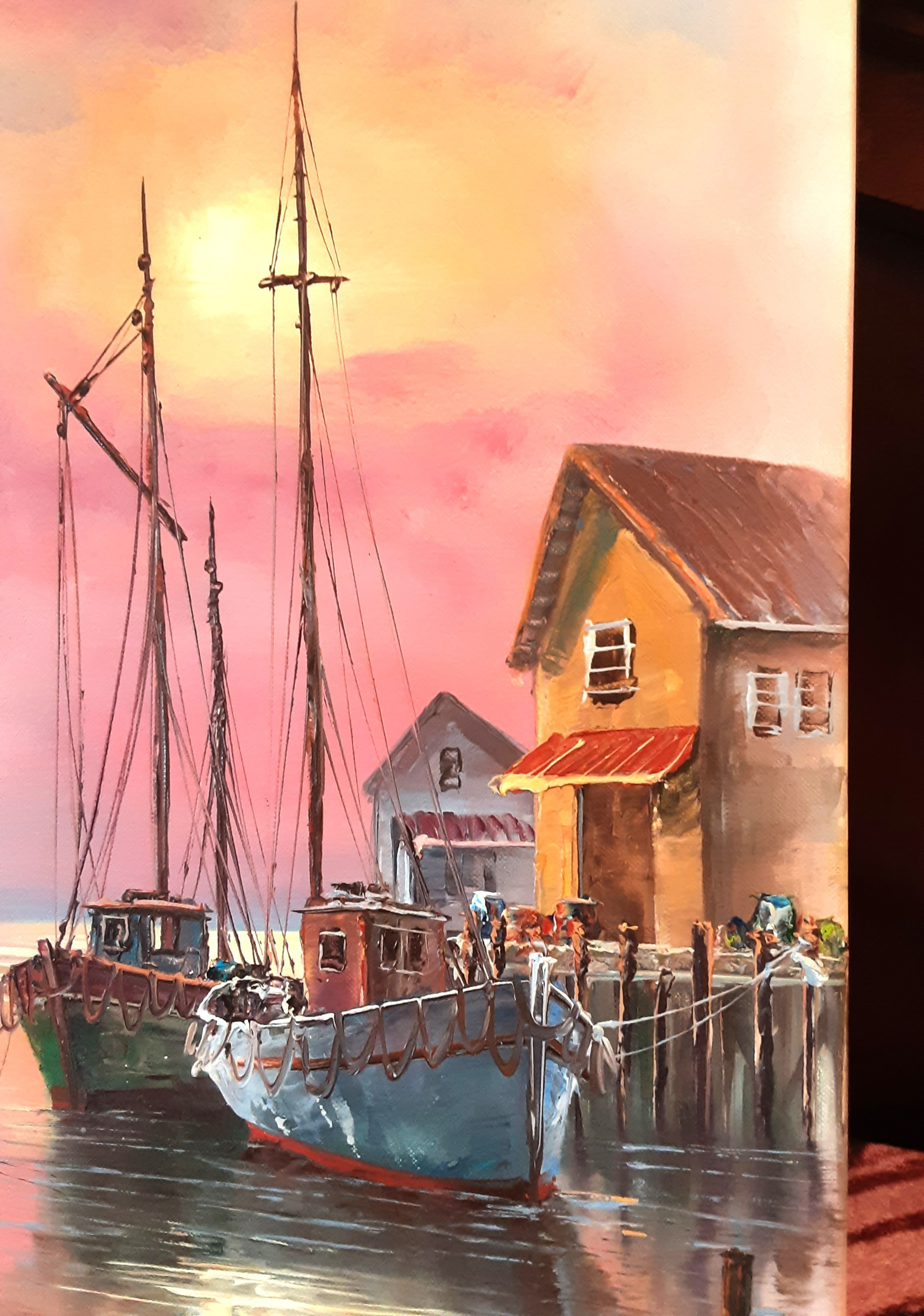 This original oil painting by the late American artist John Luini captures a serene coastal harbor scene. The work features two moored fishing boats beside a wooden dock with buildings lit by a warm, glowing sunset. The sky is rendered in romantic hues of pink and orange, with delicate reflections mirrored in the calm waters below. The dock scene is populated with fine details such as mooring lines, figures, and rigging—elements typical of Luini’s picturesque maritime compositions.