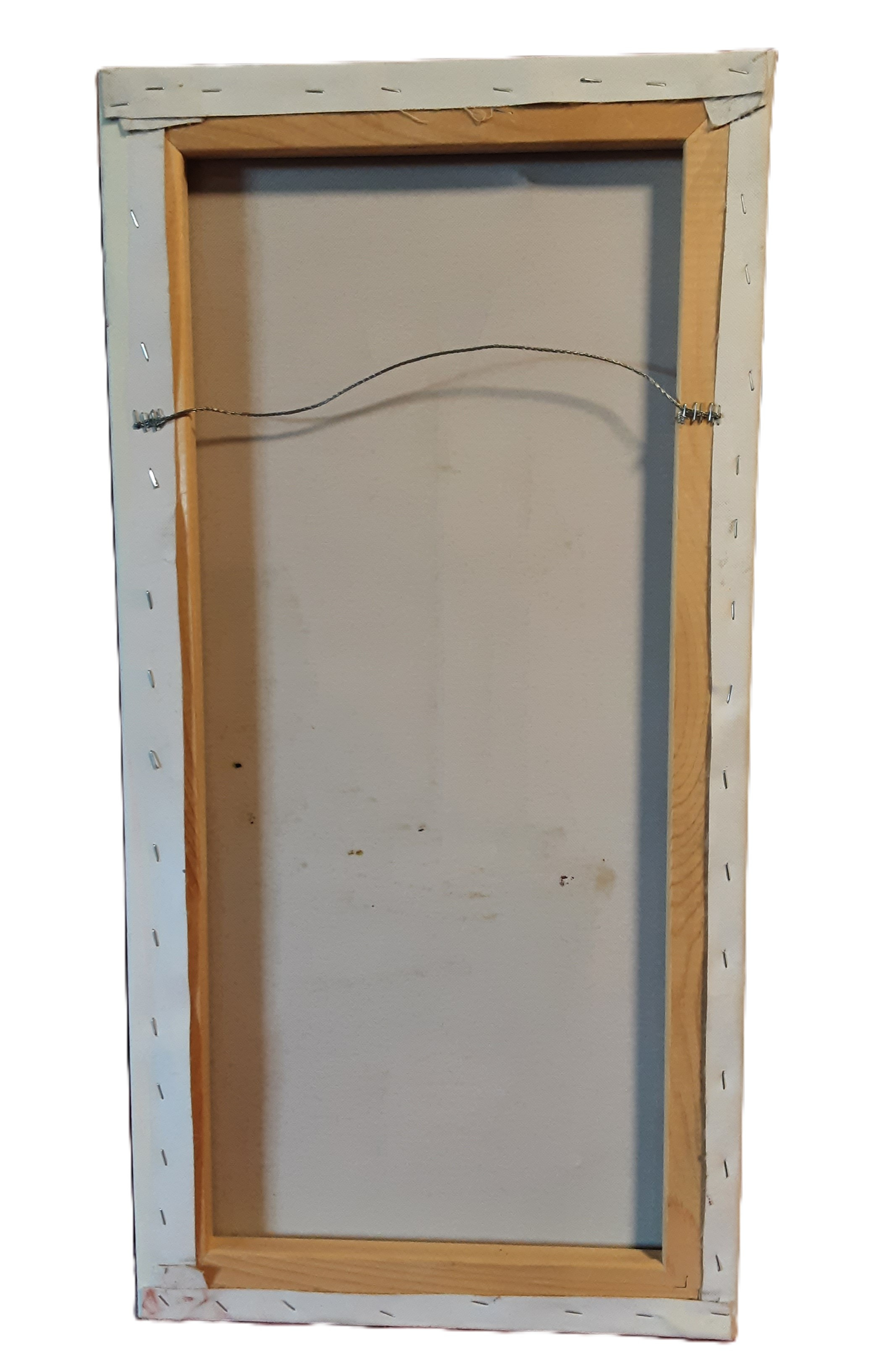 The canvas is unframed but well-stretched and wired for hanging, with painting continuing onto the right edge—indicating that it was likely designed to be displayed without a frame. The back is clean, showing signs of age but no apparent damage.