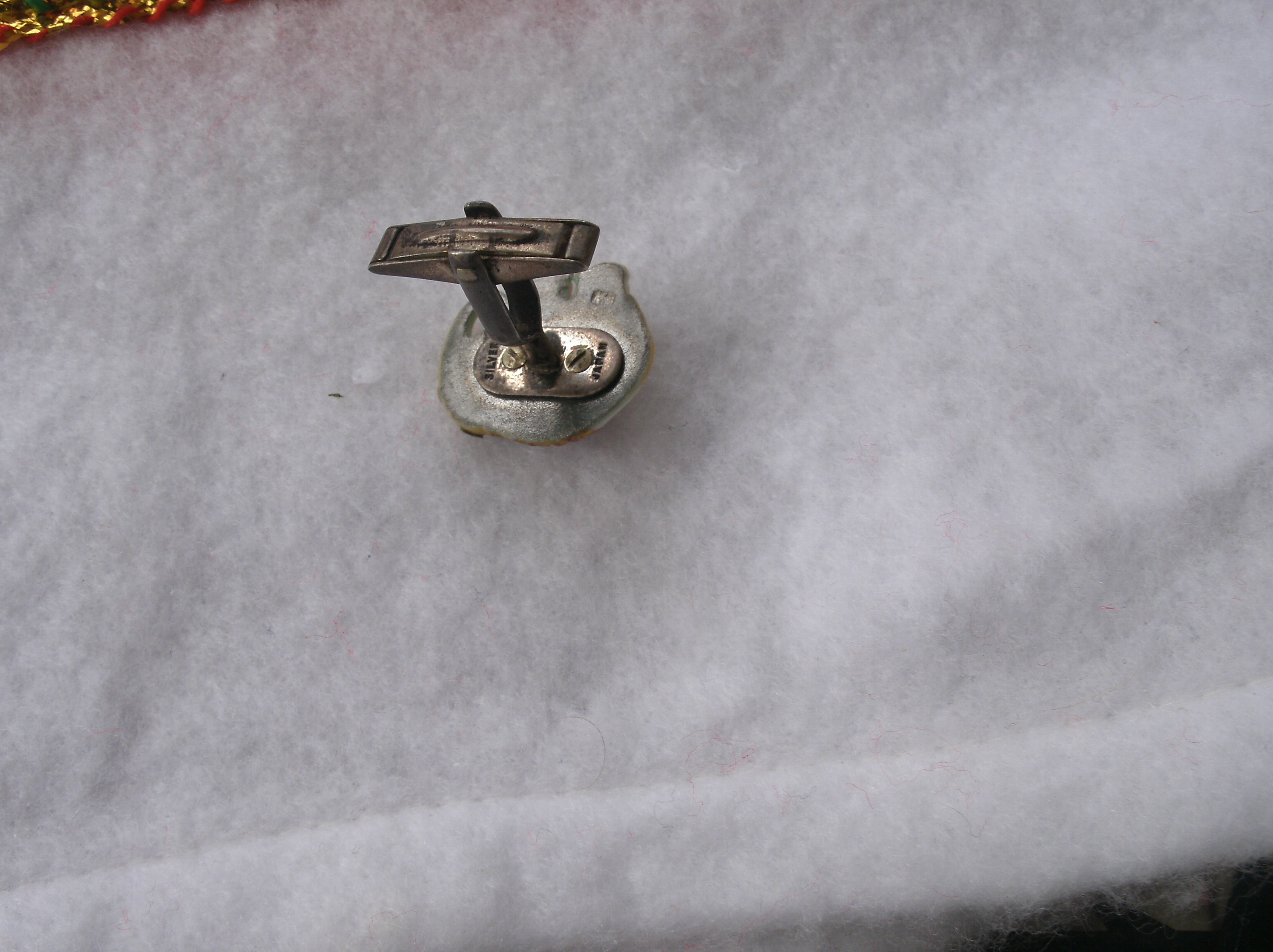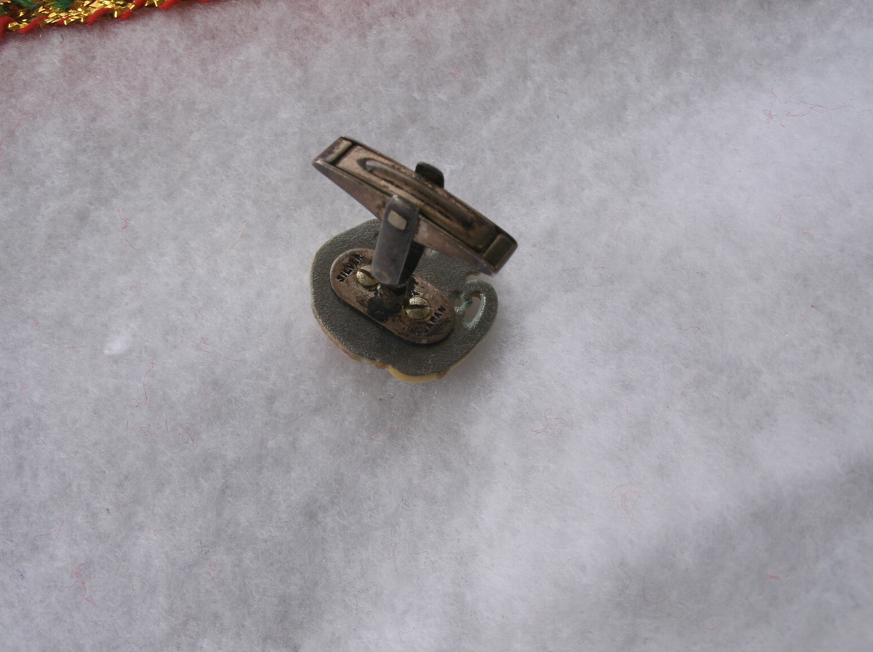 I have a pair of cuff links that look to be handcraved and handpainted. They may be ivory or bone but not sure exactly. They are very detailed. The backs says silver on top and japan on the bottom. They seem to be in very good shape but does have tarnish on the back. Still in very good condition with some tarnish on the silver.